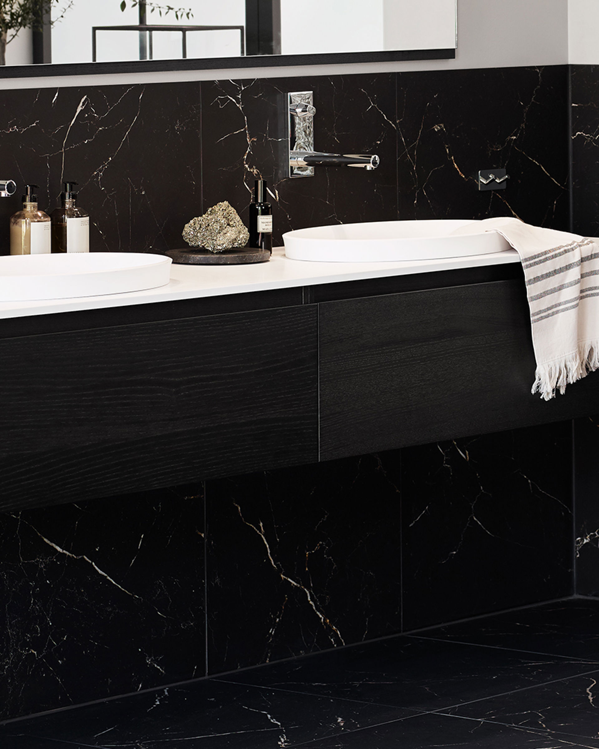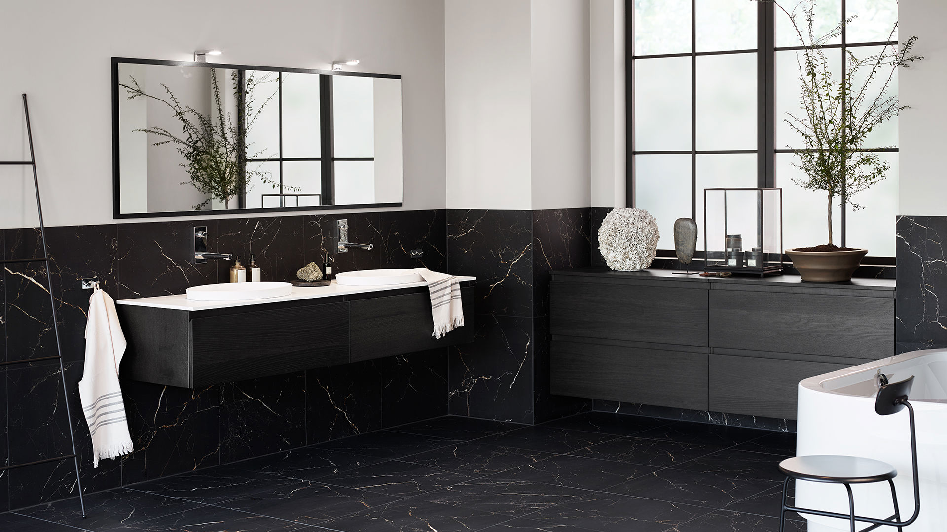 Mörka och naturnära toner för dig som vill ha ett vilsamt och generöst badrum.