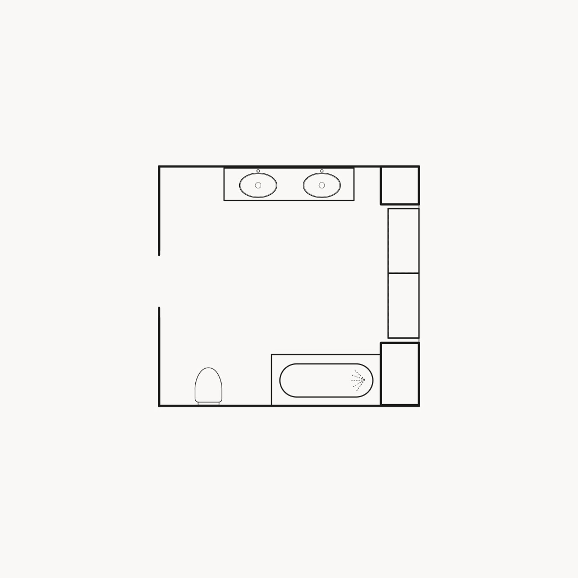 En väl tilltagen miljö i sobra färger som ger dig alla chanser att finna lugnet och hämta ny kraft. Dubbeltvättställ och vägghängda blandare ger en extra dimension – lyxigt och praktisk på samma gång. Generöst med förvaring skapar ett visuellt lugn och ett badrum som utstrålar en harmonisk balans.