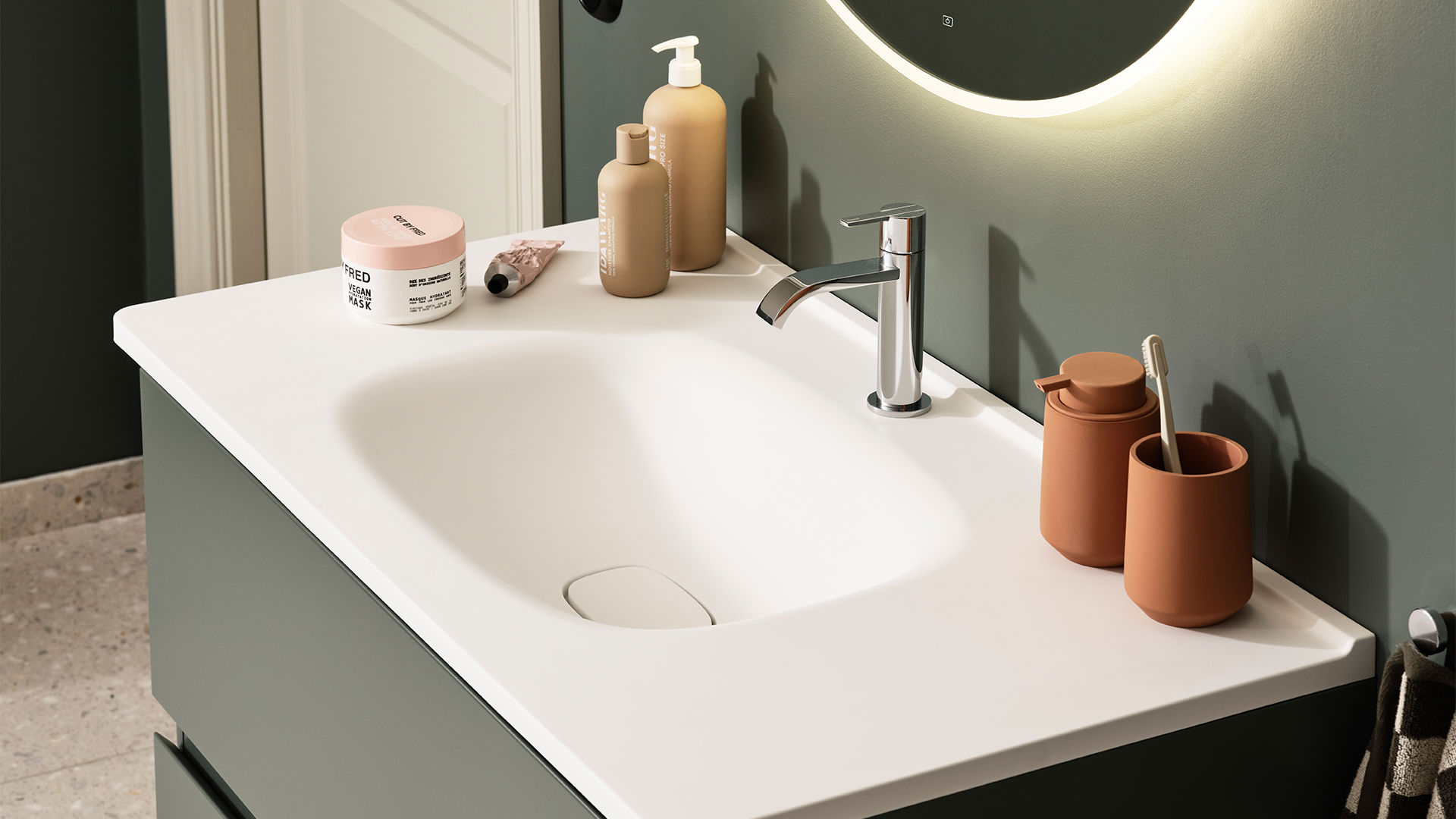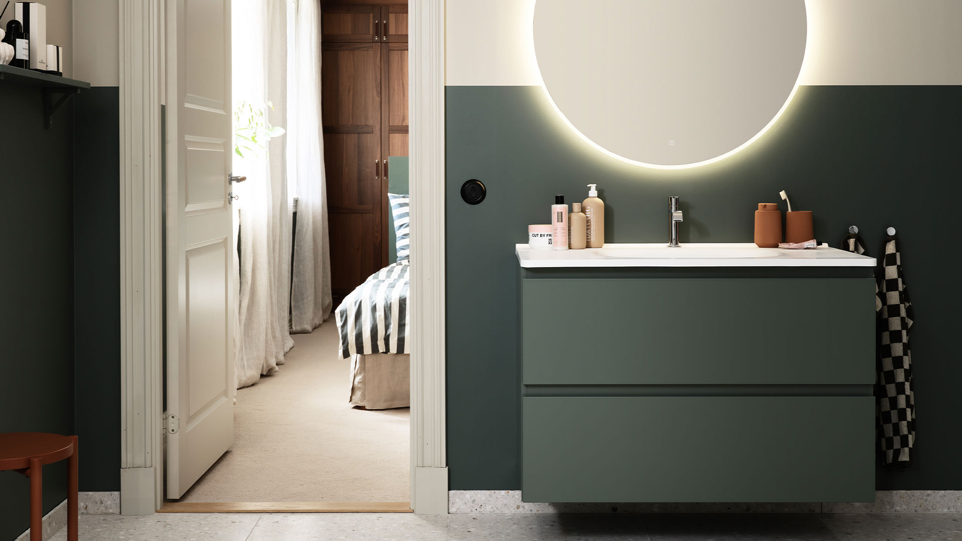 Ett rymligt badrum som ligger i anslutning till sovrum och dressingroom. Det har en genomgående färgsättning i naturnära skogsgrönt och linnebeige, tillsammans med ett ljust terrazzogolv. De stilrena linjerna har vi mjukat upp med en rund spegel och det taktila tvättstället Flow i Top Solid. Avställningsytor både på hylla och tvättställ och massor av förvaring i kommoden.