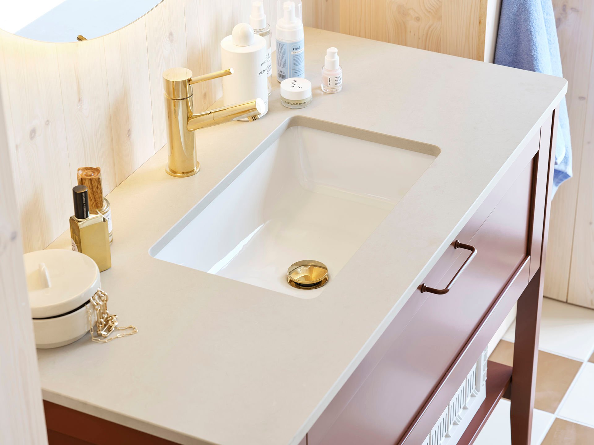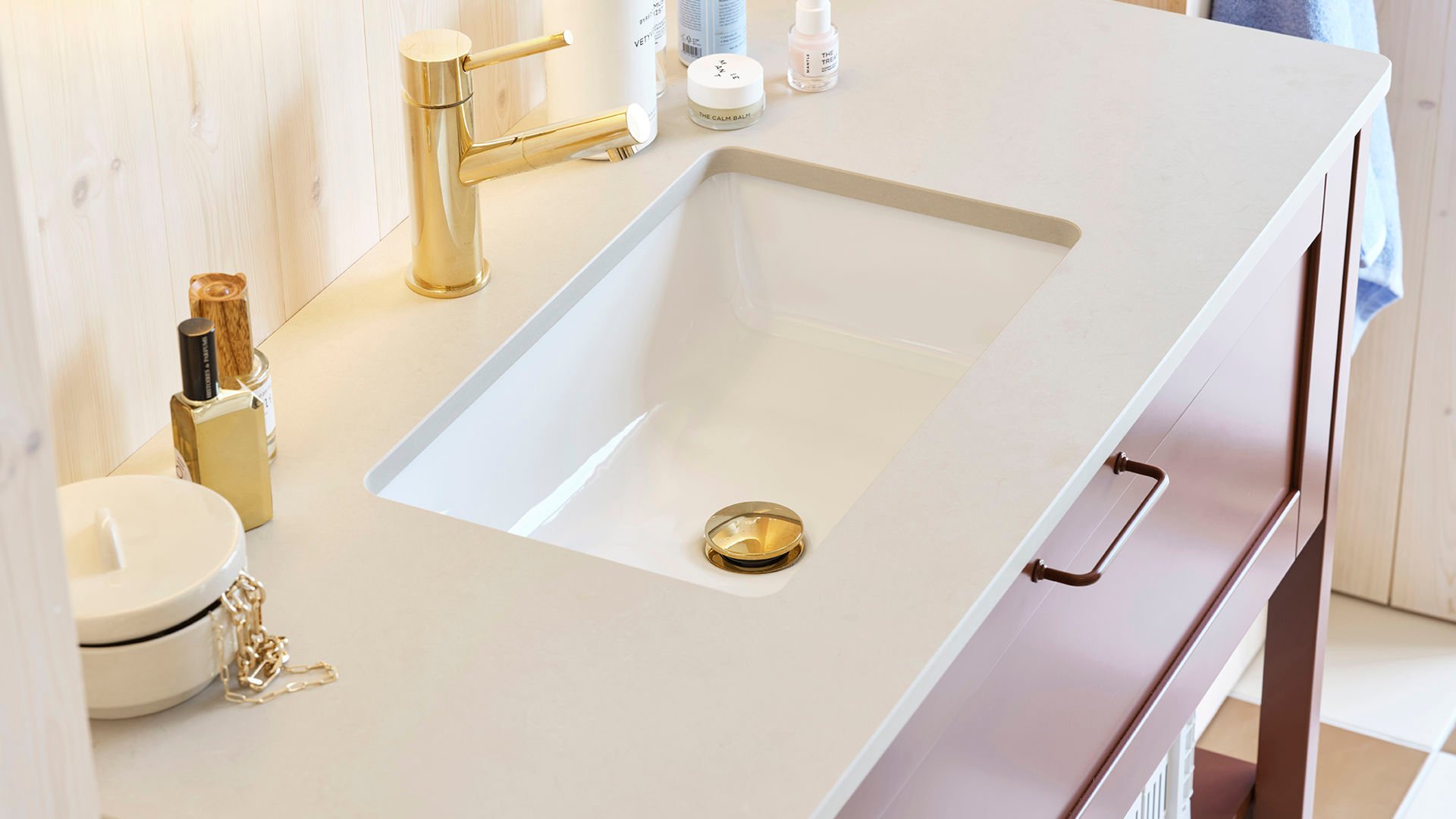 Om topplattan har fått fettfläckar av exempelvis smink kan man tvätta av den med en skursvamp utan slippåverkan och diskmedel. Skölj bort allt diskmedel med våt bomullstrasa. Torka torrt med microtrasa. Mineralkomposit liksom granit och marmor, tål hög värme. Dock inte värmechocker. Så en plötslig värmeförändring av t.ex. en varm hårfön eller plattång kan skada ytan. Använd därför alltid underlägg. För mer information läs skötselanvisningen.