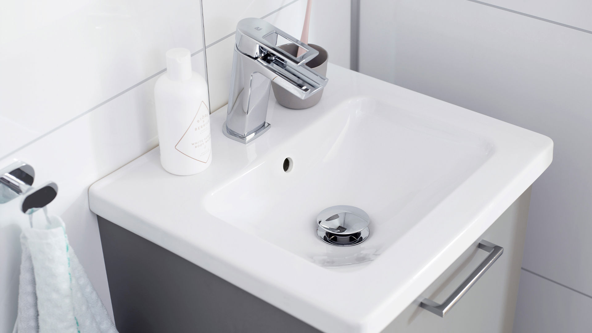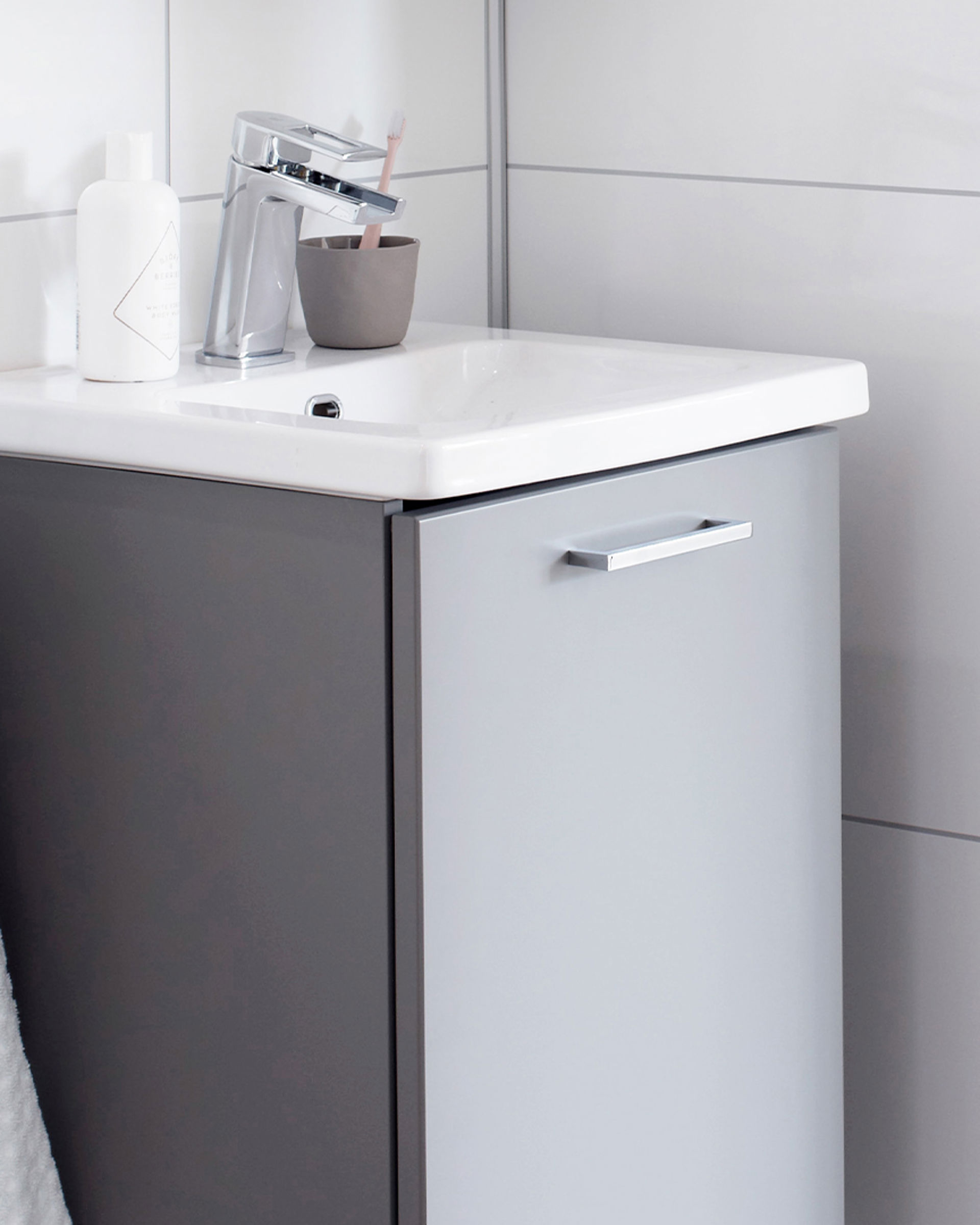 Det minsta tvättstället i serien Free är en perfekt inredning för små badrum. Det är både smalare och grundare än vad som är vanligt, vilket gör dimensionerna proportionerliga. Samtidigt är funktionen god vad gäller exempelvis avställningsytor.