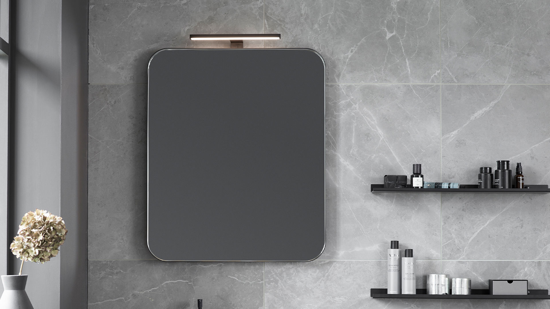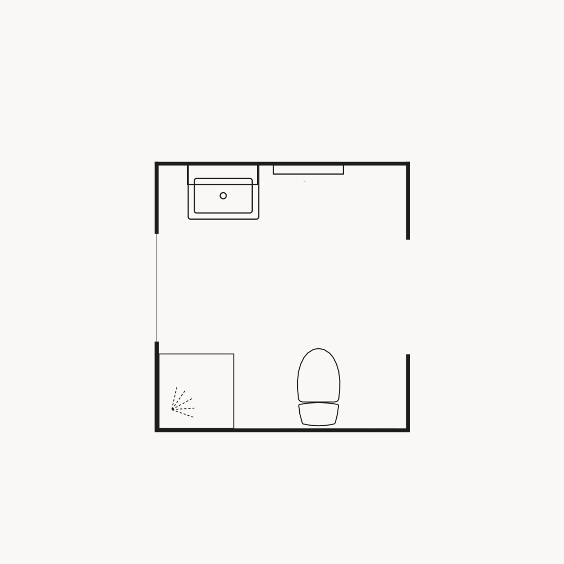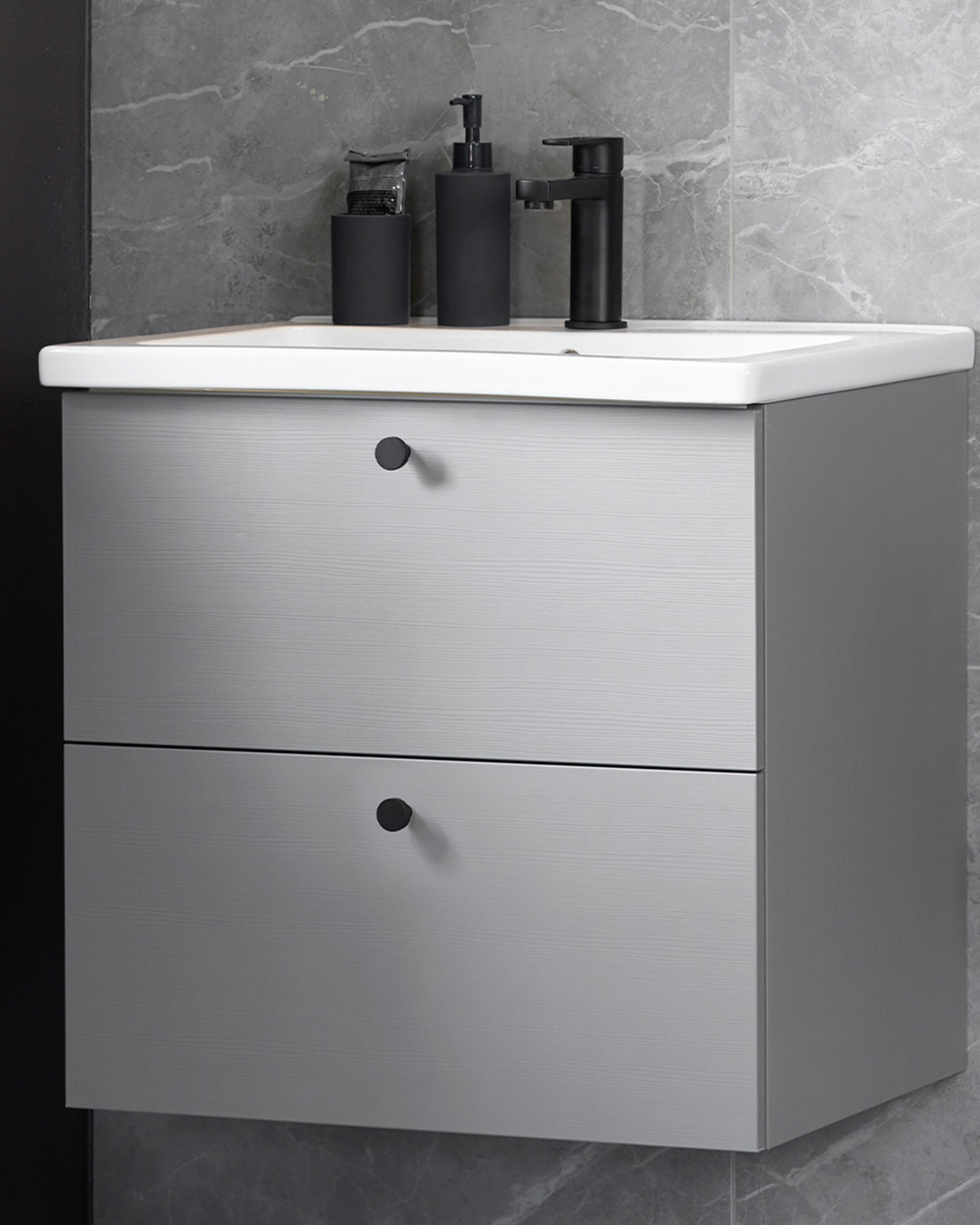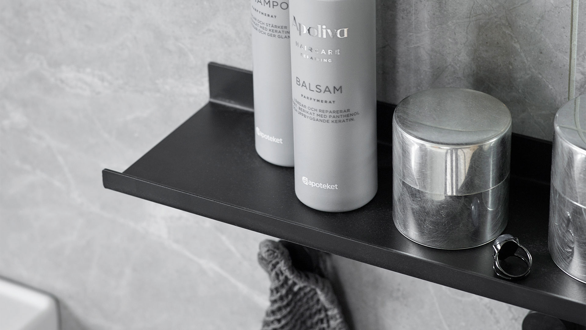 Svanenmärkt lucka i ett badrum med modernt och samtidigt tidlöst utseende. Luckan Nora har en taktil yta med trästruktur som ger liv åt rummet och skapar en fin kontrast till stenuttrycket i golv och väggar. Svarta hyllor och knoppar förstärker den gedigna känslan.