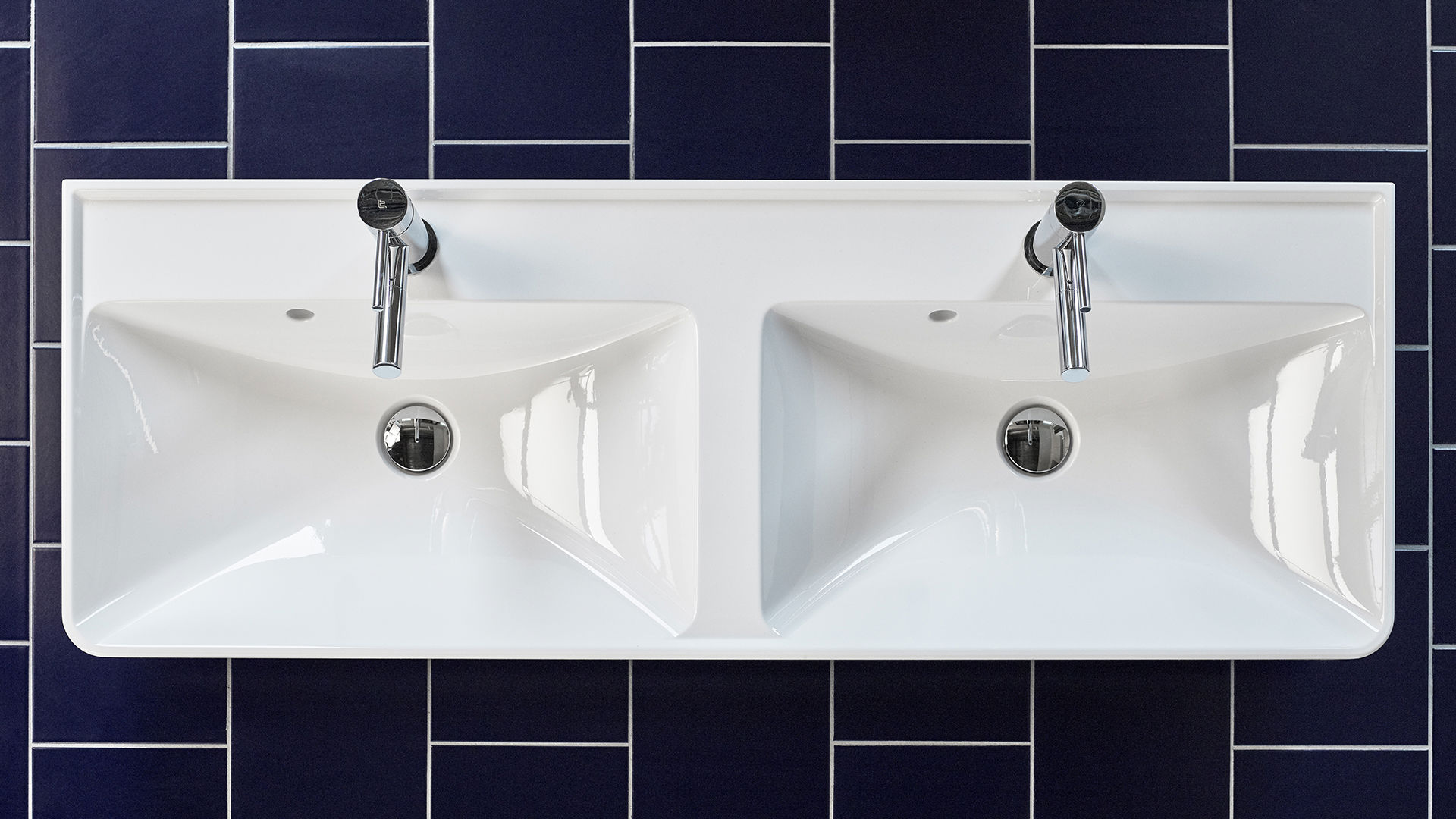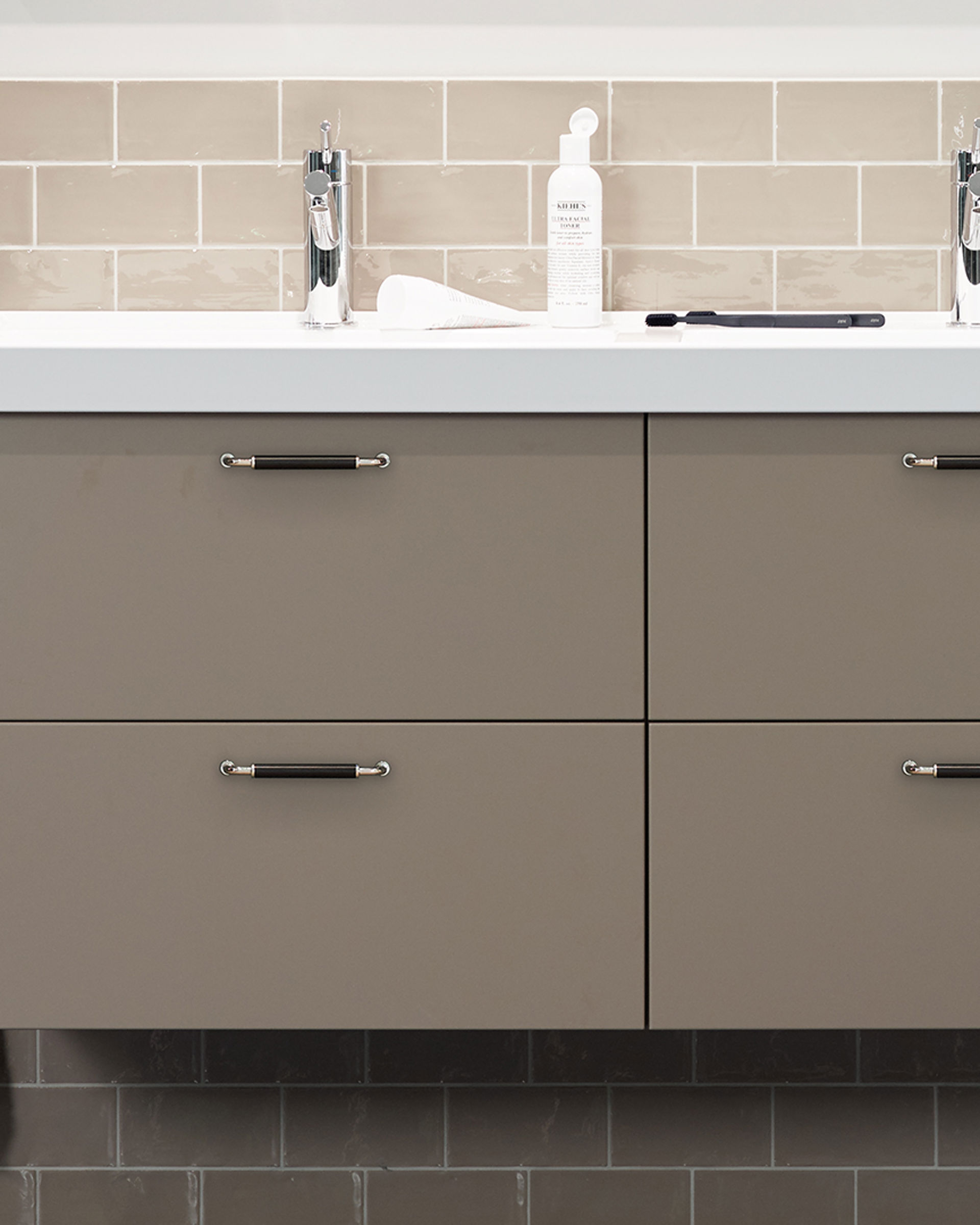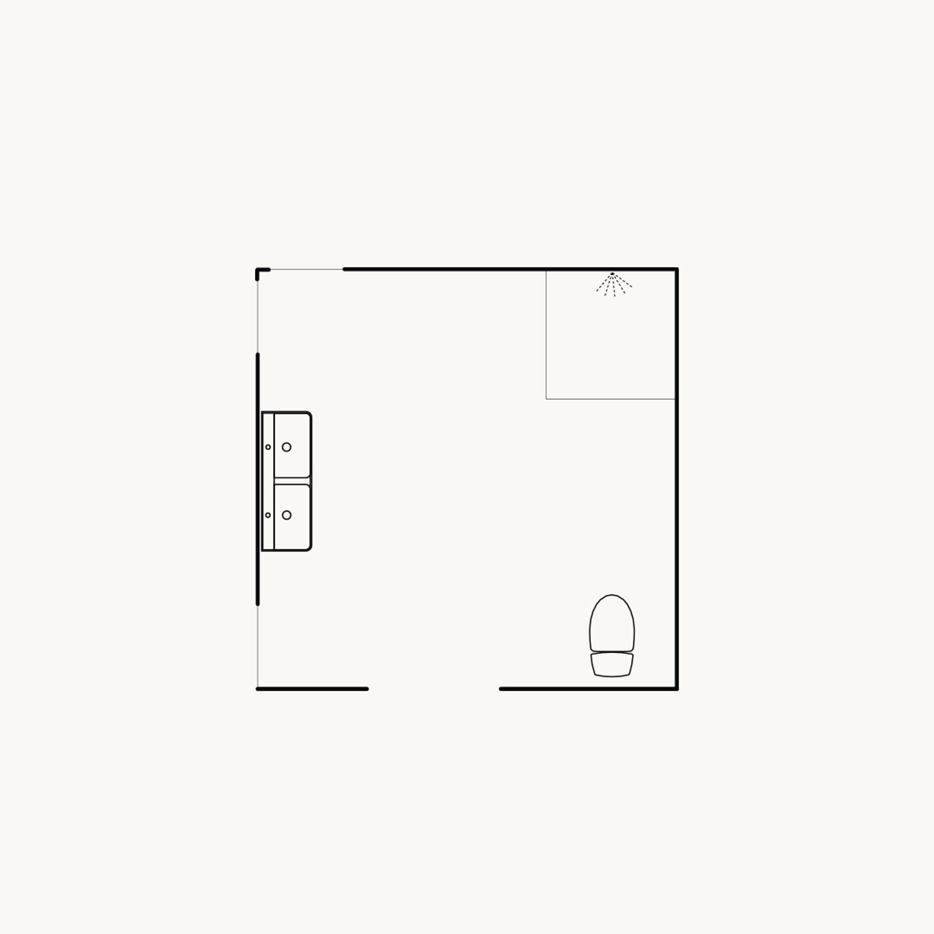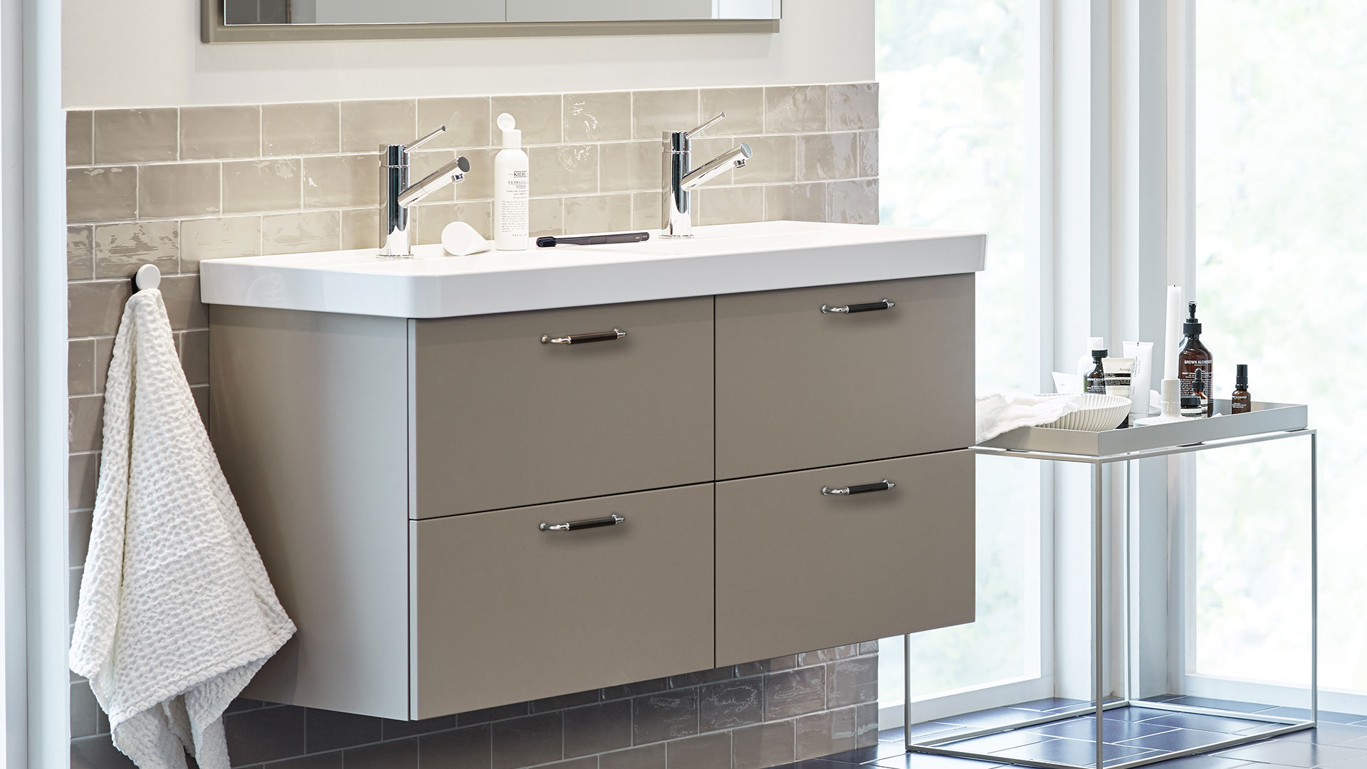 Ett badrum där det finns plats för flera. Det praktiska dubbeltvättstället är relativt kompakt och lätt att placera. Här har vi valt en ton som går i lugnt sandbeige, kombinerat med ett lite överraskande blått golv. Kaklet stannar på halva väggen för att skapa variation och dynamik. Välkommen in till hela familjen!