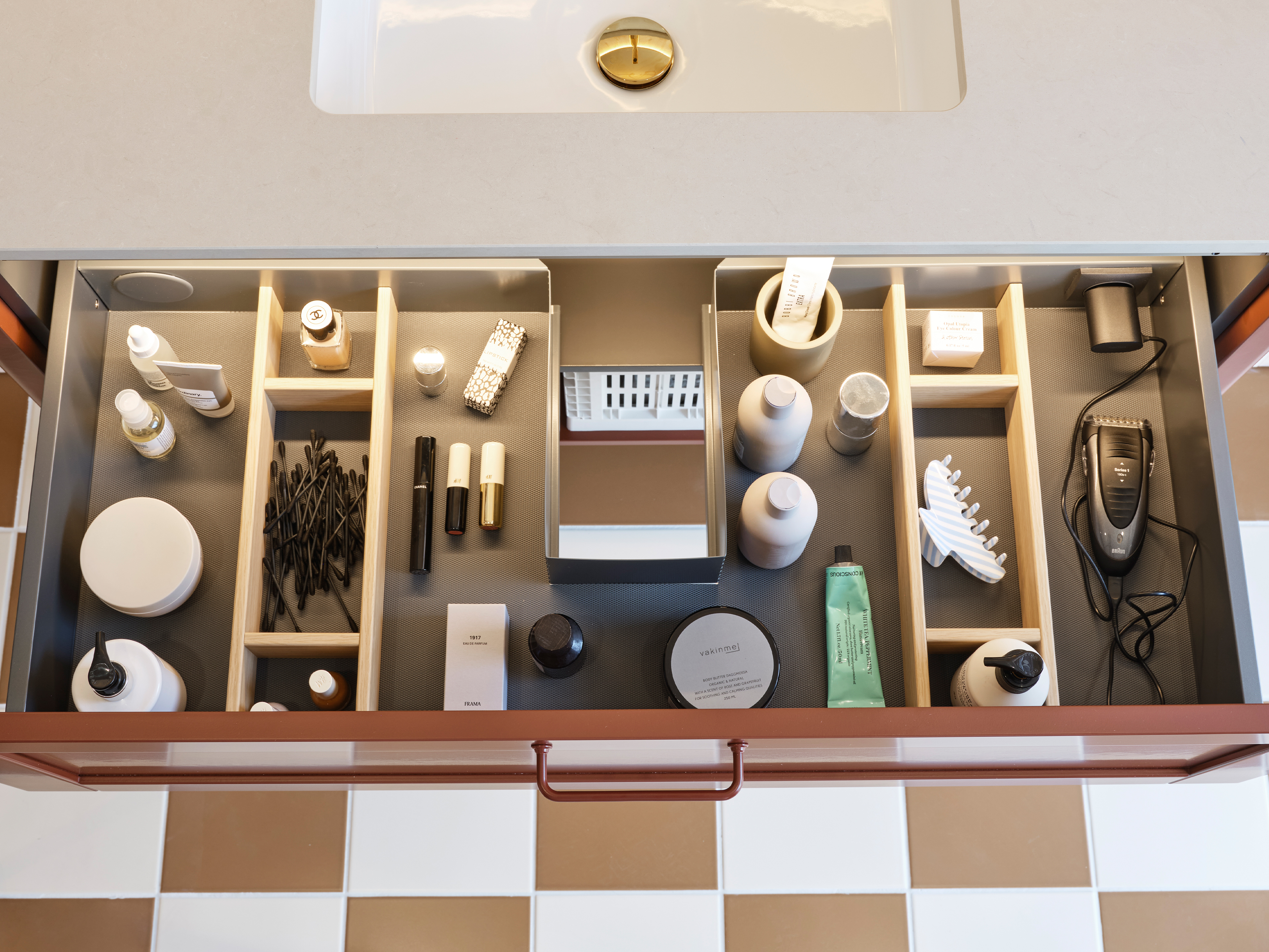 Kommod med bengavlar och två lådor med dämpning. Gummimattor ingår. Lådindelning Mejram ingår. 230V uttag går att beställa som tillval, lägg till U efter artikelnumret.
