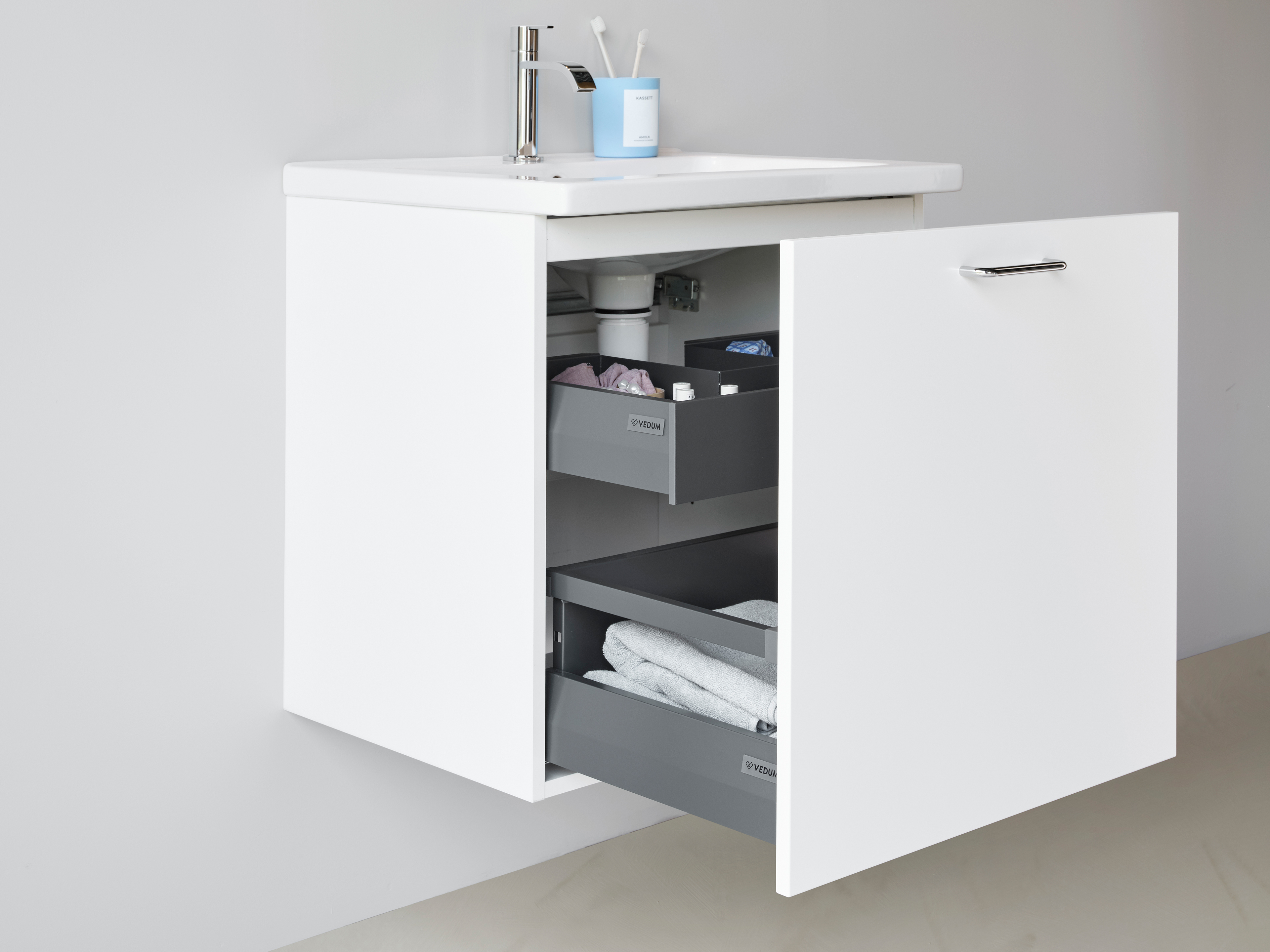 Kommod med en låda med dämpning samt en flyttbar hylla. 230V eluttag går att beställa som tillval till låda, lägg till U efter artikelnumret. Invändig låda som ersätter hyllplan går att beställa som tillval, lägg till L efter artikelnumret.