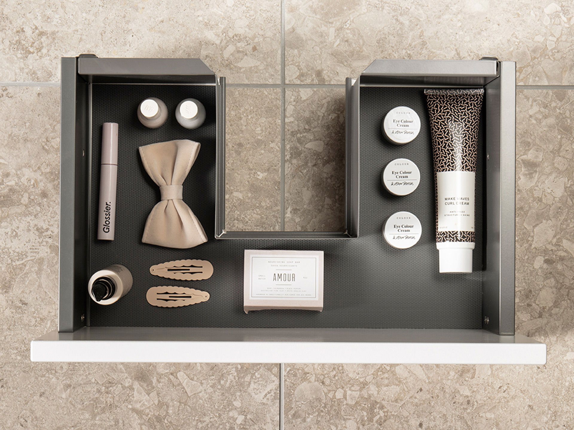 Kommod med två lådor. Gummimattor ingår. Kan fås med pushfunktion, lägg till P efter artikelnumret. 230V uttag går att beställa som tillval, lägg till U efter artikelnumret.