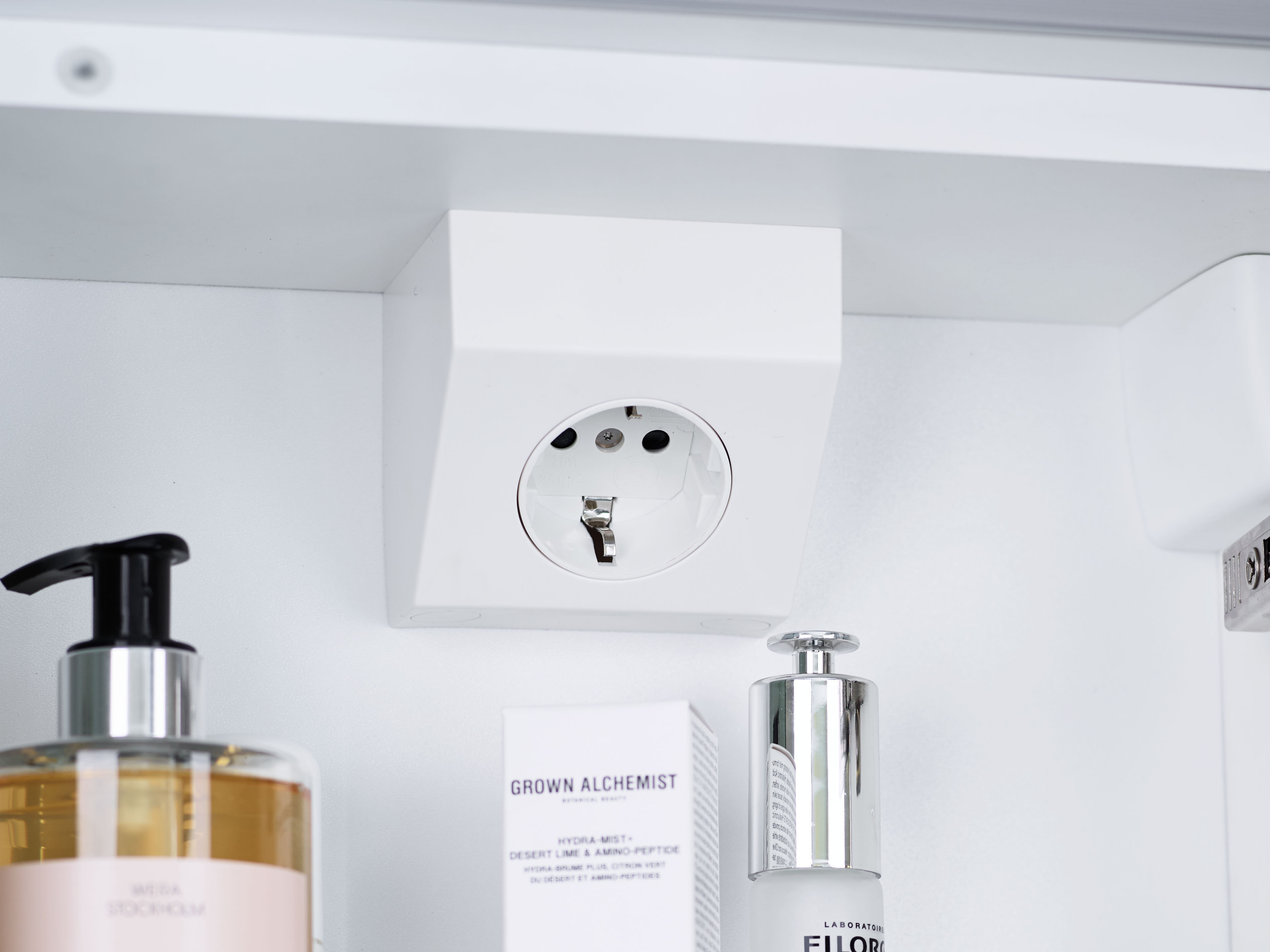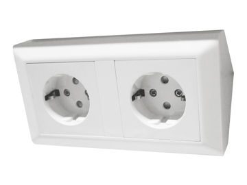 Uttagsbox med enkelt eller dubbla uttag i vit plast för montering i skåp.