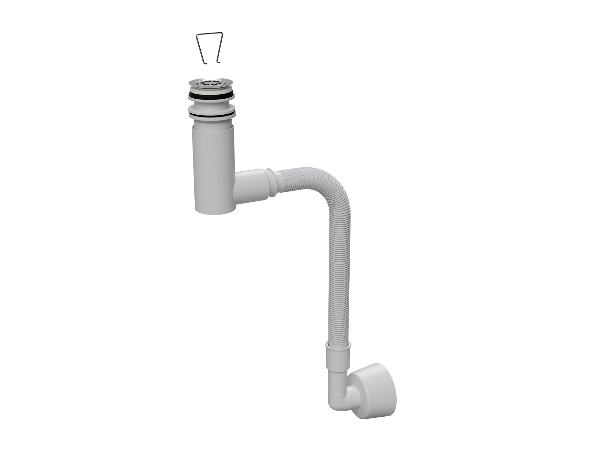 Vattenlås i vit plast inklusive bottenventil med öppen sil för tvättställ utan bräddavlopp. Ingår till tvättställ Flow.