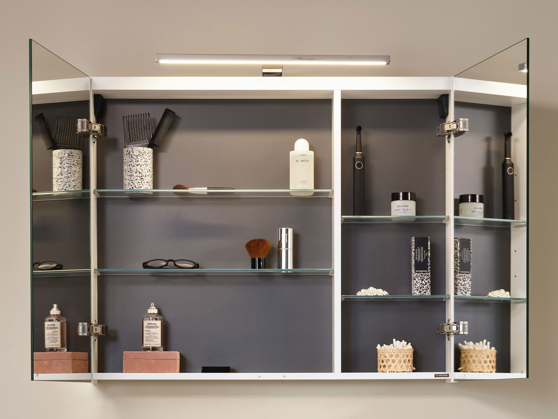 Spegelskåp Viken finns i anpassade bredder och olika utföranden. Dubbelsidiga spegelluckor med dämpning.
