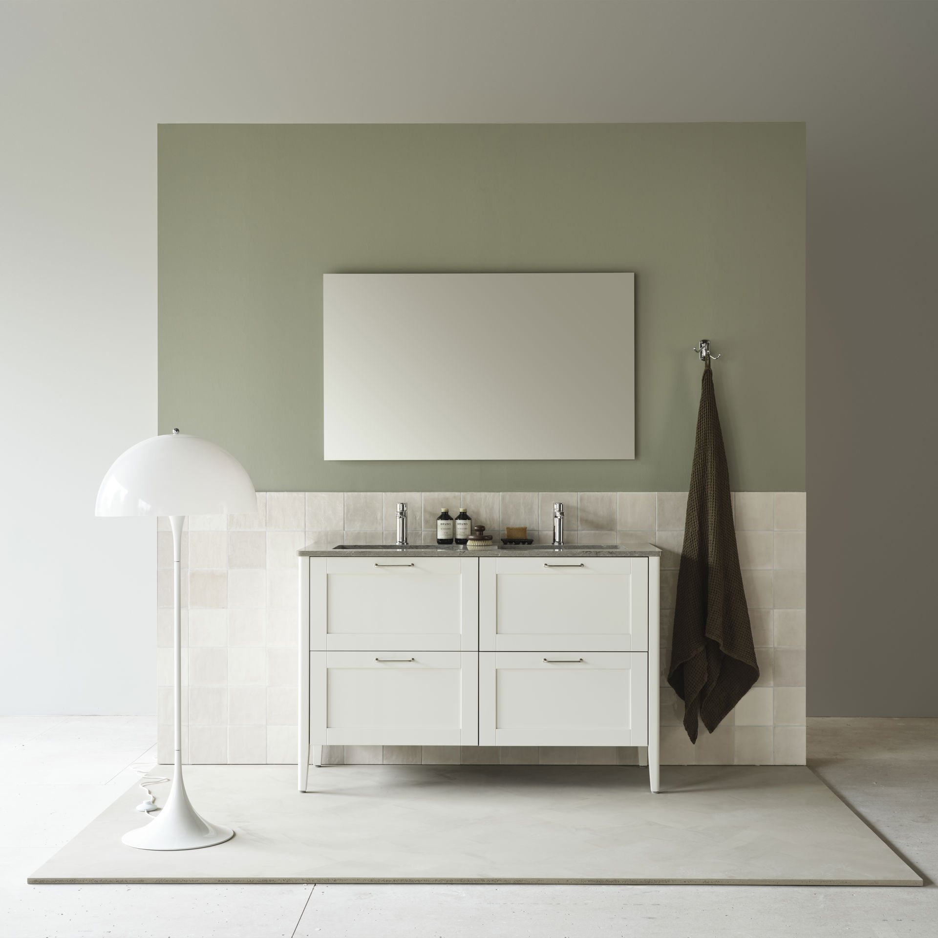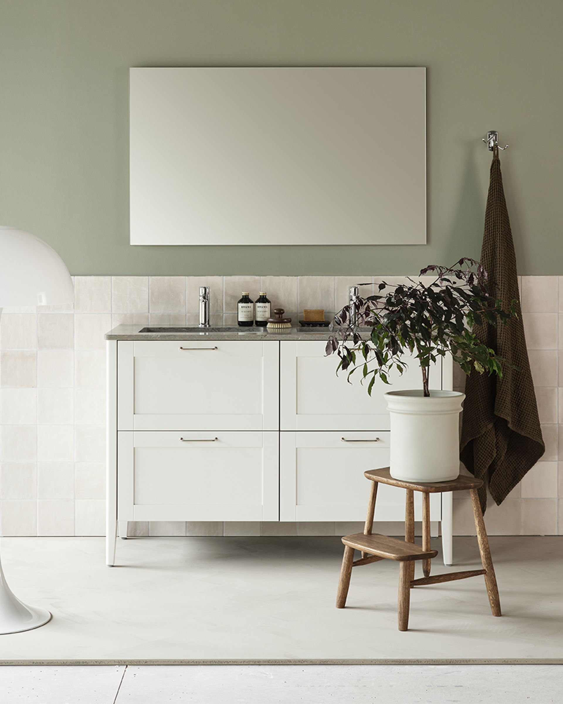 Ett tidlöst badrum som flörtar med det unga och samtida. Här skapar den starka möbelkänslan, dimgröna väggkulören och mötet mellan matta och blanka ytor en levande och varm fond till den klassiska stilen.