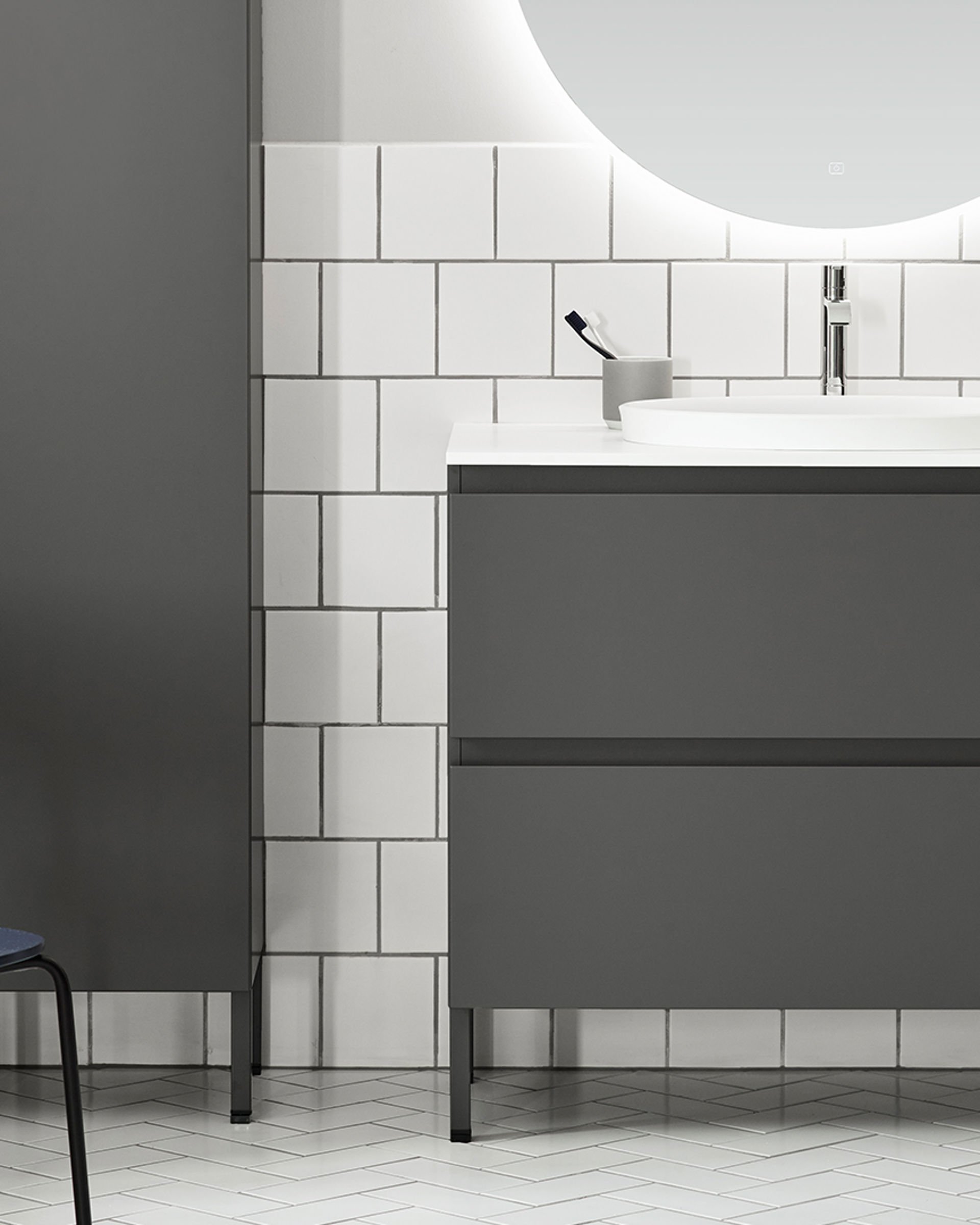 Ett badrum som är rymligt och luftigt, med högskåp och kommod som ger gott om förvaring för hela familjen. Den sobra färgsättningen skapar en lugn och harmonisk stämning, och den runda spegeln och halvkaklade väggen ger ett mjukt och varmt intryck. Mycket möbelkänsla i kombination med svala, industriella inslag.