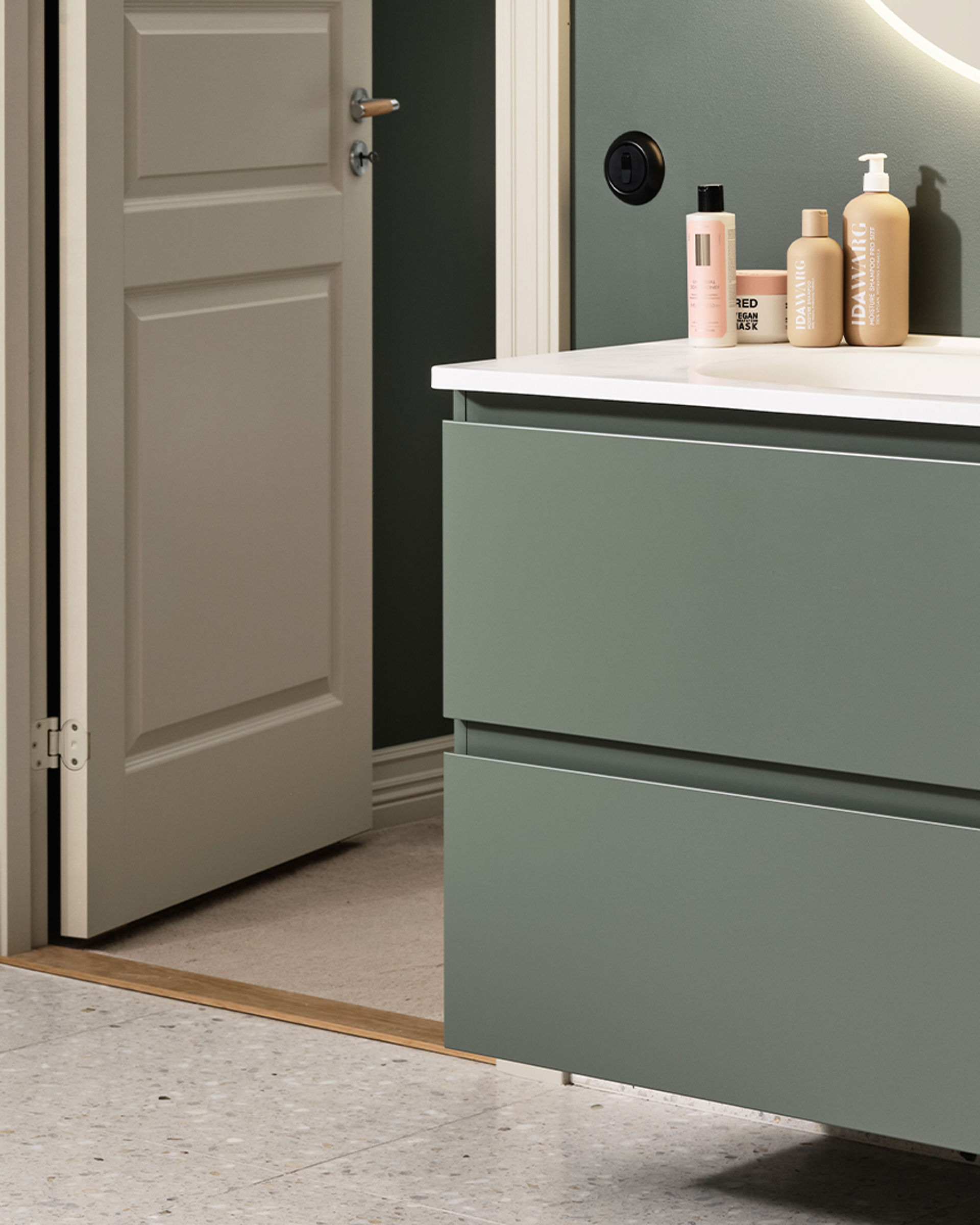 Ett rymligt badrum som ligger i anslutning till sovrum och dressingroom. Det har en genomgående färgsättning i naturnära skogsgrönt och linnebeige, tillsammans med ett ljust terrazzogolv. De stilrena linjerna har vi mjukat upp med en rund spegel och det taktila tvättstället Flow i Top Solid. Avställningsytor både på hylla och tvättställ och massor av förvaring i kommoden.