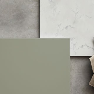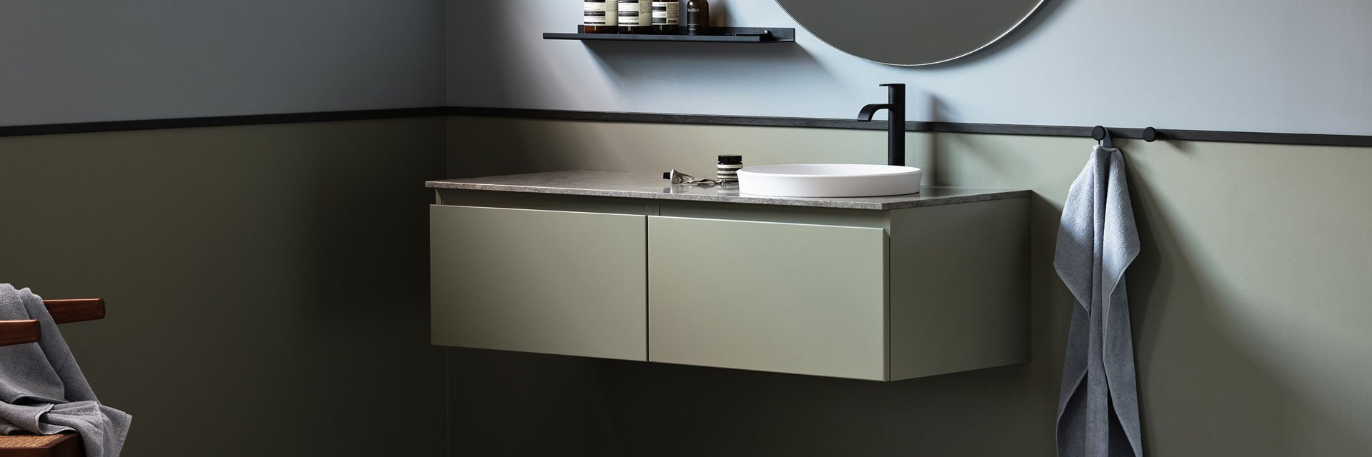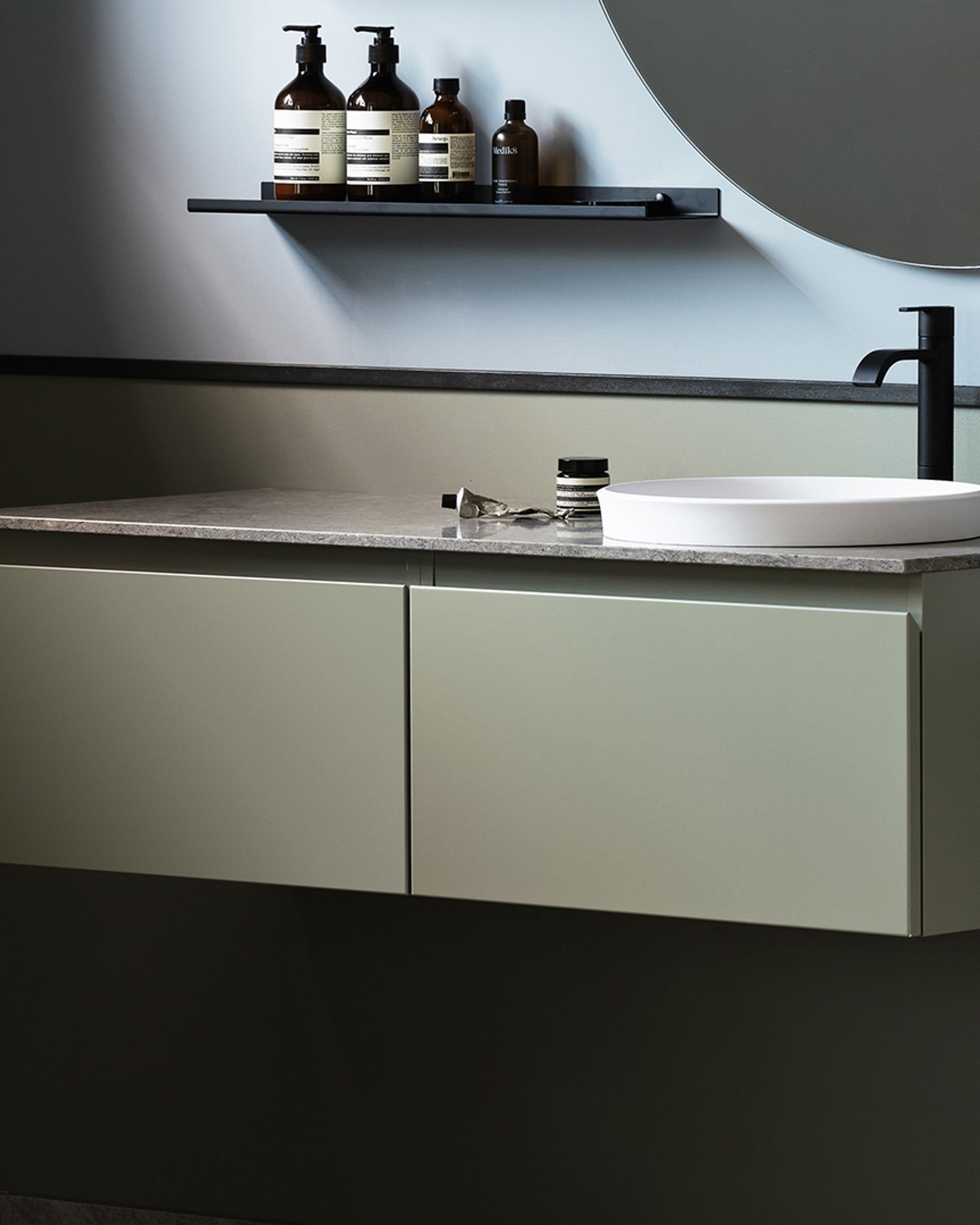 Ett ljust och luftigt badrum med en färgkombination där himmelsblått möter grönska. Den taktila topplattan i kompositstenen Turbine Grey passar fint till det seminedfällda tvättstället Zone. Här får du generösa avställningsytor vid handfatet, en stor rund spegel för att skapa extra rymd och luftighet i badrummet – och hyllor i svart metall som ger badrummet karaktär.
