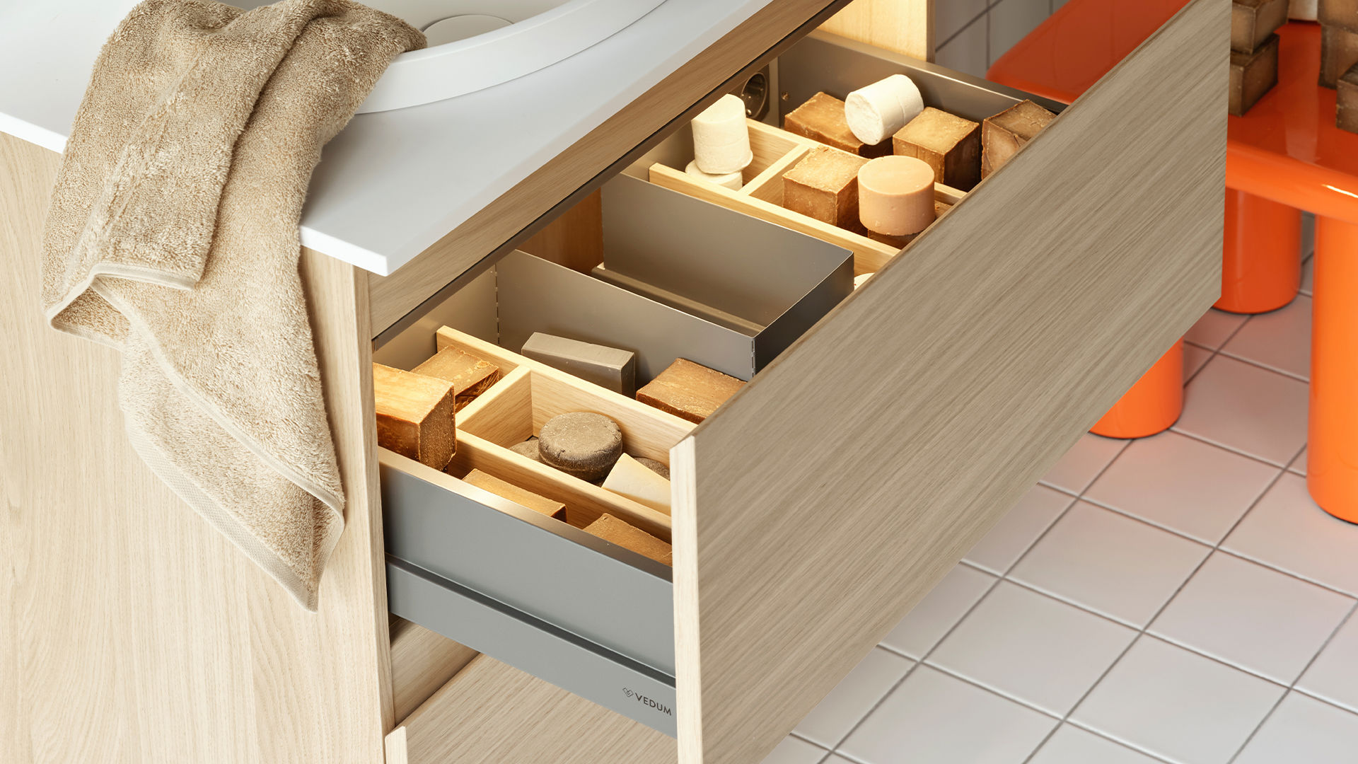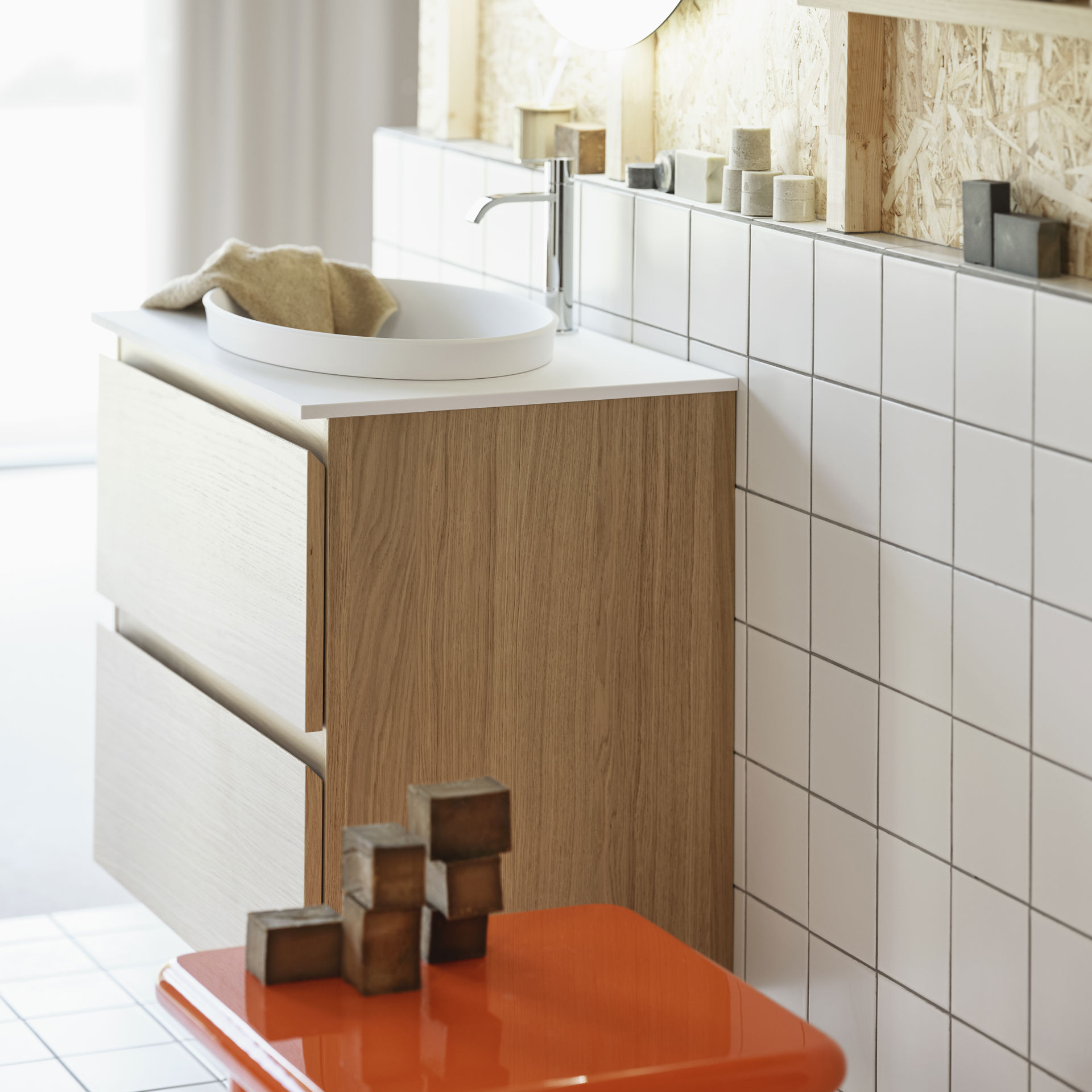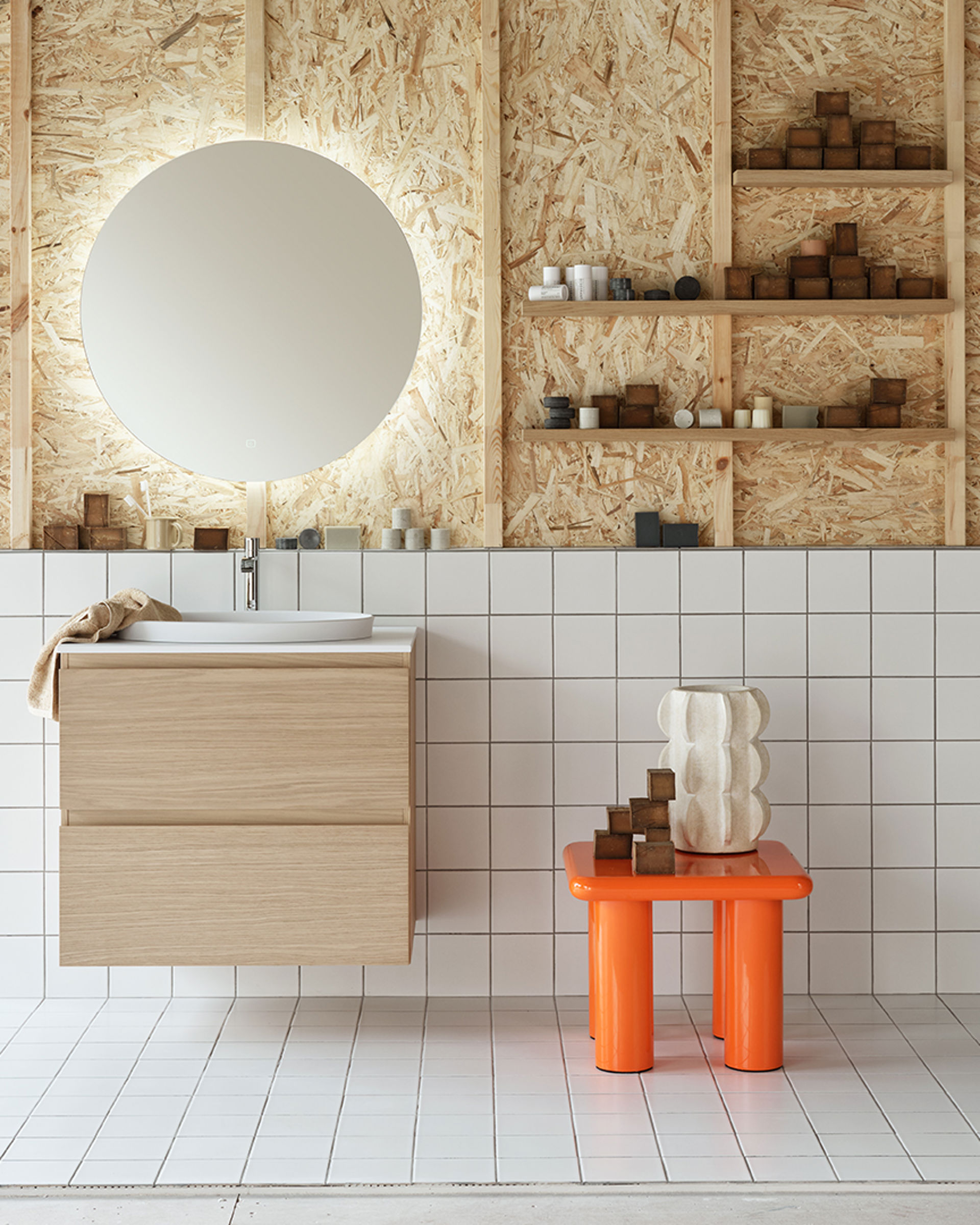 Ett ljust och avskalat badrum där den skandinaviska stilen fått accessoarer som tillför värme, lekfullhet och kulör. Trärena ytor tillsammans med den runda spegeln skapar ett mjukt, naturnära och dynamiskt uttryck.