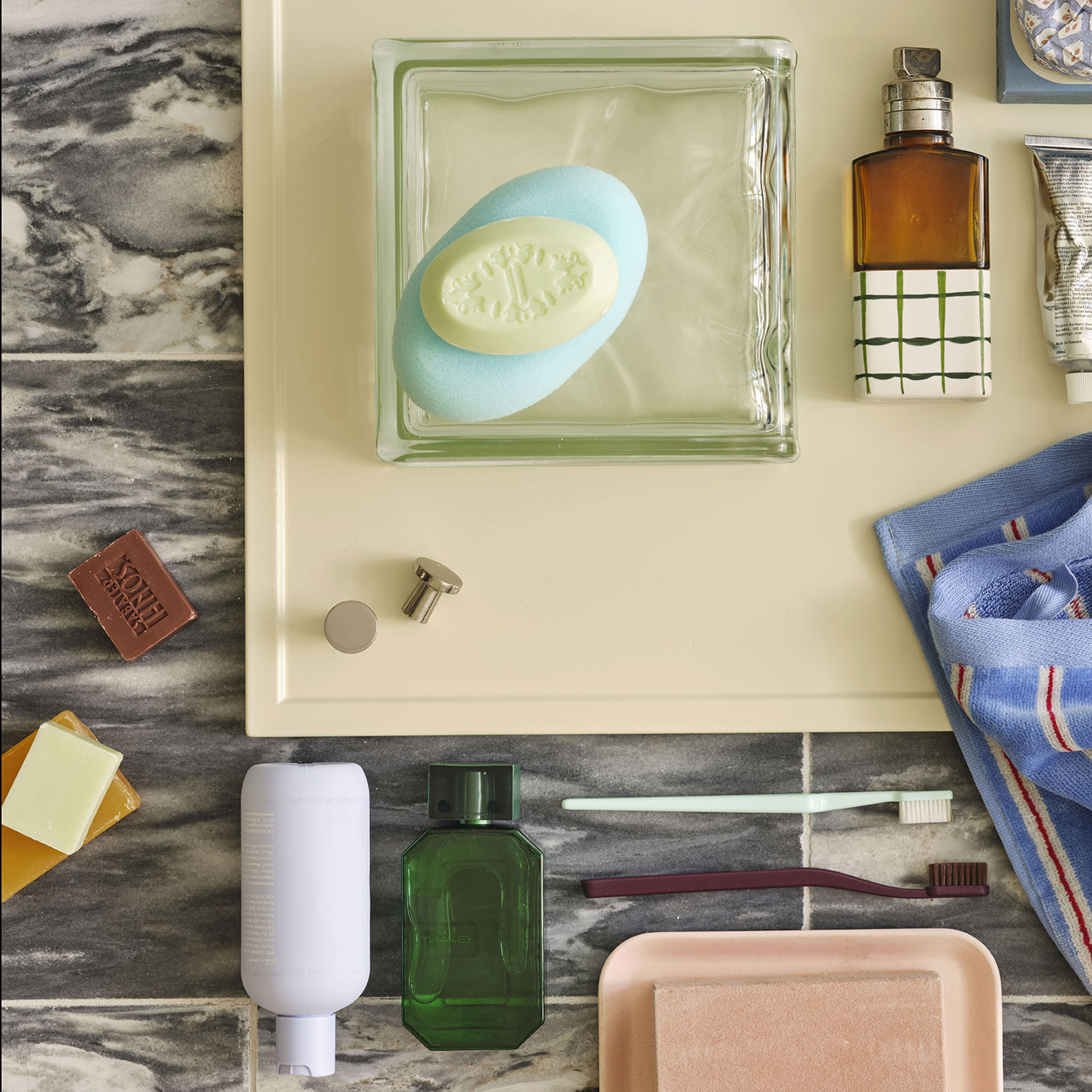 Ett soligt badrum med den eleganta luckan Thea i vår nya kulör cremegul. Med Free i den nya bredden 800 mm kombineras det lätta uttrycket med generösa avställningsytor. Glasblock släpper in ljus och spegeln med de rundade hörnen bidrar till att miljön känns mjuk och inbjudande. På golvet skapar robust natursten med ursprung i Norges storslagna fjordlandskap en vacker kontrast.