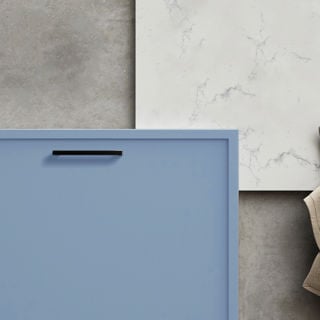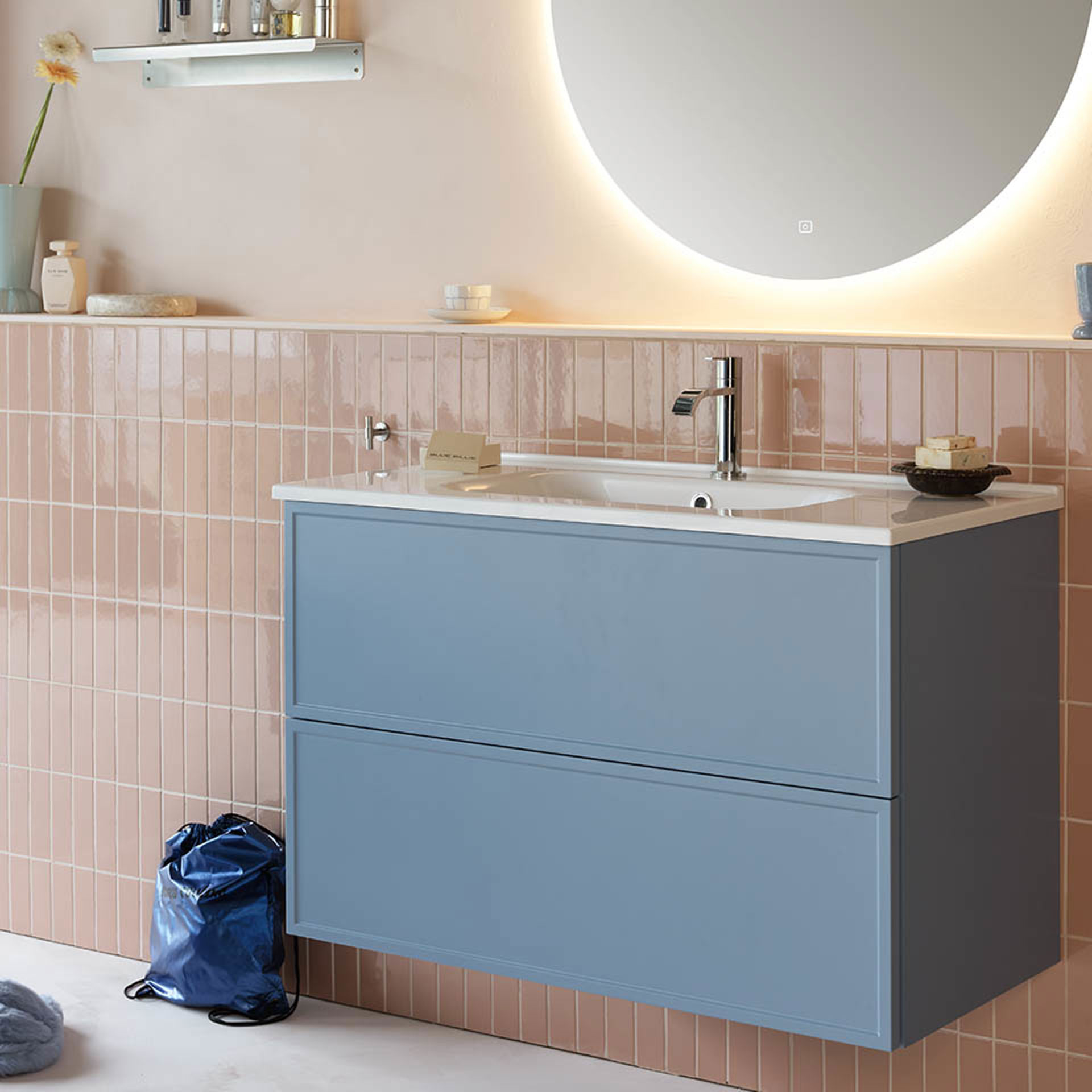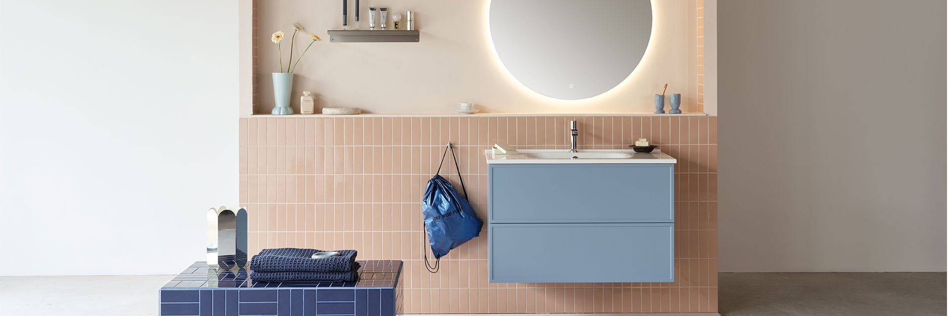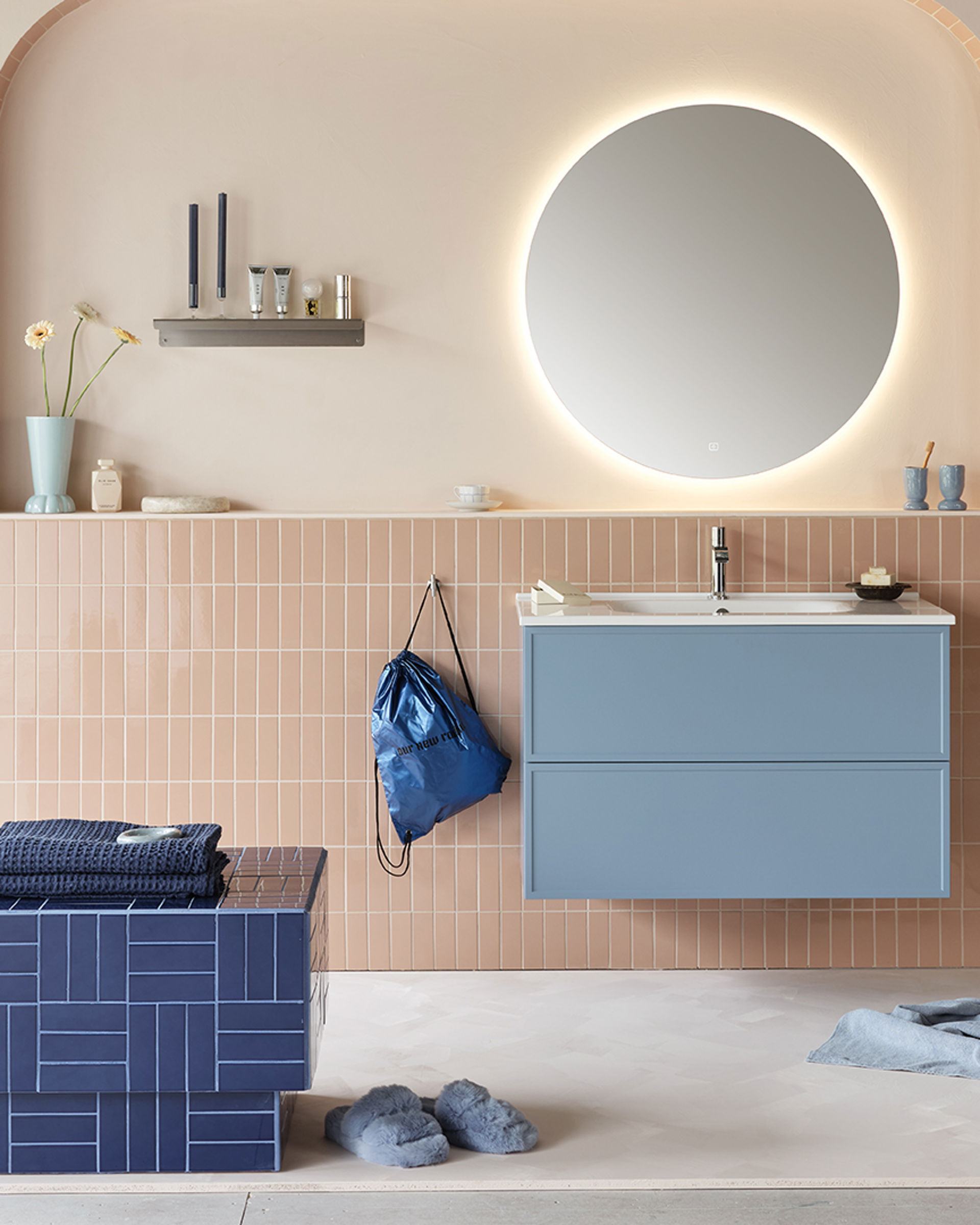 Det här badrummet tar fasta på det lättsamma och lekfulla för att ge den moderna stilen en mjukare ton. Vår nya himmelsblå kulör och det milda persikofärgade kaklet gifter sig harmoniskt och det rundade valvet ger miljön en fin inramning.