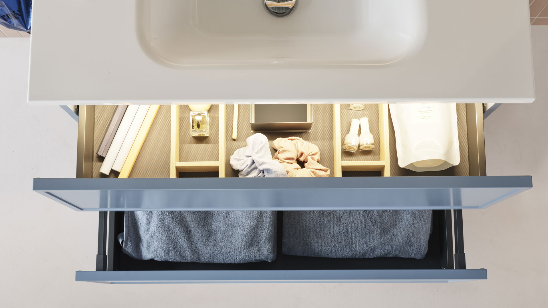 Ett modernt badrum med rundade former och harmoniska kulörer