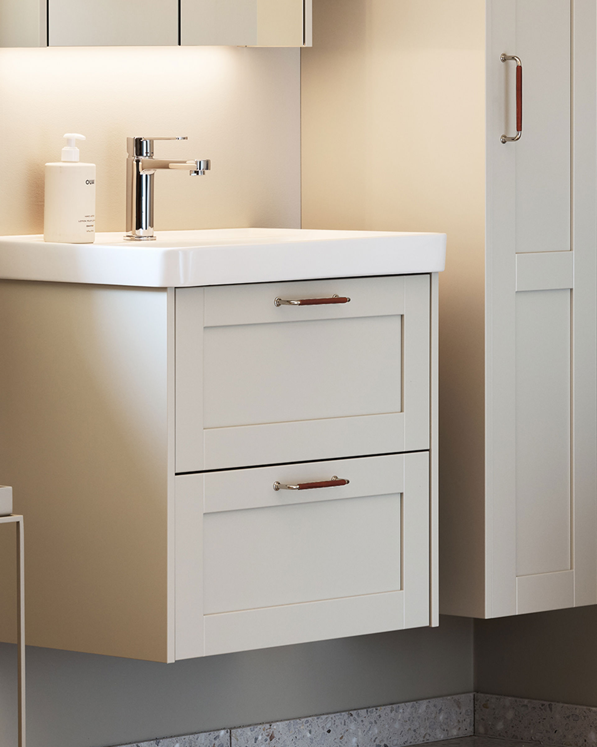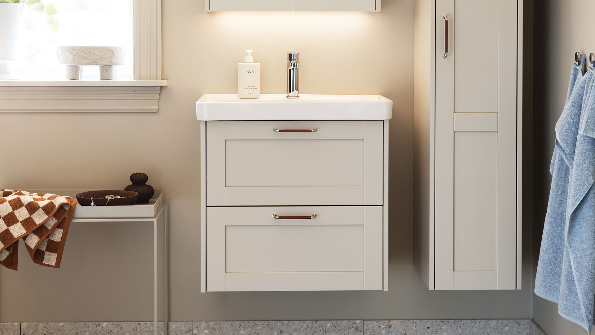 Moderna linjer med fina klassiska detaljer. I det här lilla badrummet med mjuka toner har vår ramlucka Edit fått ett klassiskt uttryck i kombination med inramningen Frame och det stilrena tvättstället Mezzo. Spegelskåpet Ramsen ramas in på samma sätt som kommoden och skapar tillsammans med lådor i kommod och högskåp maximalt förvaringsutrymme på liten yta.
