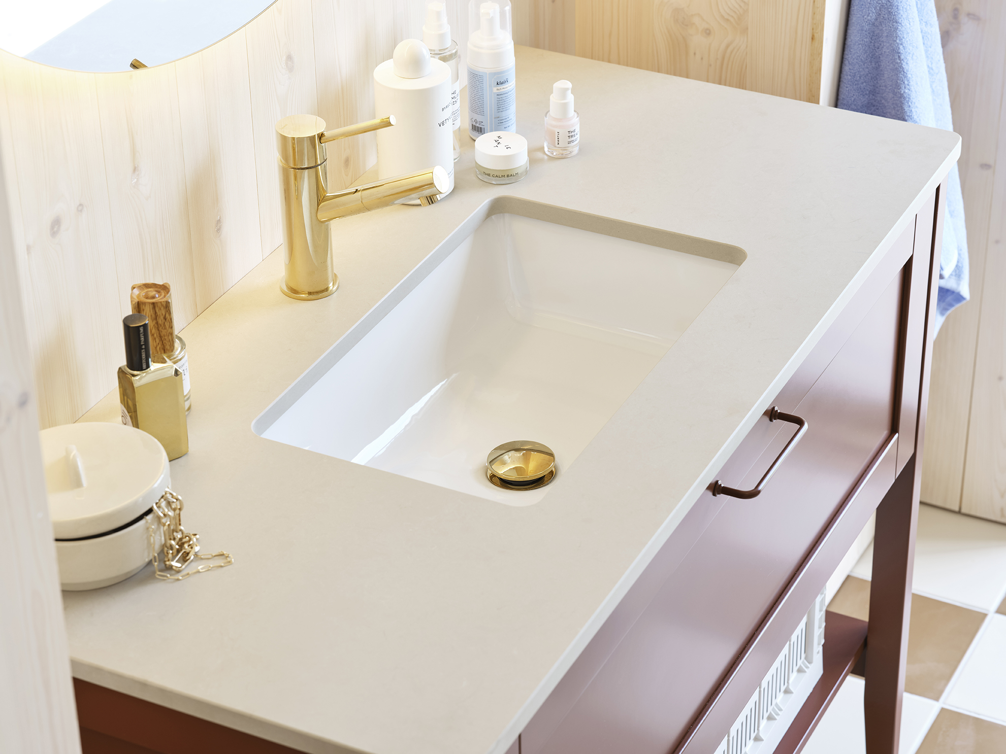 Om topplattan har fått fettfläckar av exempelvis smink kan man tvätta av den med en skursvamp utan slippåverkan och diskmedel. Skölj bort allt diskmedel med våt bomullstrasa. Torka torrt med microtrasa. Mineralkomposit liksom granit och marmor, tål hög värme. Dock inte värmechocker. Så en plötslig värmeförändring av t.ex. en varm hårfön eller plattång kan skada ytan. Använd därför alltid underlägg. För mer information läs skötselanvisningen.