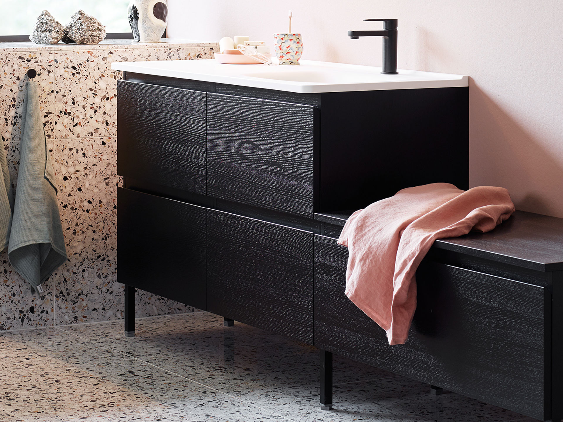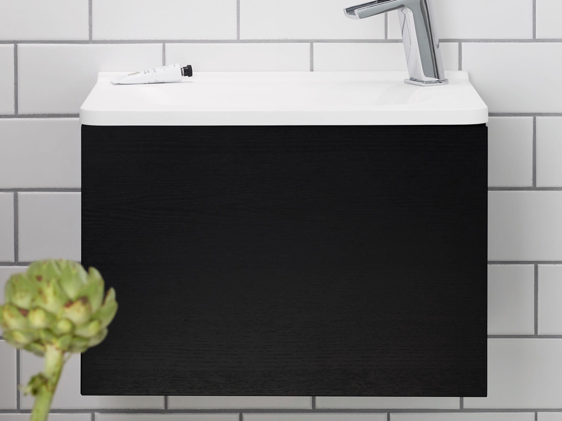 Naturkänsla med dramatiska toner.Fanerad svartmålad ask är inspirerad av naturen och skapar en taktil träkänsla. Faner är ett levande material och har alltid ett unikt utseende. Svartmålad ask passar särskilt bra med andra dramatiska färger – och för dig som vill ha en inredning som går i en modern och elegant stil. En elegant och dramatisk kulör.