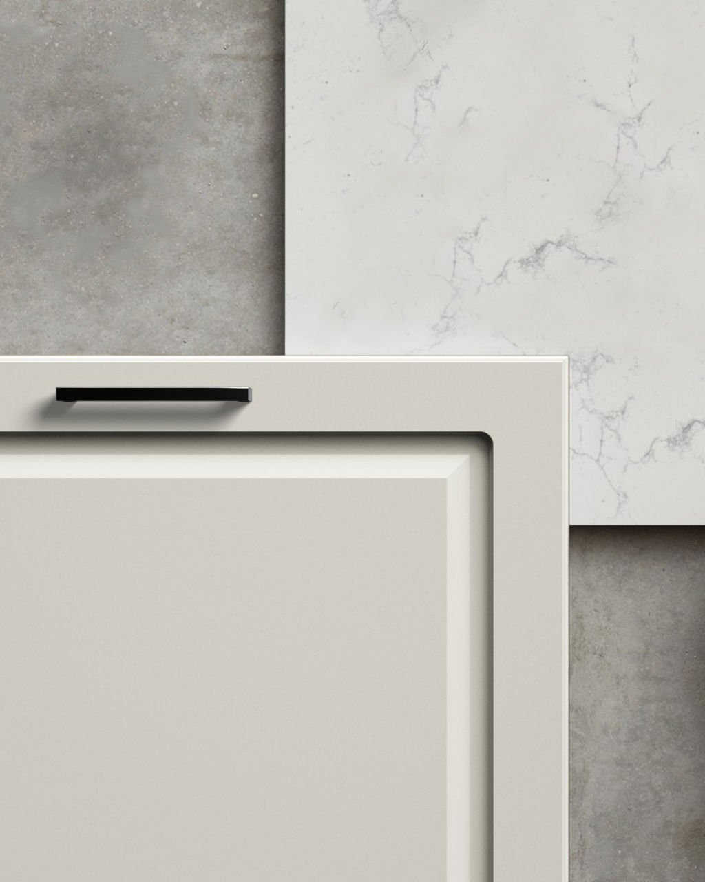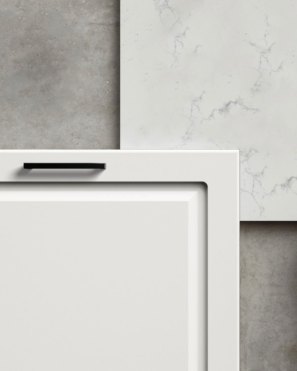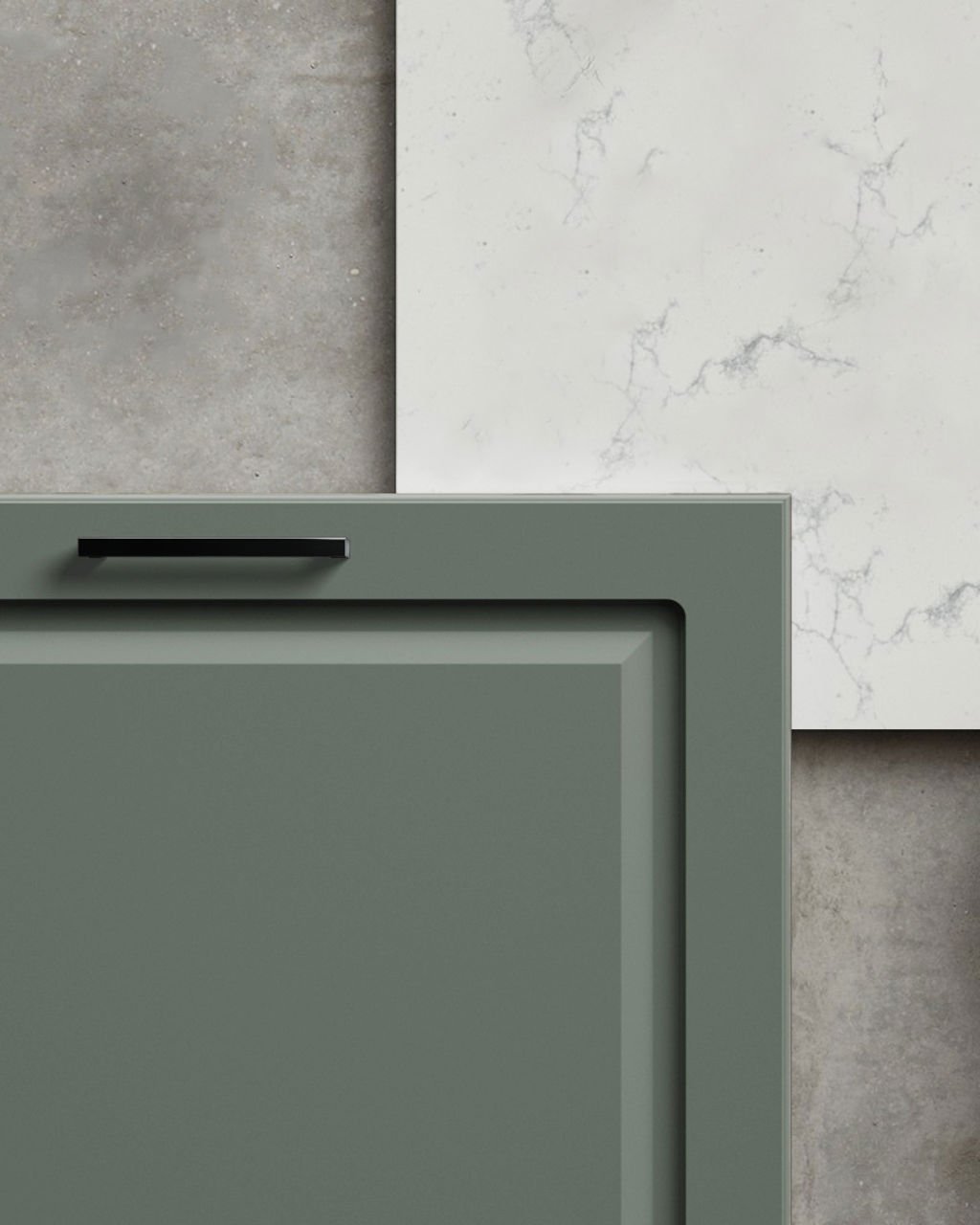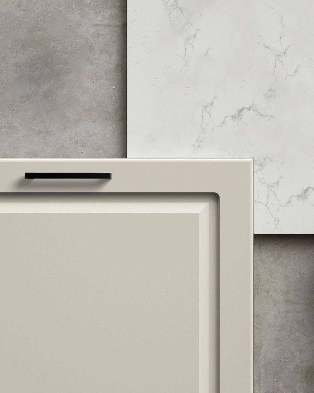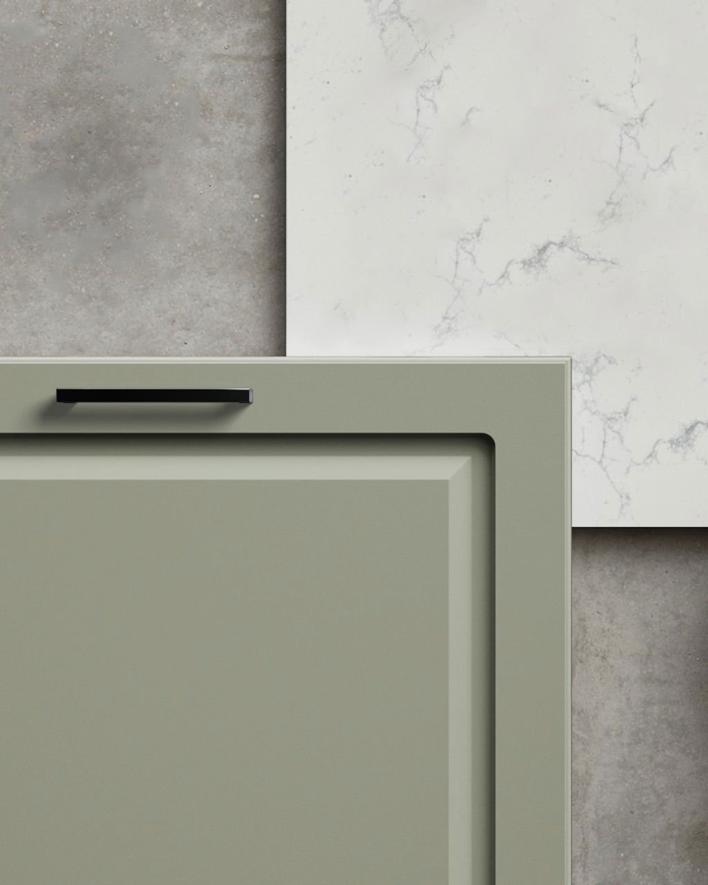 Målad lucka 19 mm MDF-board med fräst profil och svagt rundad kant. Finns också i vitrin med klarglas till högskåp. Kan fås i vitt eller i någon av våra kulörer.