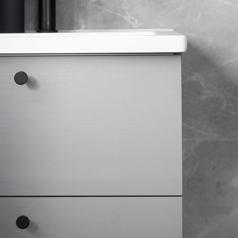Melaminbelagd lucka av 16 mm fukttrög MDF-board. Grå trästruktur. Kantlist i ABS. Liggande trämönster på lådfronter och stående på luckor. Luckan är Svanenmärkt.