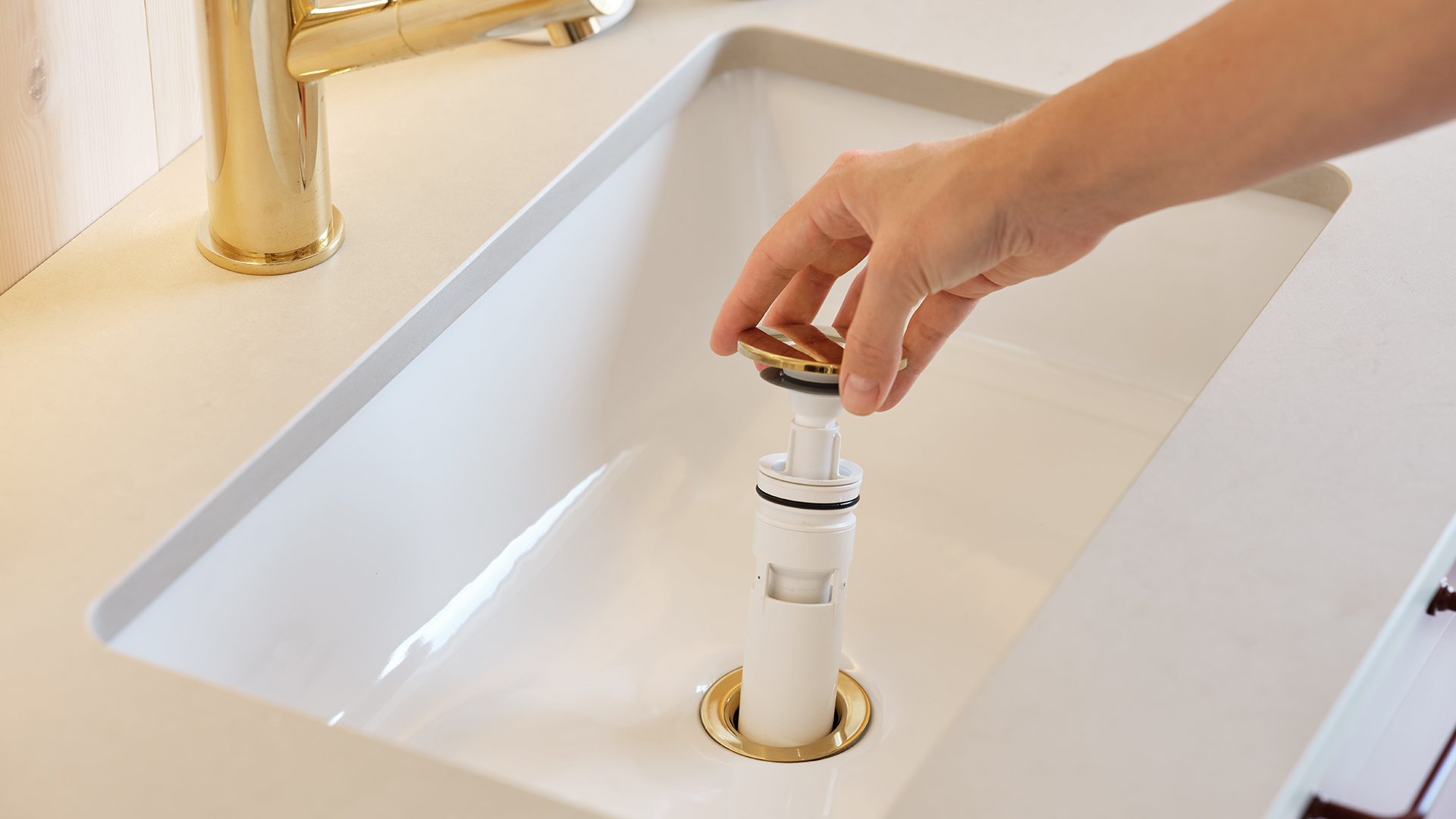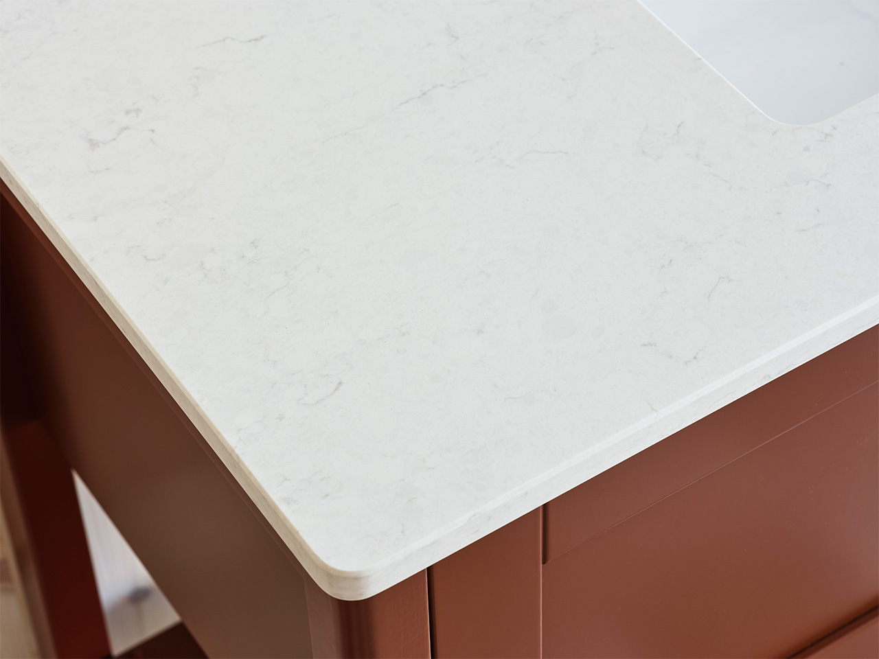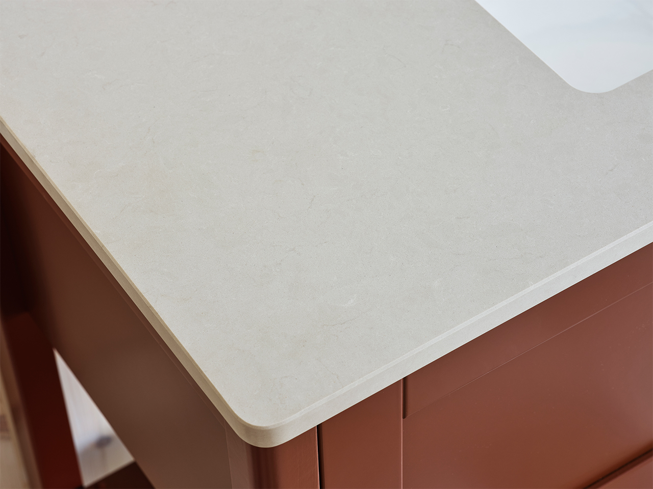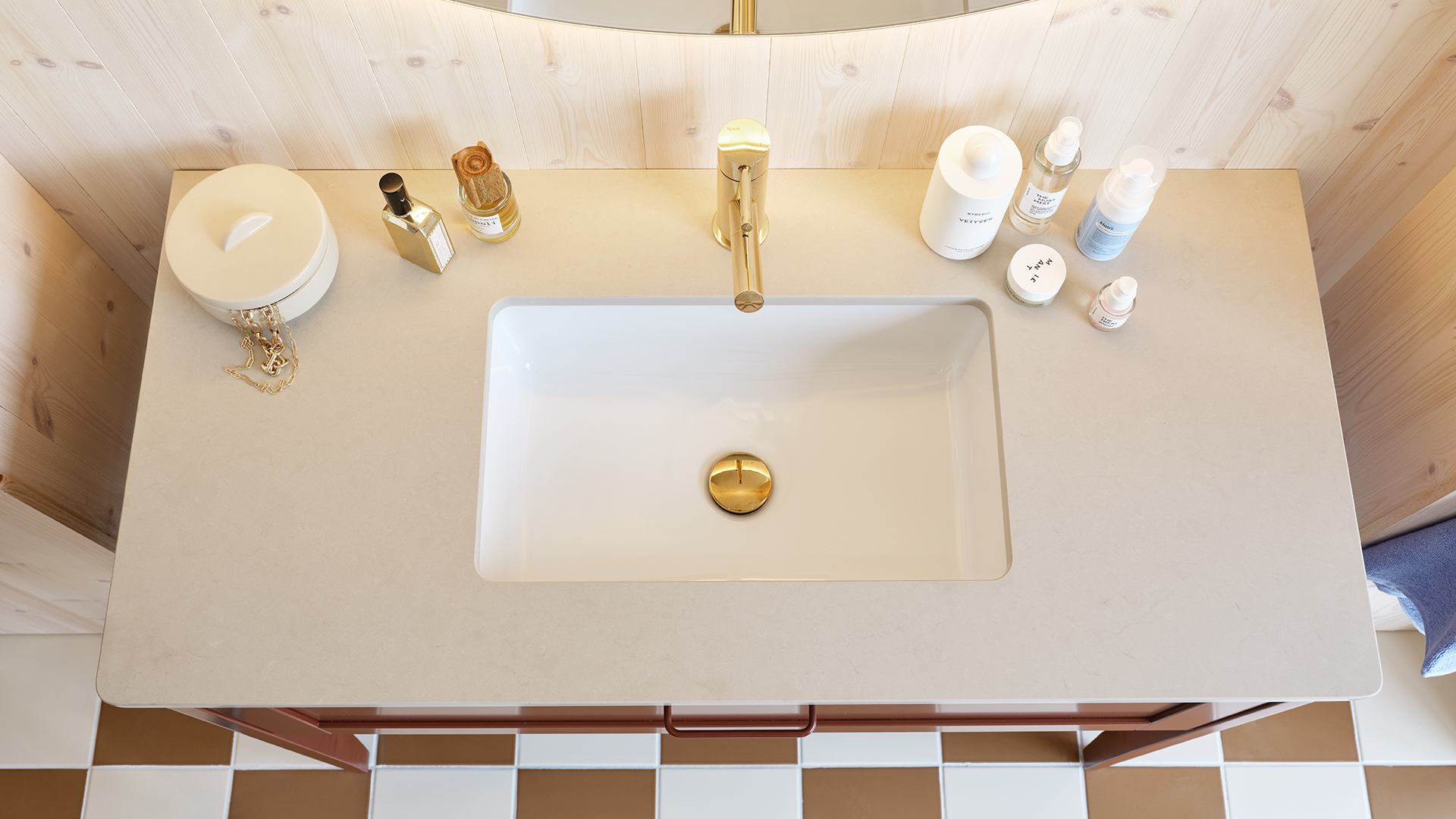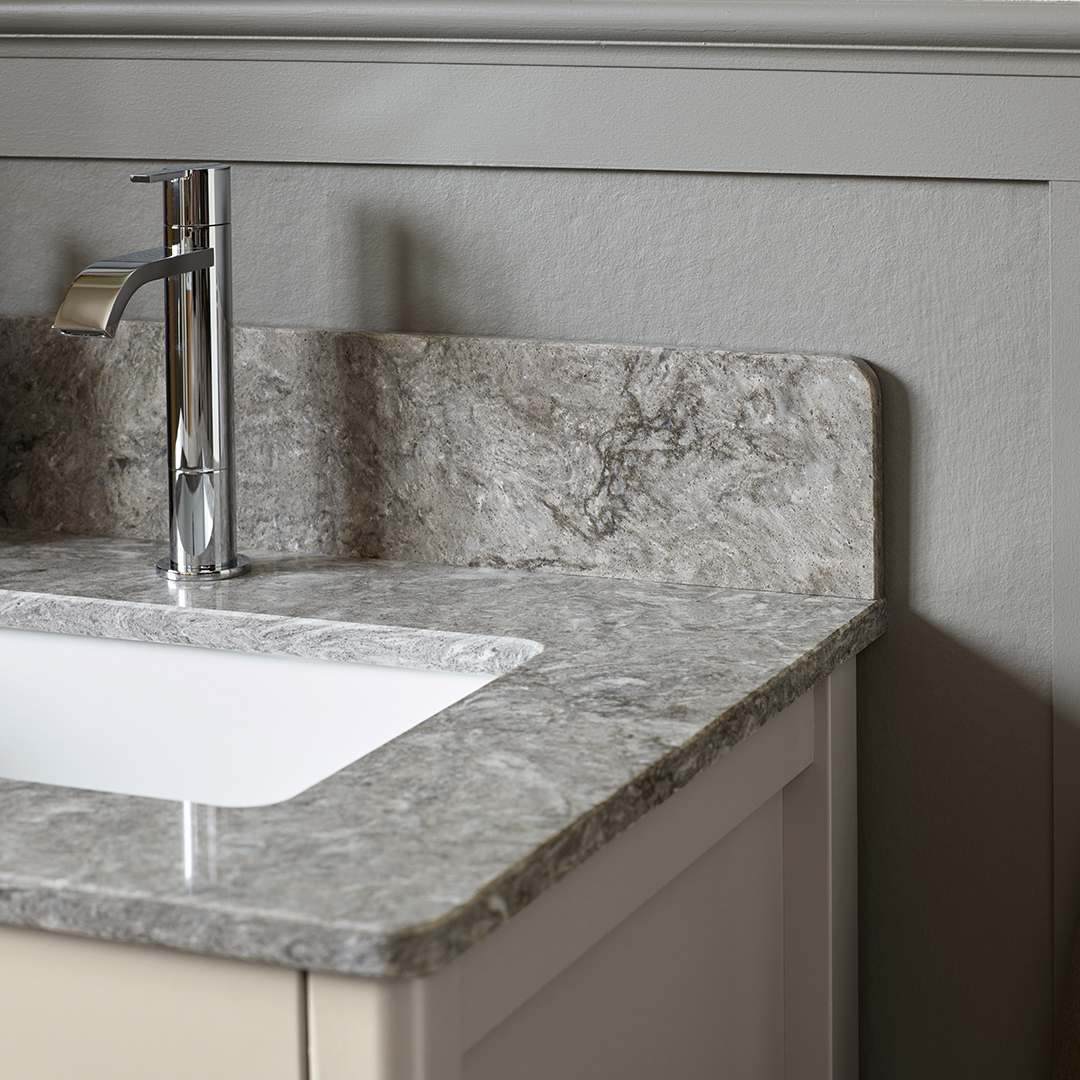 Om bänkskivan har fått fettfläckar av exempelvis smink kan man tvätta av den med en skursvamp utan slippåverkan och diskmedel. Skölj bort allt diskmedel med våt bomullstrasa. Torka torrt med microtrasa. Mineralkomposit liksom granit och marmor, tål hög värme. Dock inte värmechocker. Så en plötslig värmeförändring av t.ex. en varm hårfön eller plattång kan skada ytan. Använd därför alltid underlägg. För mer information läs skötselanvisningen.