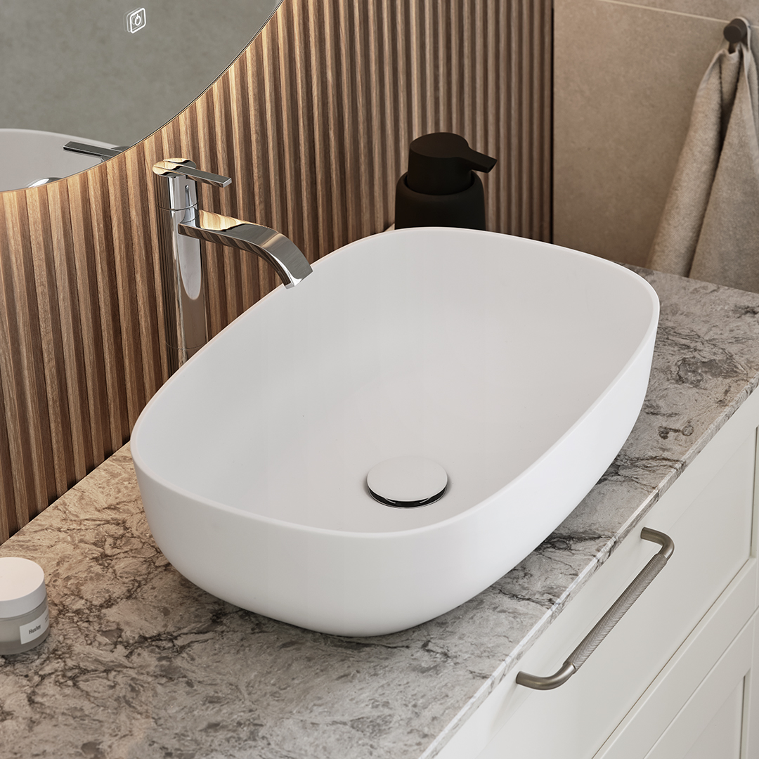 Tvättställ Mezzo är ett tvättställ i porslin som är generöst men ändå lättplacerat, eftersom det är lite grundare än vanligt. Det som utmärker tvättstället är den markerade kanten, som är inspirerad av formen på en porslinskopp. Designad för Vedum av Jesper Ståhl.