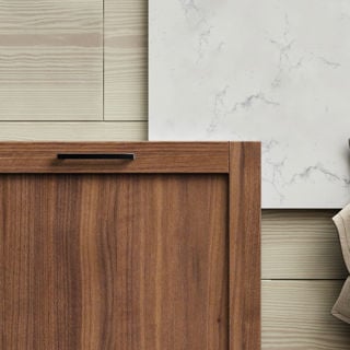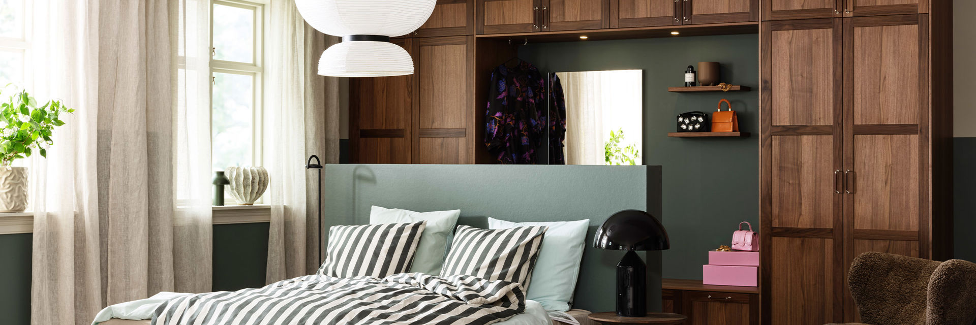 Varmt, ombonat, lyxigt – och ändå funktionellt. Luckan Ester i valnöt används här för att skapa ett dressingroom som är något utöver det vanliga. Massor av förvaring och praktiska lösningar som belysning över spegel, sittbänk och halvhög vägg/huvudgavel som skapar rum-i-rummet utan att störa det öppna intrycket. Hotellkänsla fast ni är hemma.