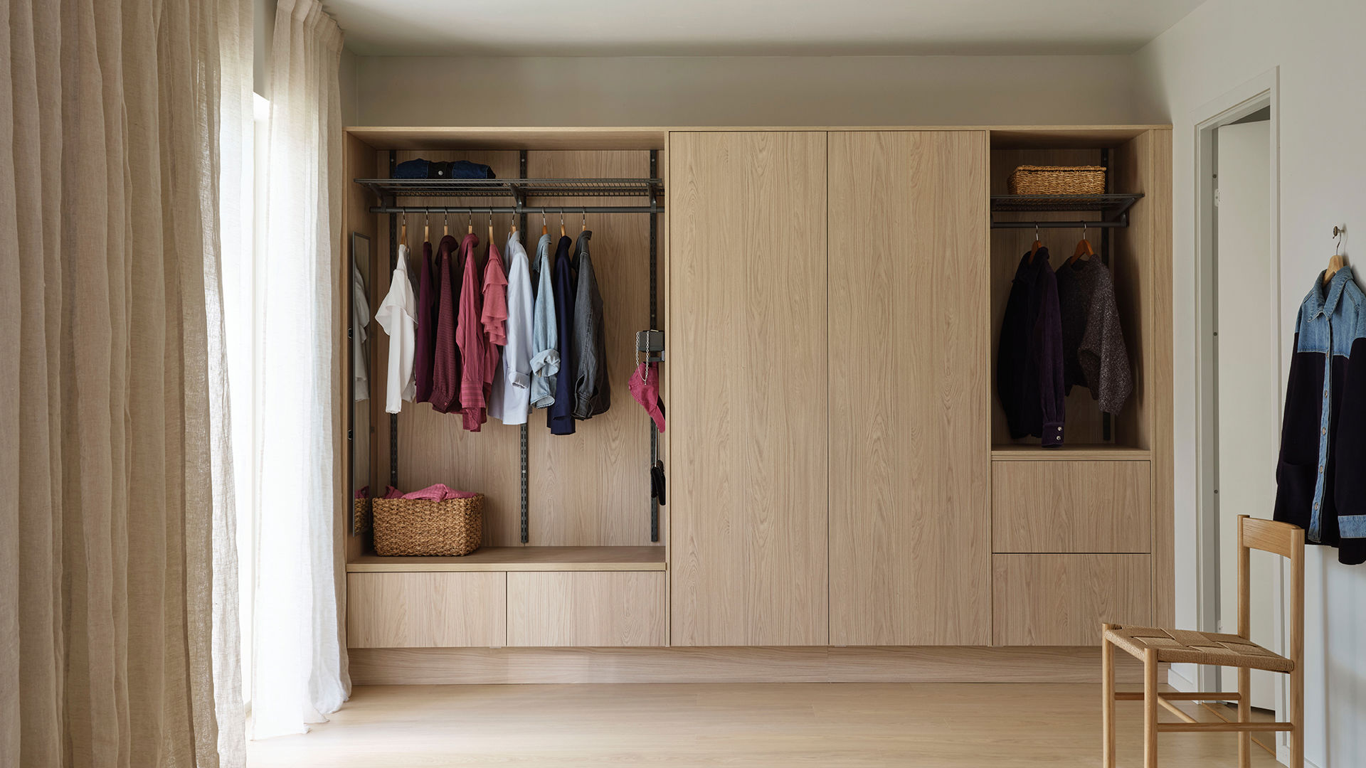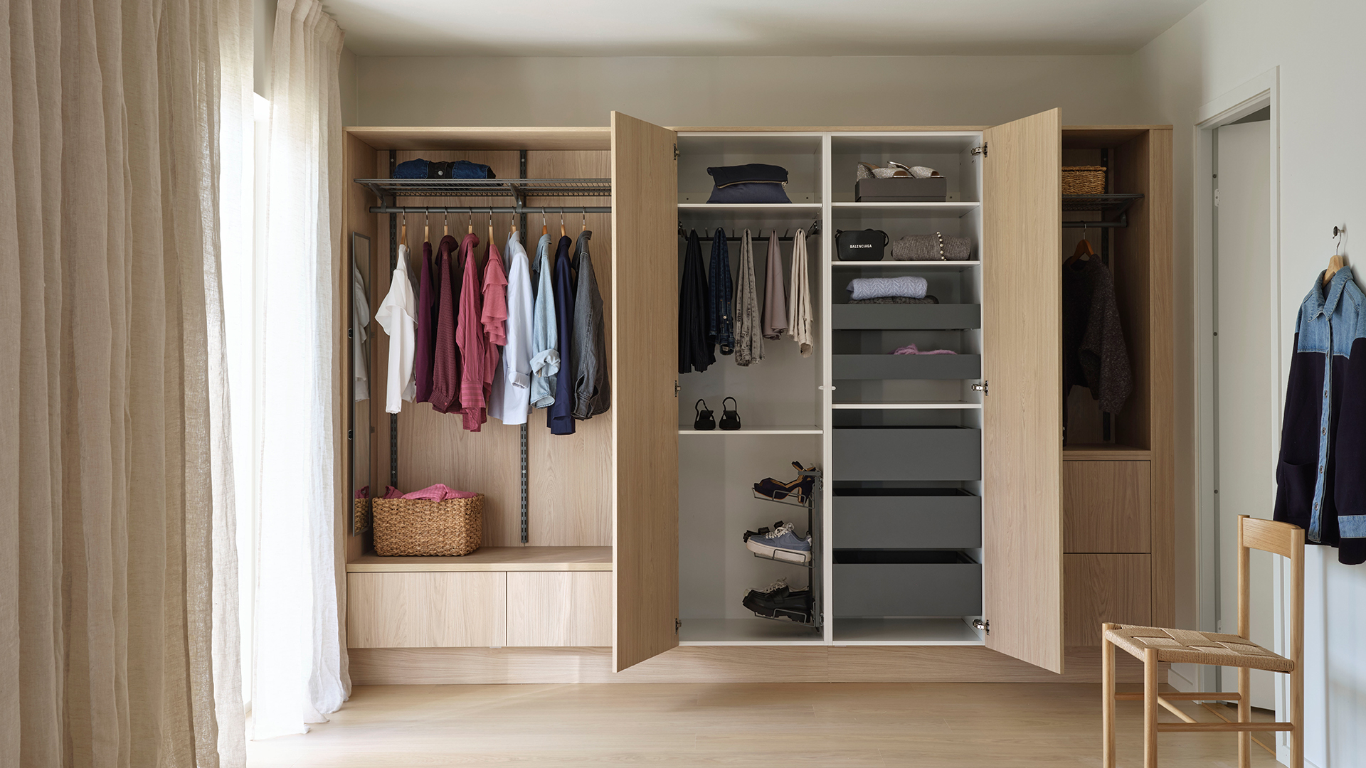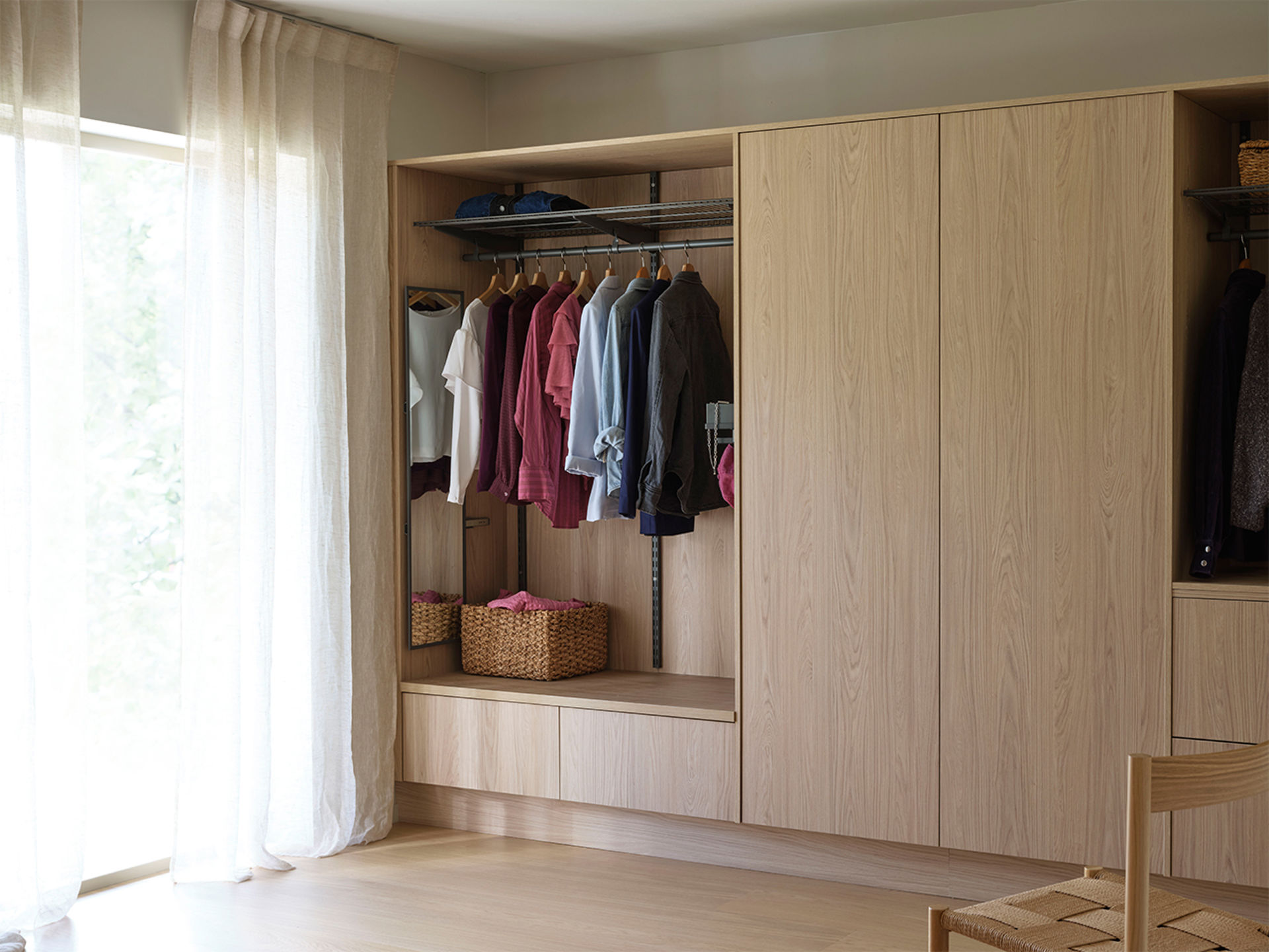 Den nya Svanenmärkta melaminluckan Ilse vitpigmenterad ek med ger detta dressingroom en ljus och harmonisk känsla. Inramning med samma material skapar ett platsbyggt uttryck och vårt nya väggsystem Ax gör det enkelt att anpassa förvaringen. Välj att visa upp eller dölja – med öppna partier för det du vill ha lättillgängligt och luckor för ett prydligt intryck. Smarta detaljer som utdragbar spegel och prylbox gör helheten både funktionell och elegant.