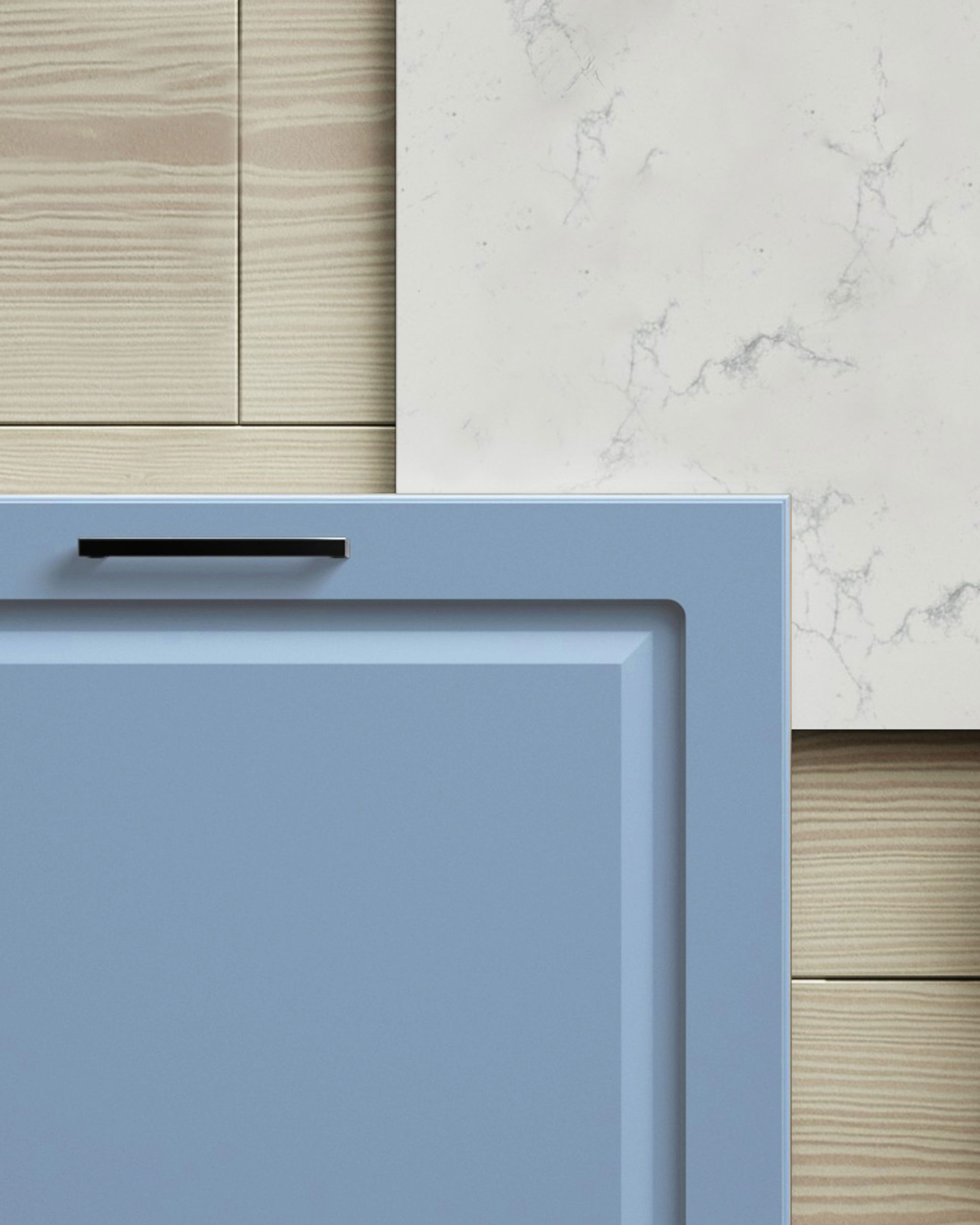 Målad lucka av 19 mm MDF-board med fräst profil och svagt rundad kant. Levereras i alla kulörer mot kulörtillägg med några få undantag. Finns också i spröjsad vitrin med klarglas. Toppvitrin finns till skåp i höjd 988 och 1138 mm i tre bredder med klarglas. Ingår i prisgrupp 5.