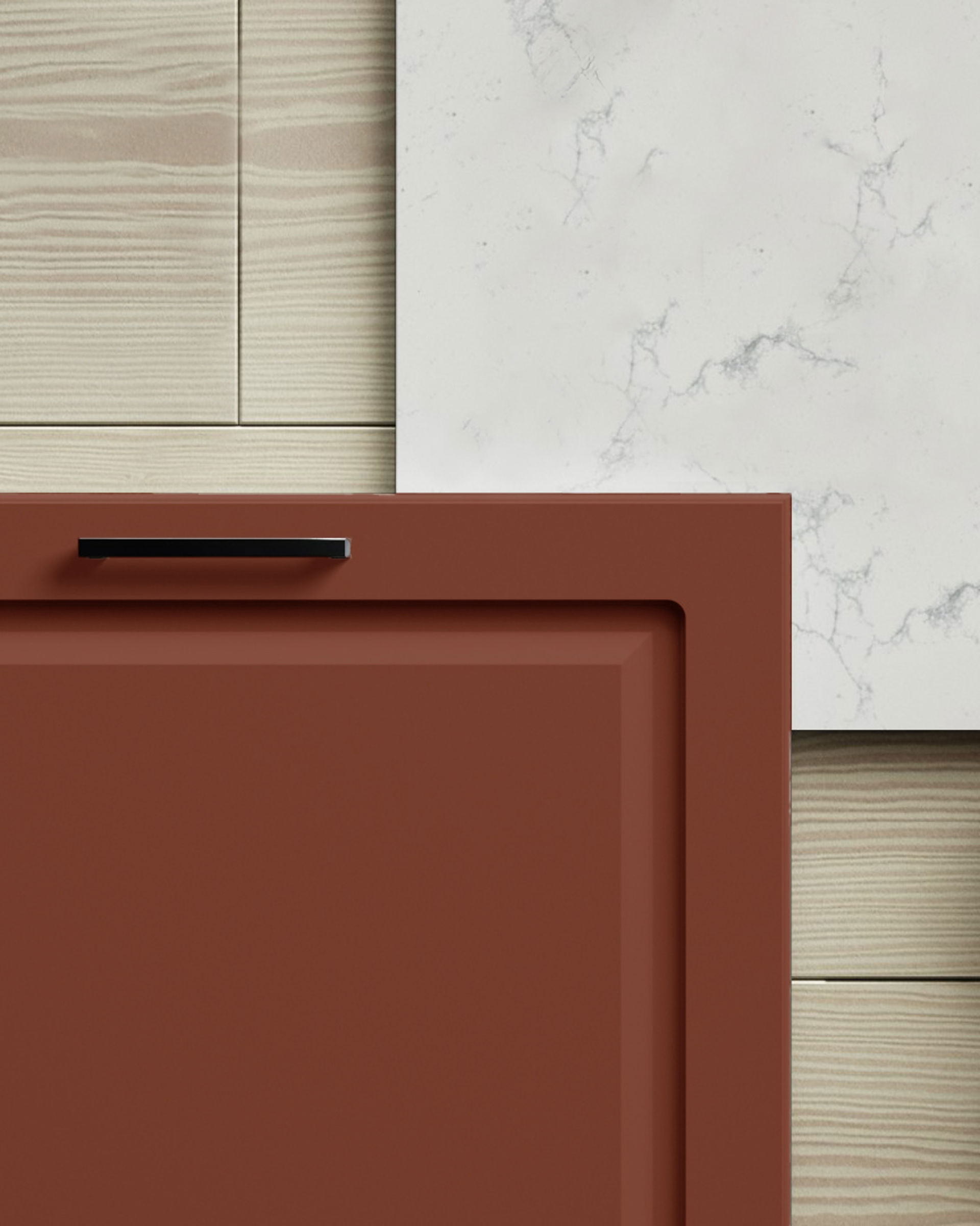 Målad lucka av 19 mm MDF-board med fräst profil och svagt rundad kant. Levereras i alla kulörer mot kulörtillägg med några få undantag. Finns också i spröjsad vitrin med klarglas. Toppvitrin finns till skåp i höjd 988 och 1138 mm i tre bredder med klarglas.