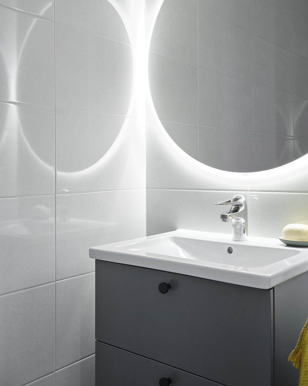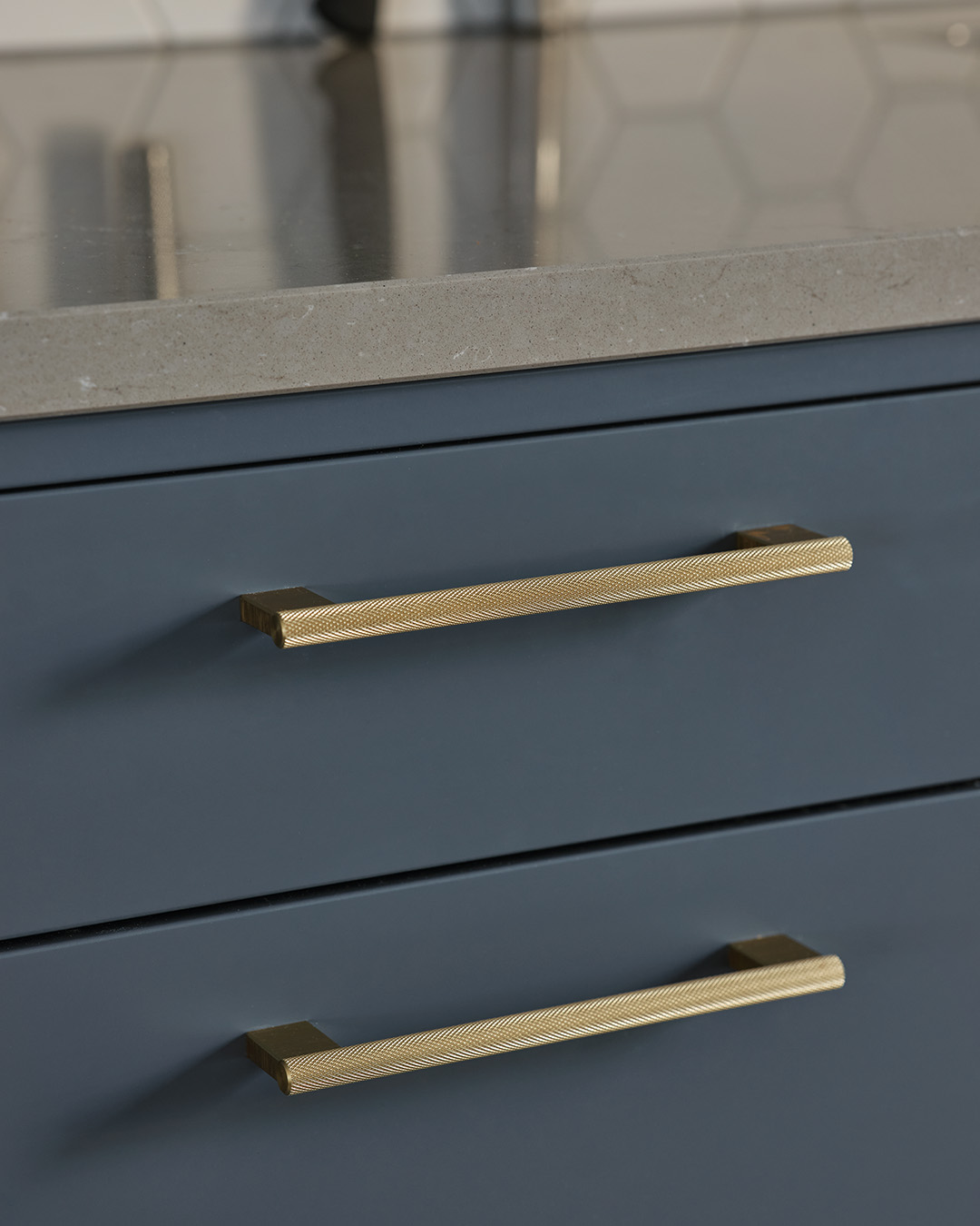 Ett elegant kök i blått med inspiration från fine dining och badrum i milda kulörer som ger en lugn och balanserad känsla. Annika Svensson och Peter Nilsson har landat i sin nybyggda bostadsrätt med inredning från Vedum.