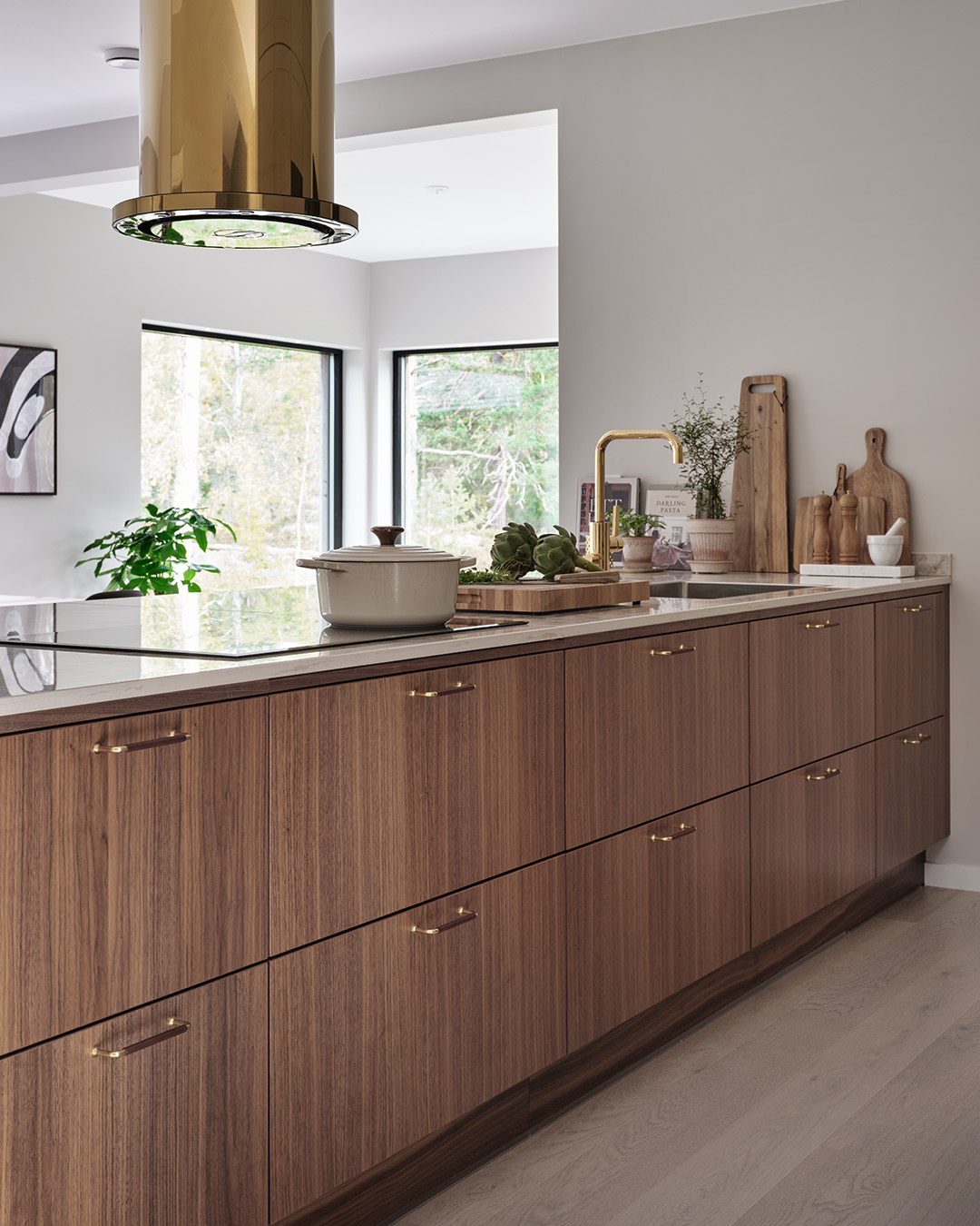 Under hela processen har det också varit viktigt att skapa en närhet mellan inne och ute, och sudda ut den gränsen. Omgivningen har haft stor inverkan på materialvalen och förutom köket i valnöt och sandbeige så har paret valt kulören dimgrön på sin Veduminredning i både hall och tvättstuga. En harmonisk kulör med inspiration från naturen.