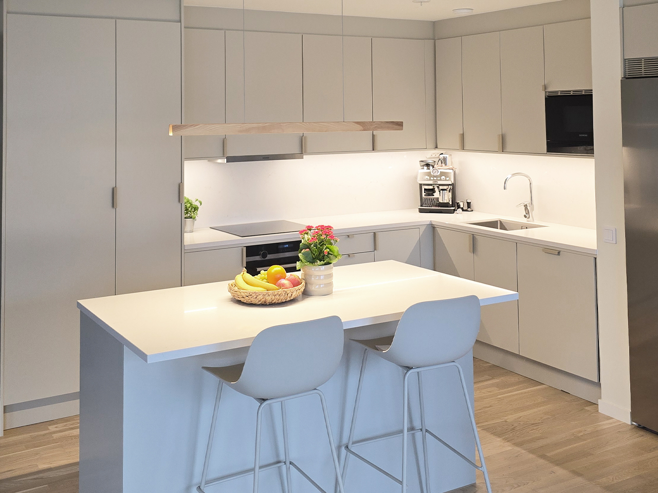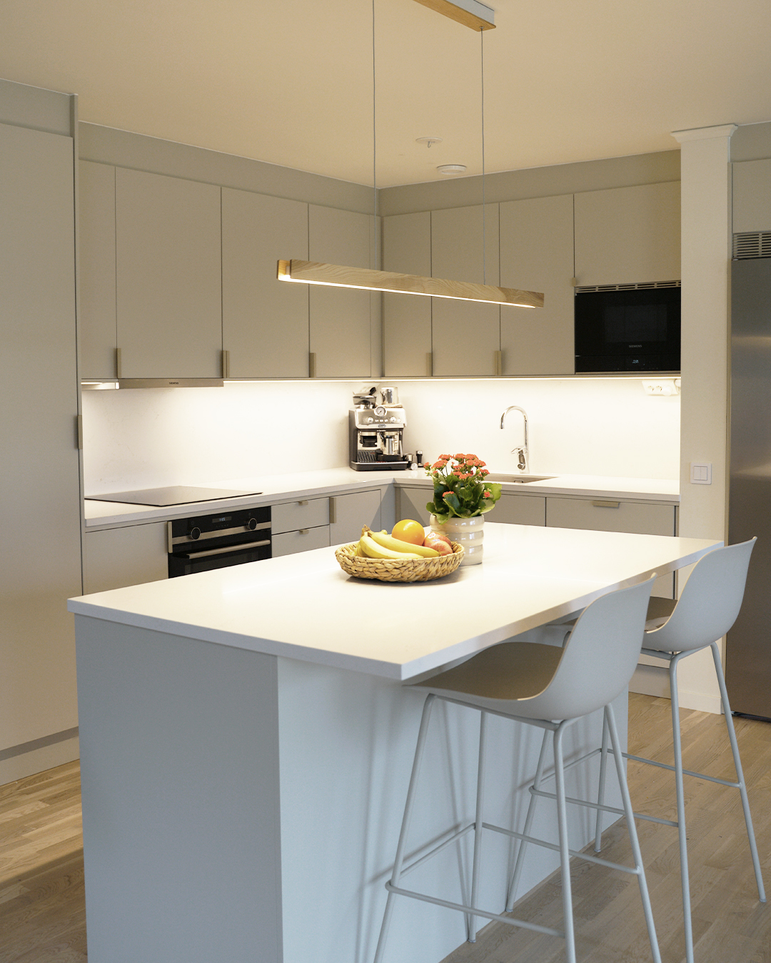 Emilia och hennes sambo har också lagt stor vikt vid att skapa ett funktionellt kök med smarta lösningar som gör det lätt att arbeta där. En särskild lösning de är mycket nöjda med är den infrästa ledbelysningen under överskåpen. Belysningen ger ett jämnt och behagligt ljus som sprider sig över hela arbetsytan och gör det lättare att arbeta i köket, samtidigt som det skapar en mysig atmosfär.