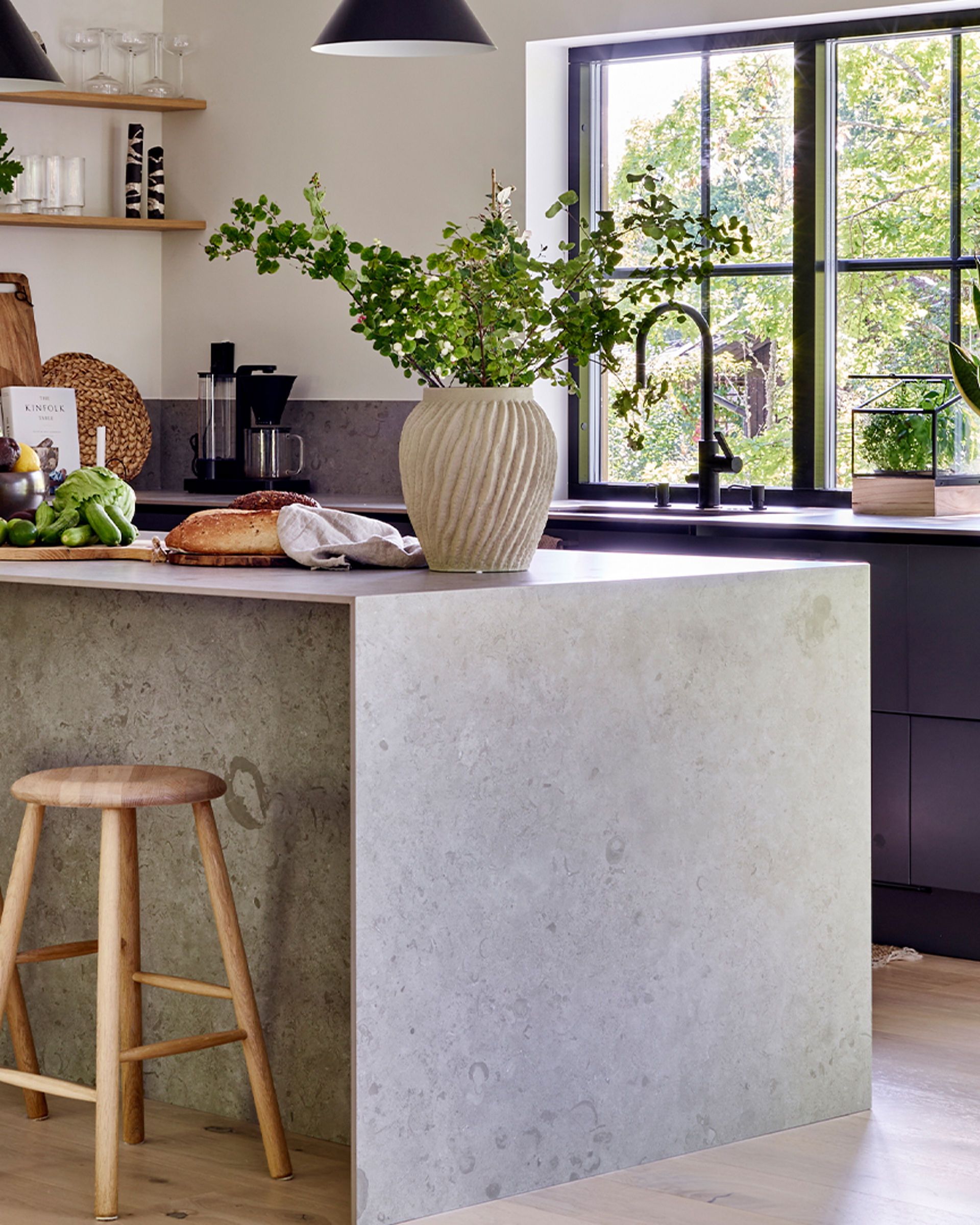 Den genomtänkta designen och de återkommande materialvalen i hela huset ger en känsla av enhetlighet. Köksluckorna i samma kulör som dörrarna och de målade listerna i samma färg som väggarna skapar ett lugnt flöde genom alla rum. För att bryta av har de blandat in naturmaterial och trä, vilket skapar en varm och inbjudande känsla.