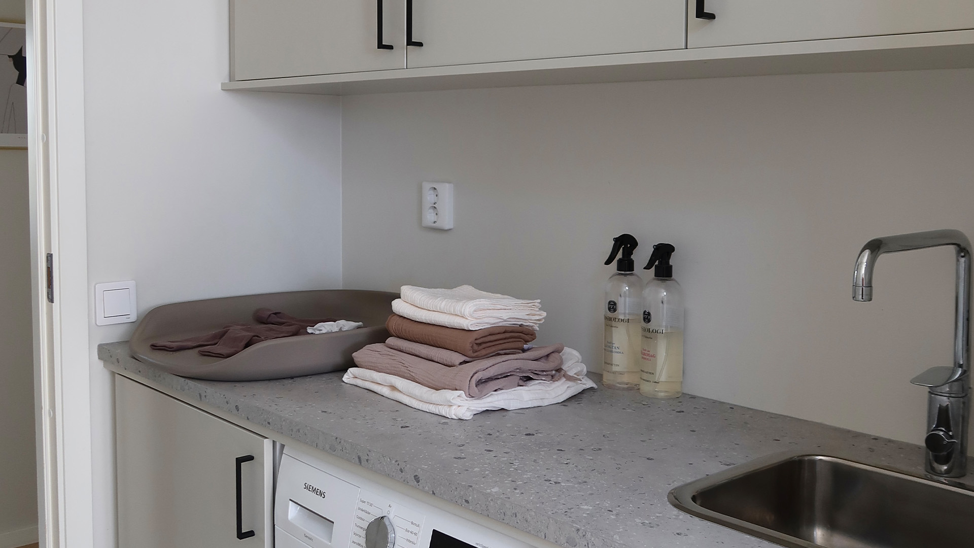 – Överskåpen hjälper oss att hålla ordning och gör det lättare att sortera och förvara tvättmedel, rengöringsprodukter och andra nödvändigheter. De är också monterade på en höjd som gör dem lättillgängliga för oss vuxna, men utom räckhåll för de små, vilket bidrar till säkerheten i tvättstugan.