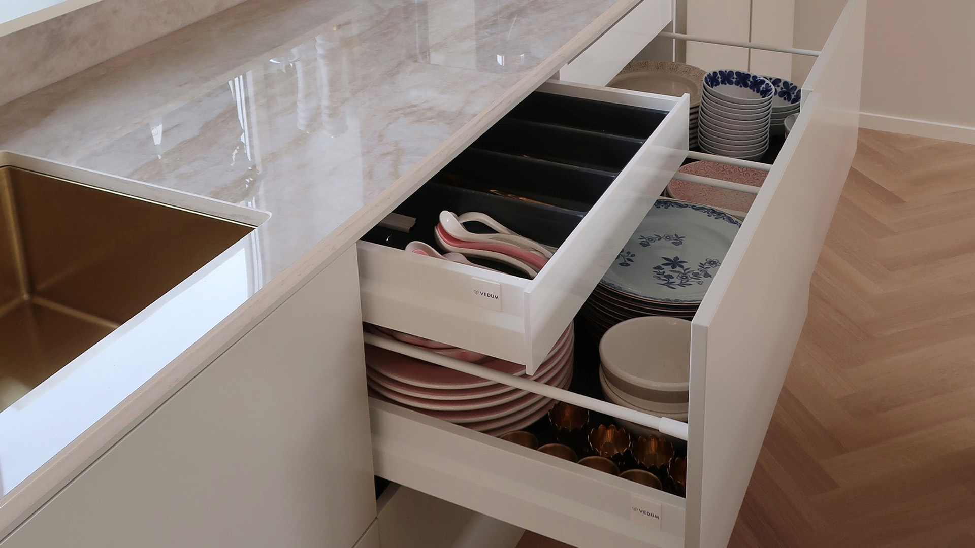 – När vi byggde vårt hus valde vi Vedum i kök, badrum och tvättstuga. Vi blev mycket nöjda med resultatet då och därför kändes det också naturligt att välja Vedum när vi bestämde oss för att renovera tvättstugan, säger de och fortsätter: