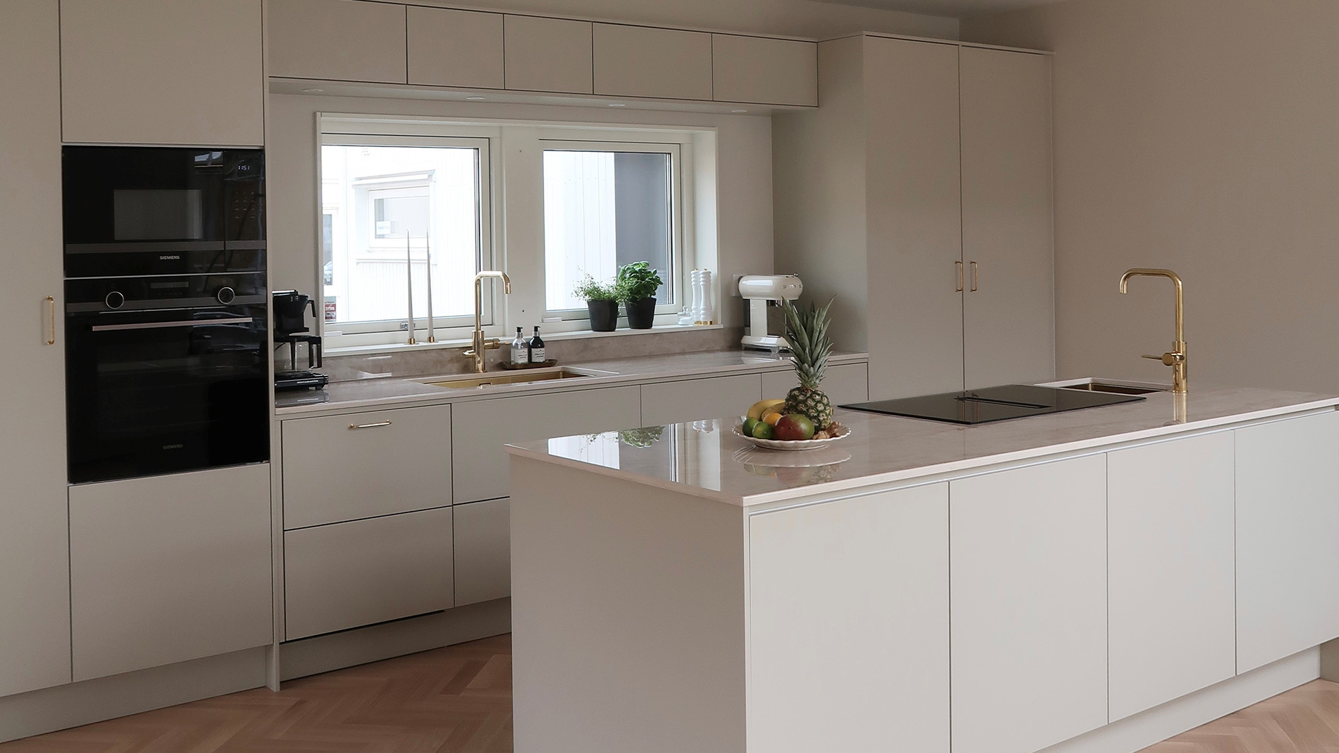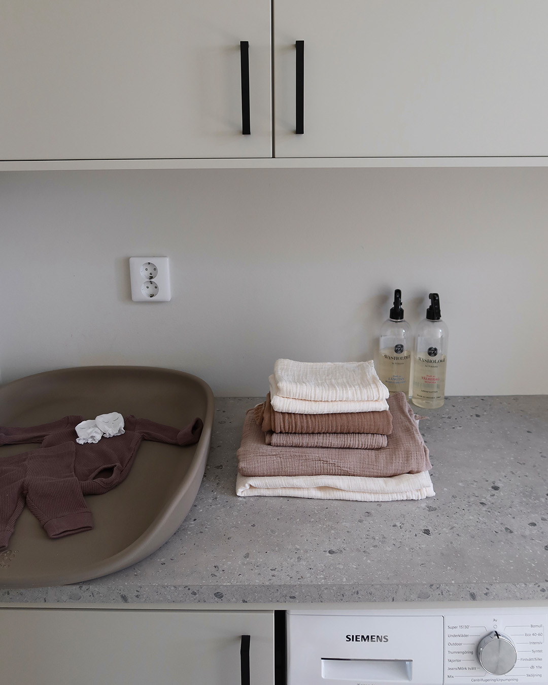 Inför renoveringen var det även viktigt att tvättstugan skulle gå i samma toner som köket, för att binda ihop hemmet på ett bättre sätt än tidigare då tvättstuga var vit. Därför valde de luckan Maja i kulören linnebeige även här, något de inte ångrar.