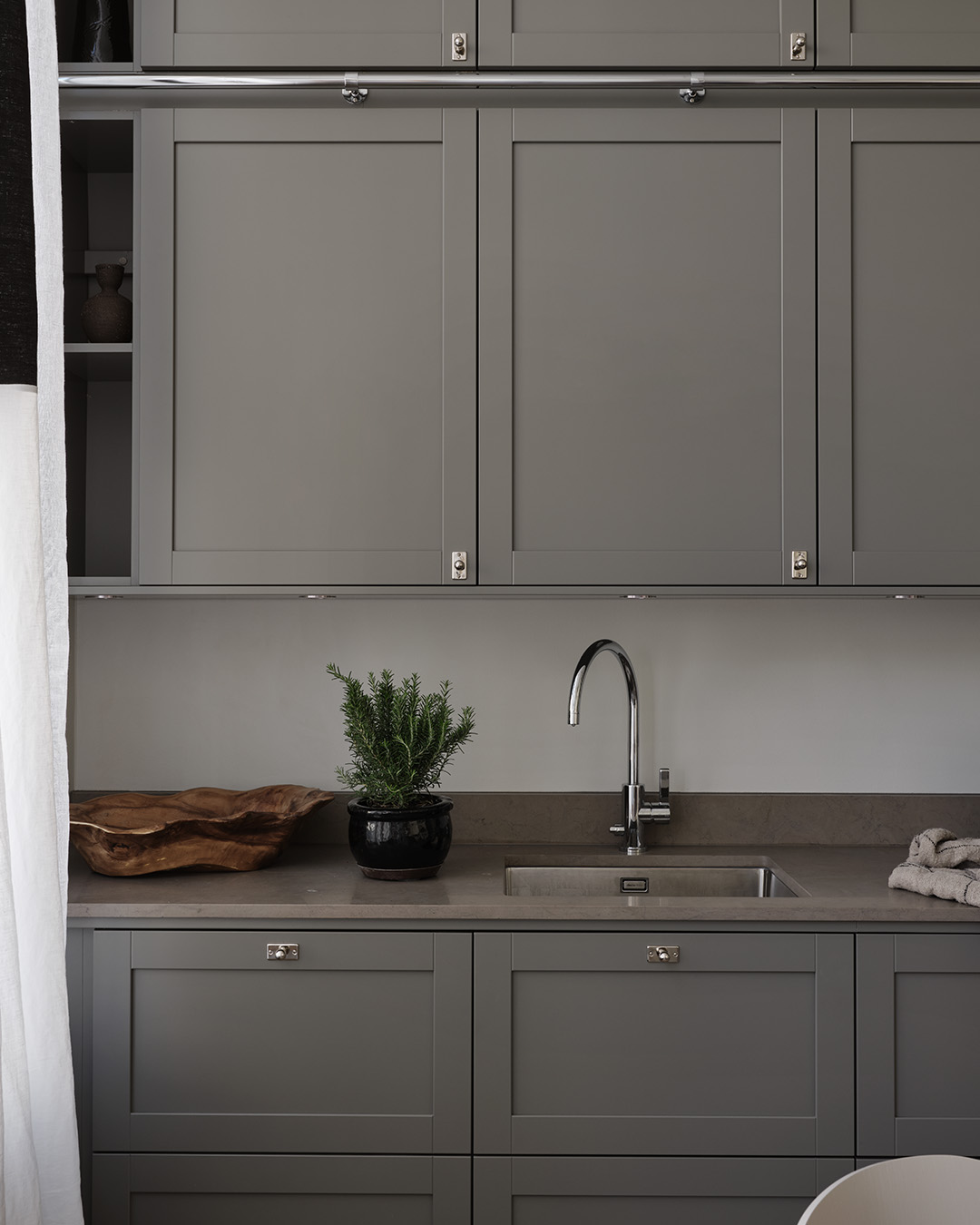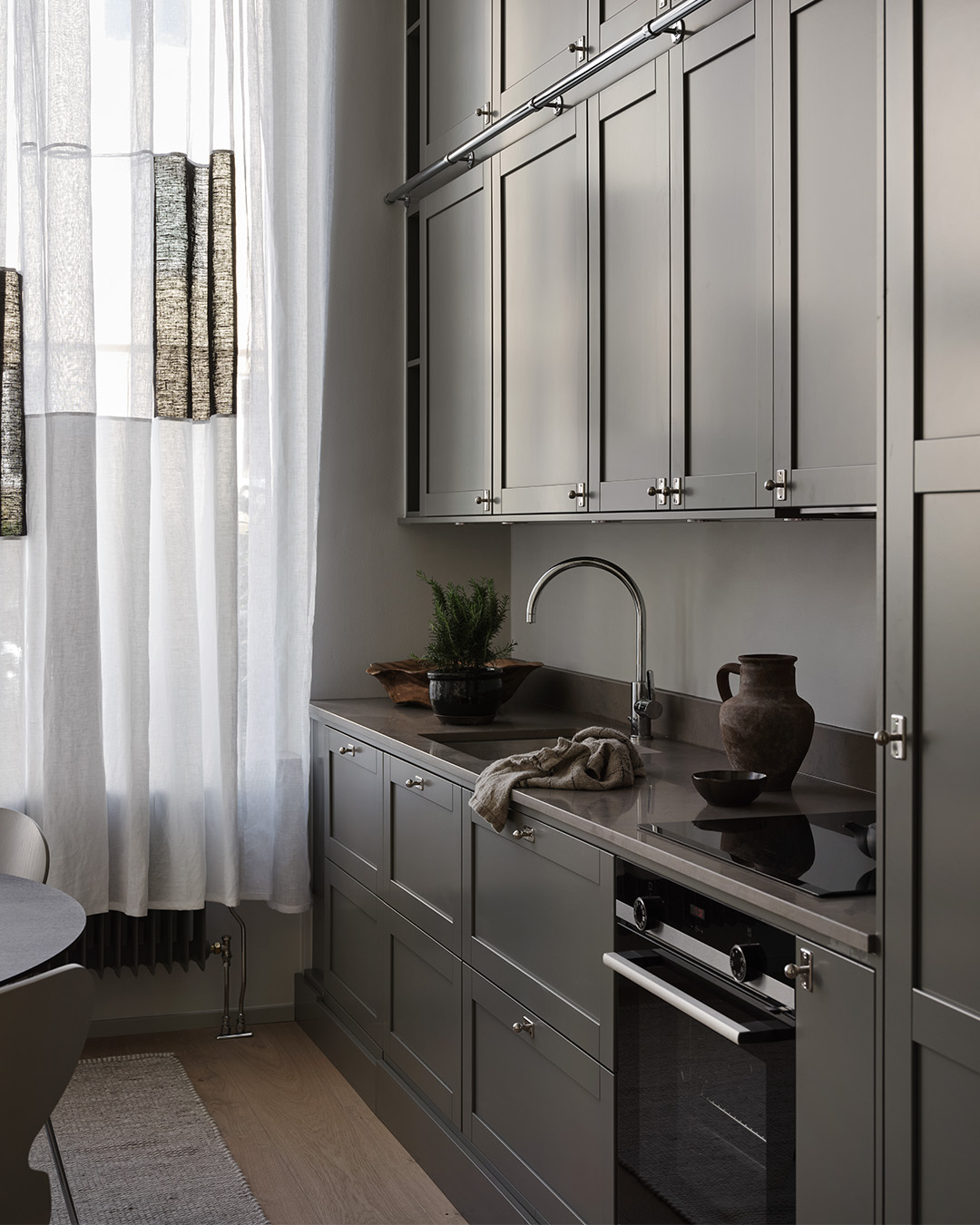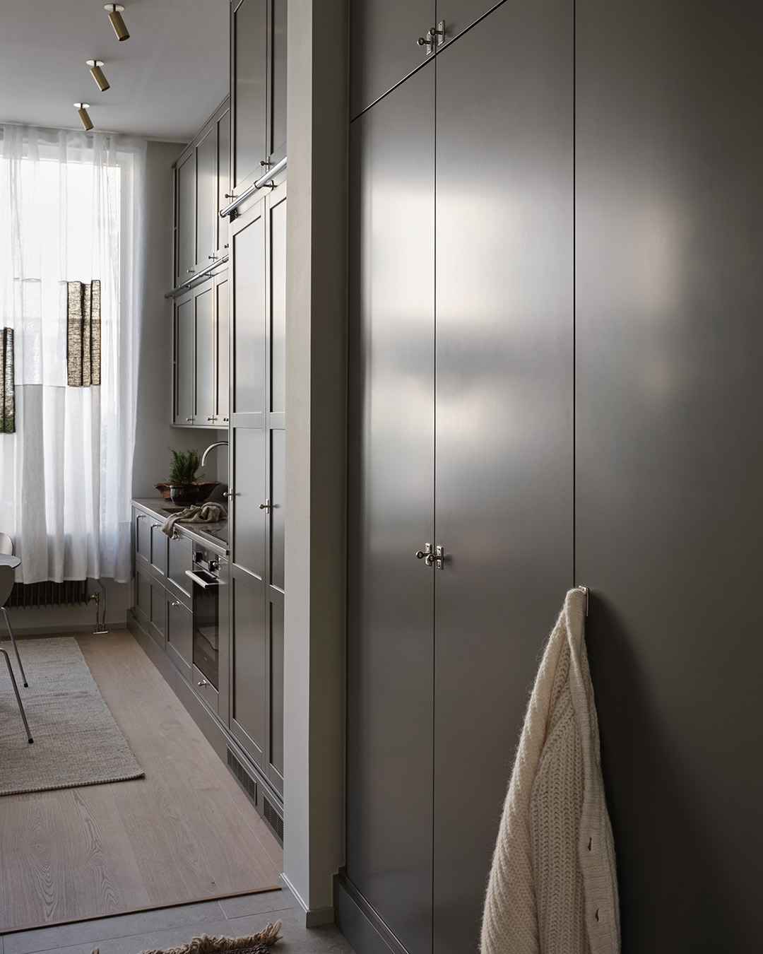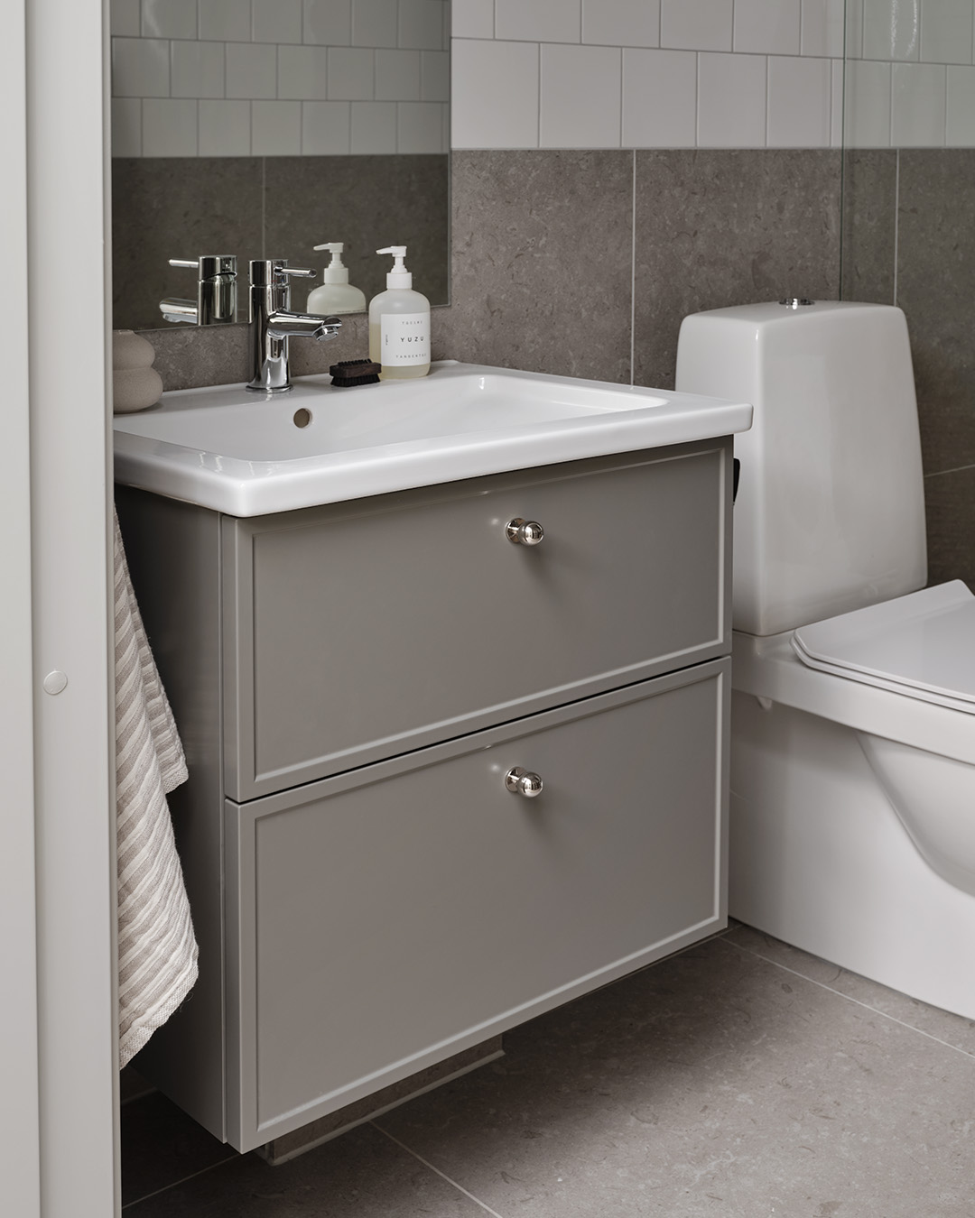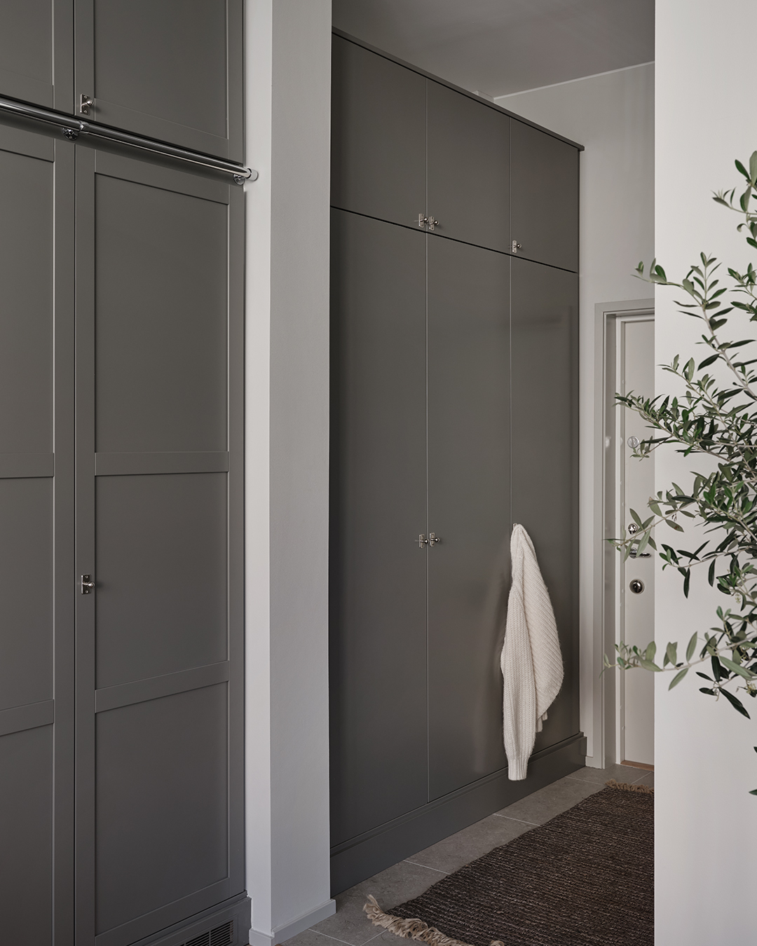 Vedums betonggrå kulör återfinns på inredningen i kök, badrum och hall medan den något ljusare kulören varmgrå har valts till de båda sovrummen. Att kombinera två grå kulörer skapar en dynamisk, men samtidigt harmonisk helhet i hemmet. Detta förstärks ytterligare av att de klassiska ramluckorna Edit och Thea får sällskap av den något mer moderna luckan Maja.