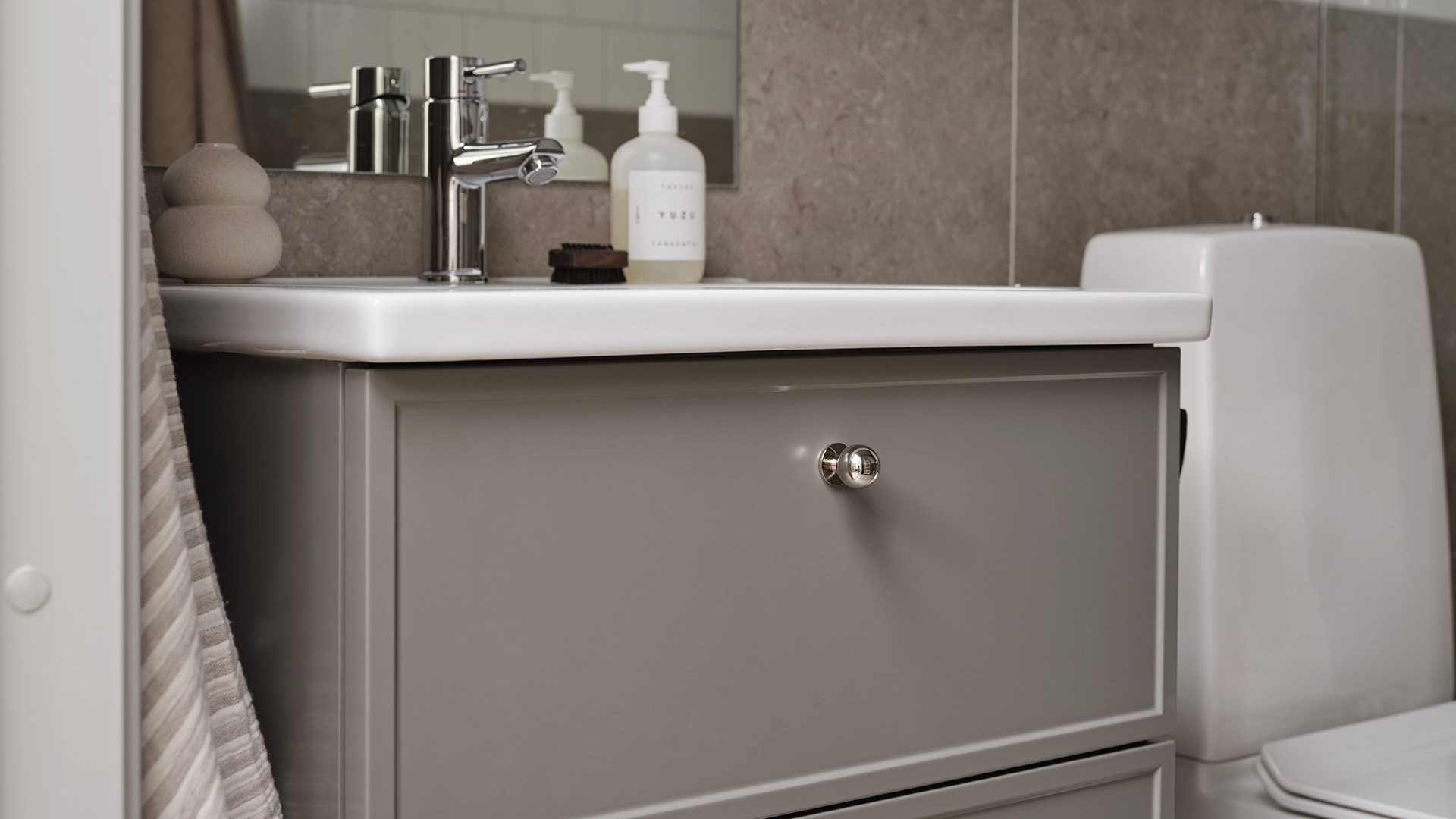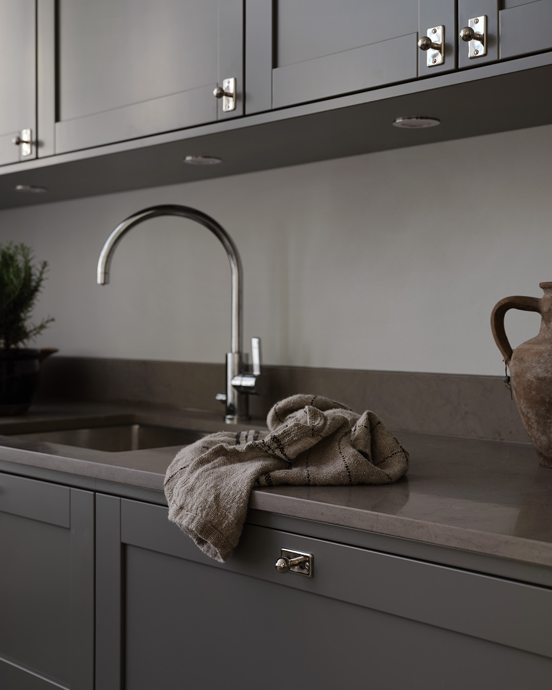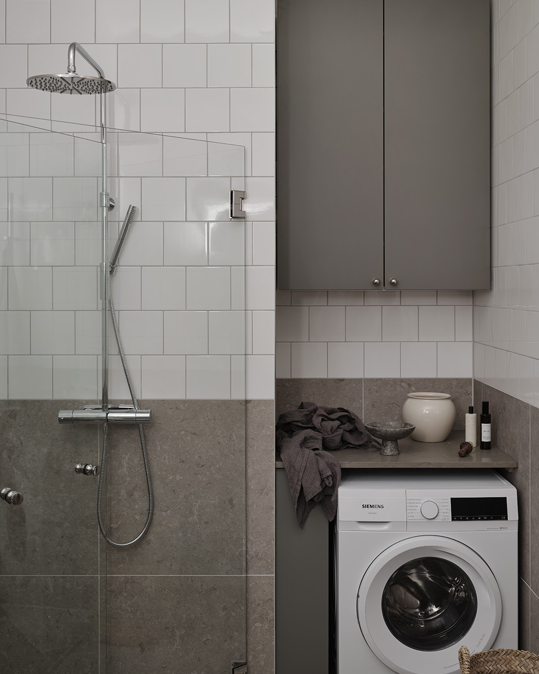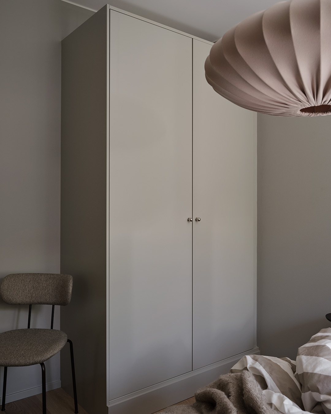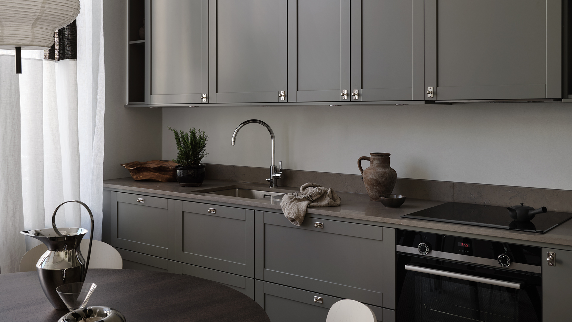 Vedums betonggrå kulör återfinns på inredningen i kök, badrum och hall medan den något ljusare kulören varmgrå har valts till de båda sovrummen. Att kombinera två grå kulörer skapar en dynamisk, men samtidigt harmonisk helhet i hemmet. Detta förstärks ytterligare av att de klassiska ramluckorna Edit och Thea får sällskap av den något mer moderna luckan Maja.