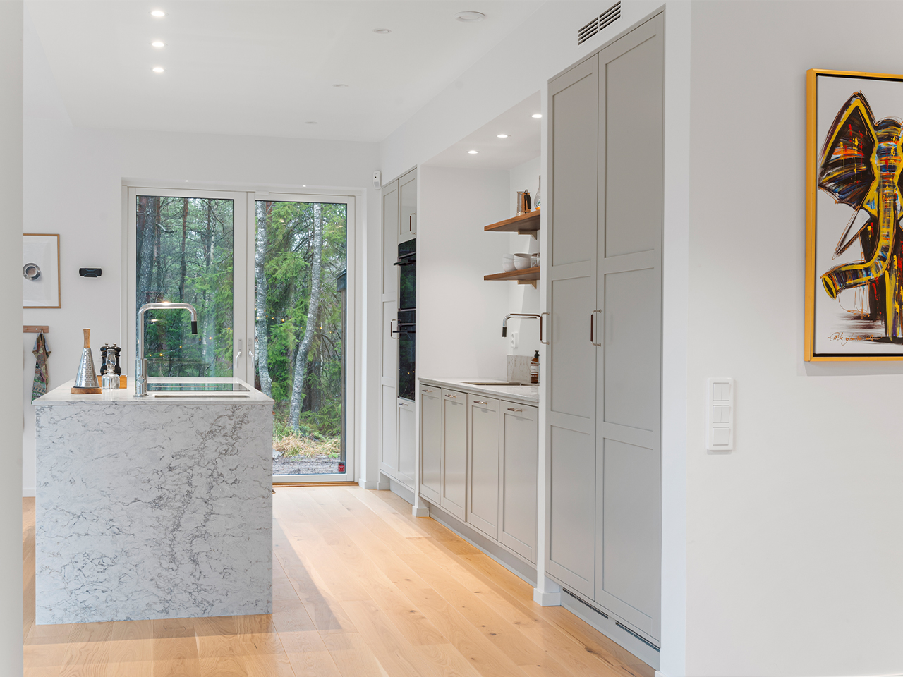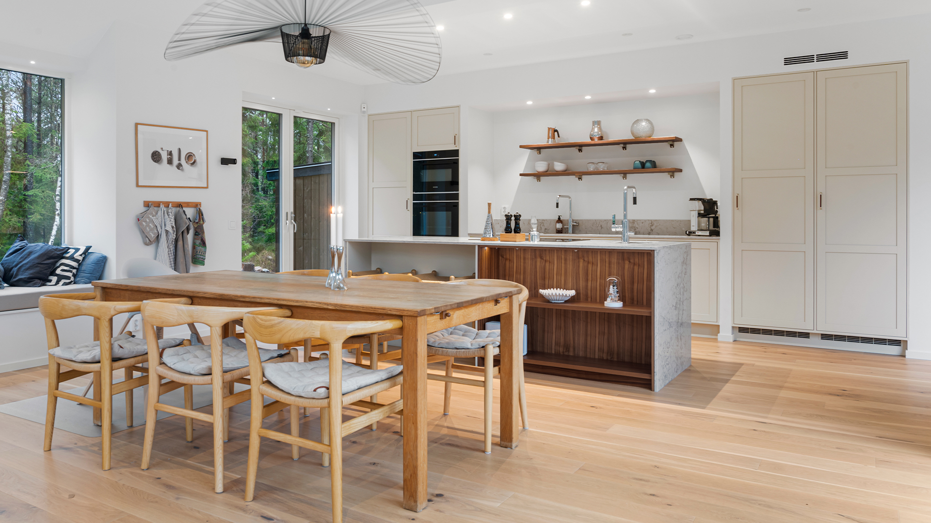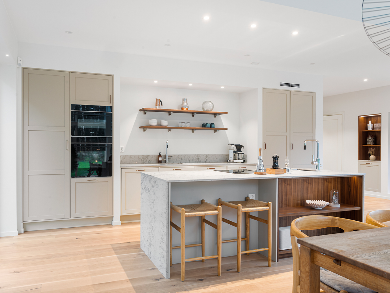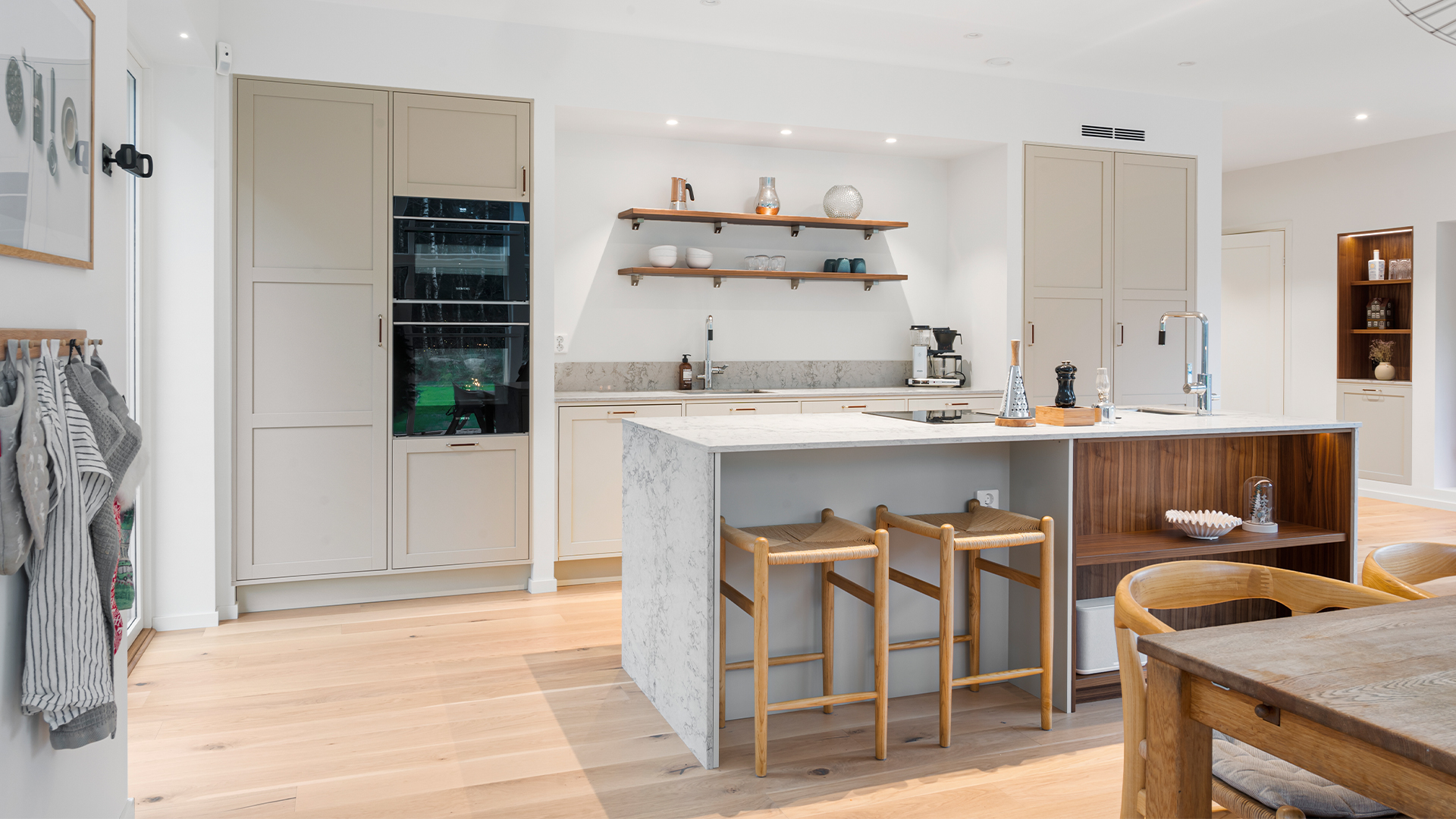 Med inspiration från dansk arkitektur och en tydlig önskan om ett minimalistiskt uttryck har de skapat ett kök som känns både luftigt och varmt. Här möts funktion och estetik i en naturlig balans, och köksön har blivit den självklara samlingspunkten för både familj och vänner.