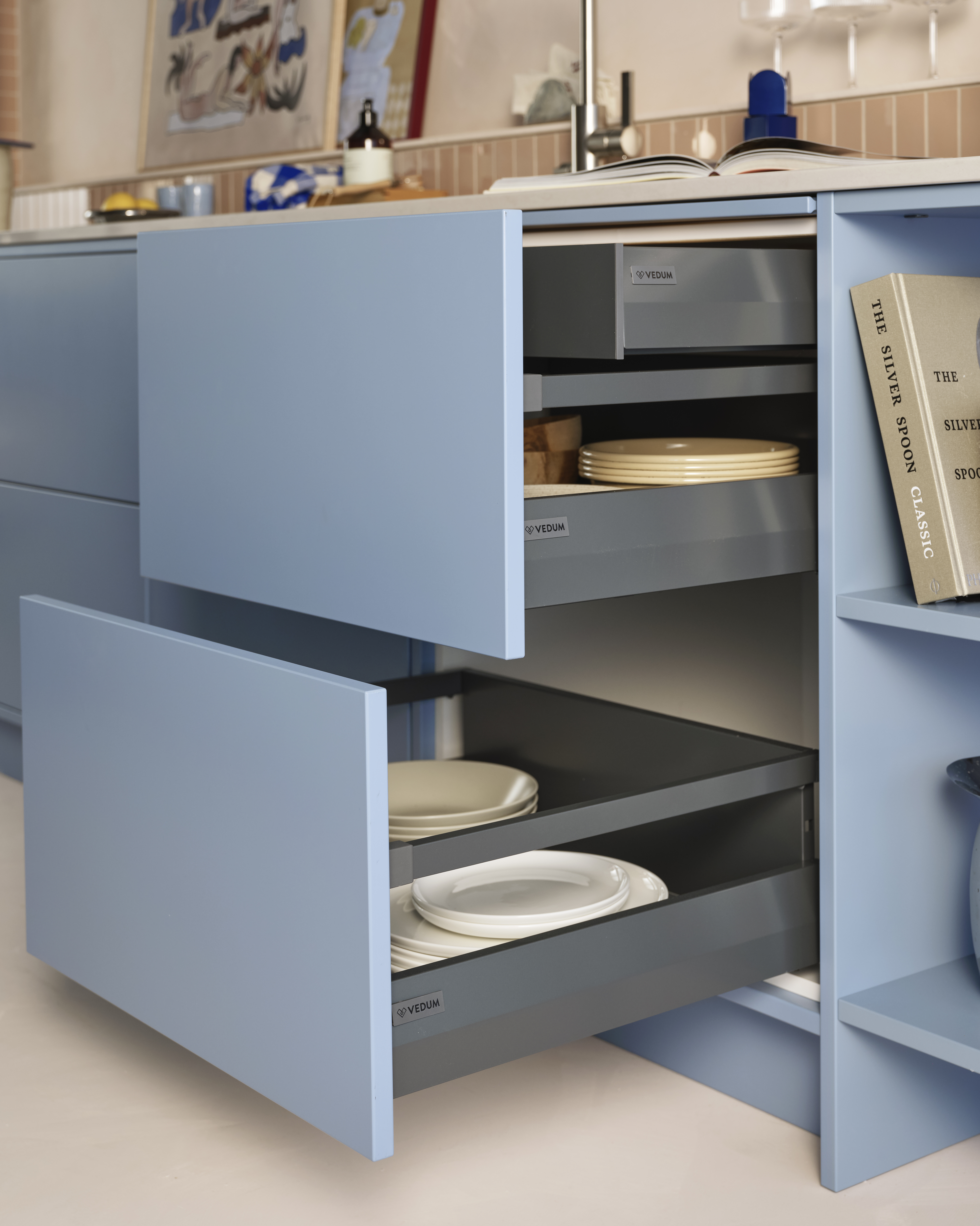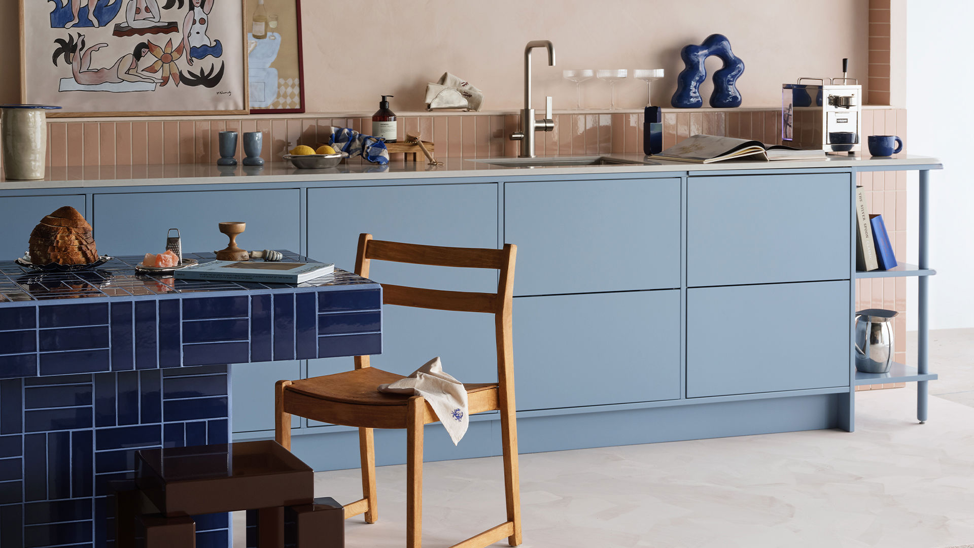 Duon har tagit fasta på det lekfulla och flörtiga för att ge den moderna stilen en lite mer mjuk och lättsam ton. Den djärva blå kulören och det milda, mättade persikofärgade kaklet är båda starka personligheter som gifter sig fint i en balanserad, harmonisk övergång. Den rundade formen i valvet ger ett vänligt och välkomnande intryck, ramar in miljön och bildar också en vacker display-yta för personliga föremål. Ett modernt kök som känns varmt och avslappnat.