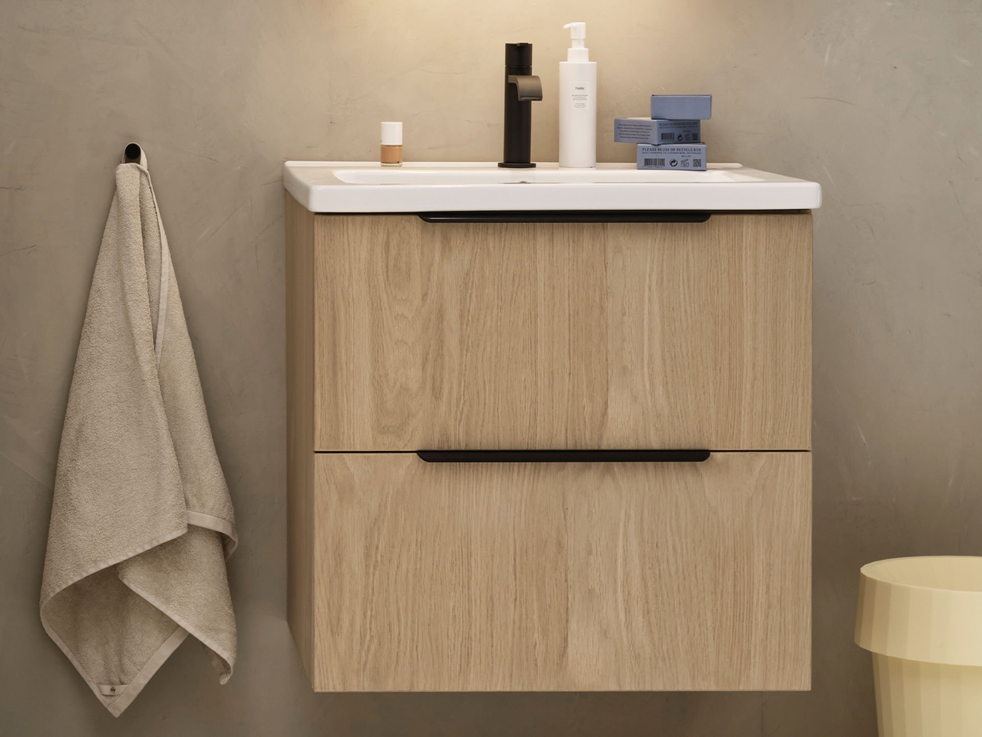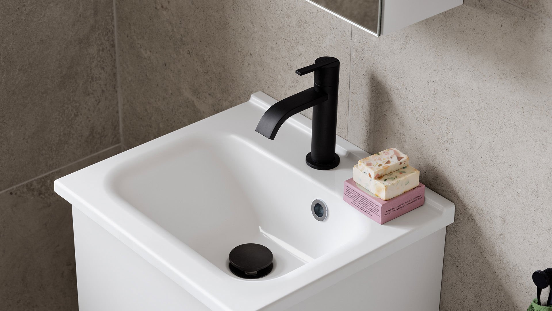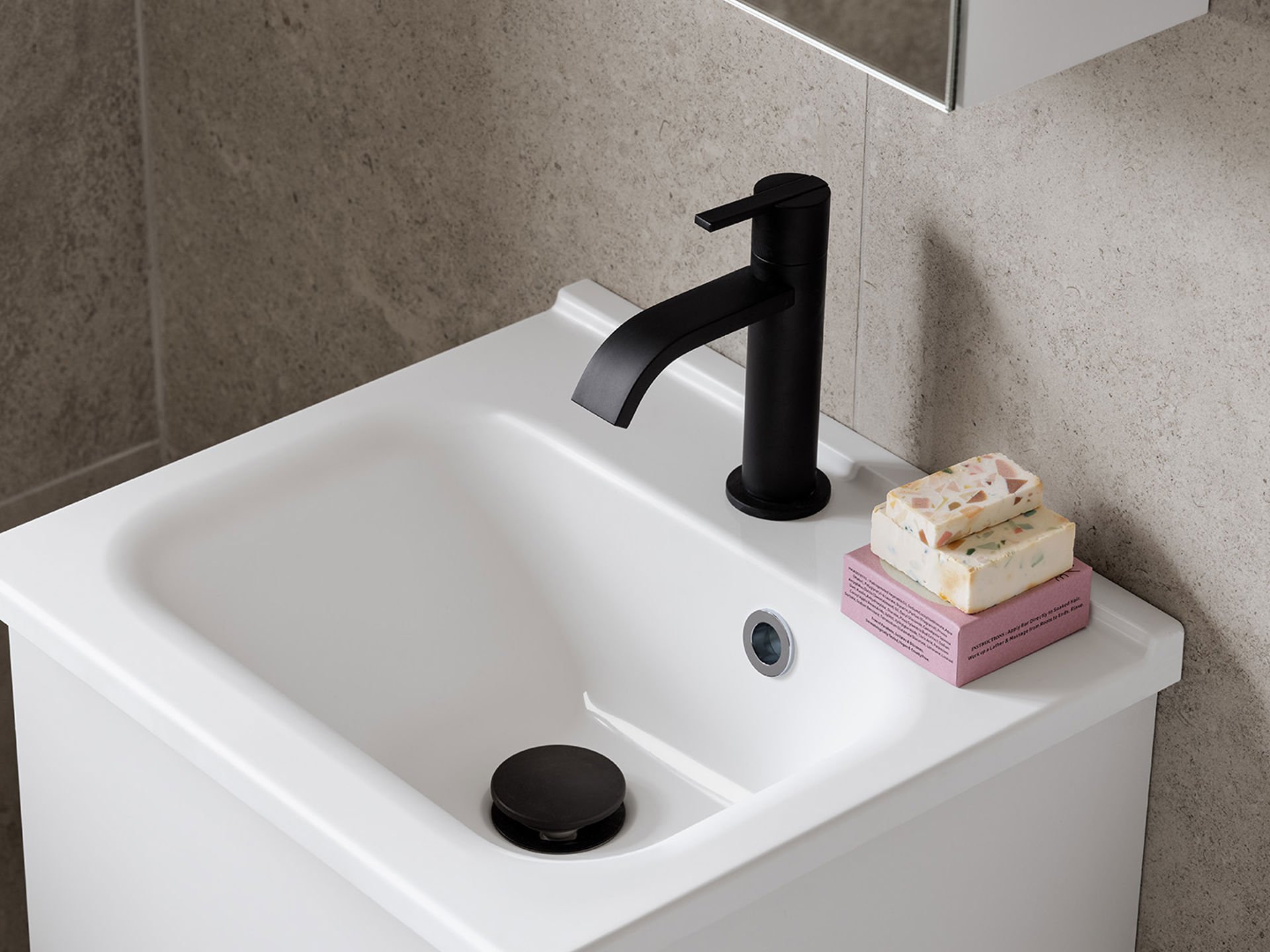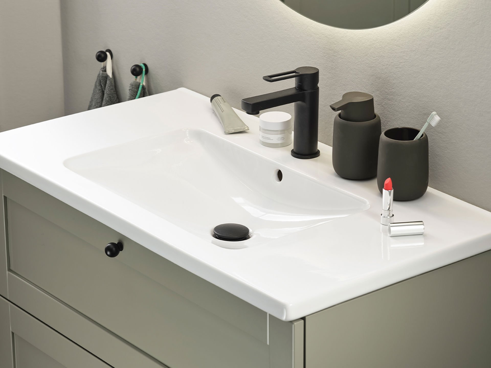Ett tvättställ i porslin som finns i standardutförande och i Compact, en grundare variant för kommod i bredden 600 mm.