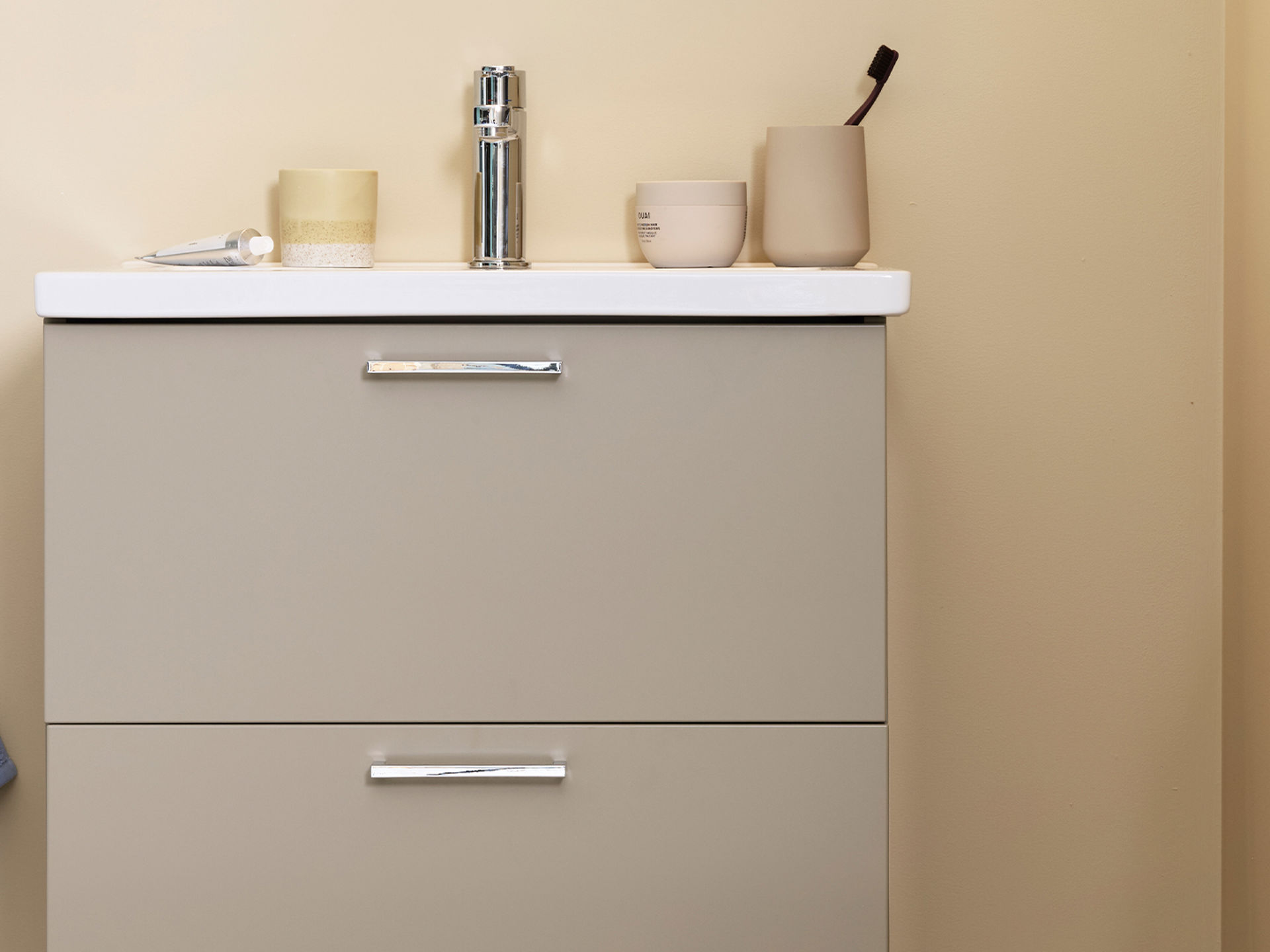 Free finns i bredderna 400, 500, 600 och 900 mm med luckorna Maja, Thea, Alice och Edit i alla våra standardkulörer, melaminluckan Elsa och Nora, samt luckan Molly i fanér. Du väljer antingen tvättstället Free i porslin eller tvättstället Found med Evermite-yta. Kommoden i bredderna 500 och 600 mm finns även som Friend, med en hel låda och ett hyllplan. Vattenlåset Easy Clean, lådindelning och gummimattor ingår. Kommoden i bredderna 500, 600 och 900 mm är dessutom tillgänglighetsanpassad. Genom att väggmontera tvättställen kan kommoden tas bort utan att vattnet kopplas bort.