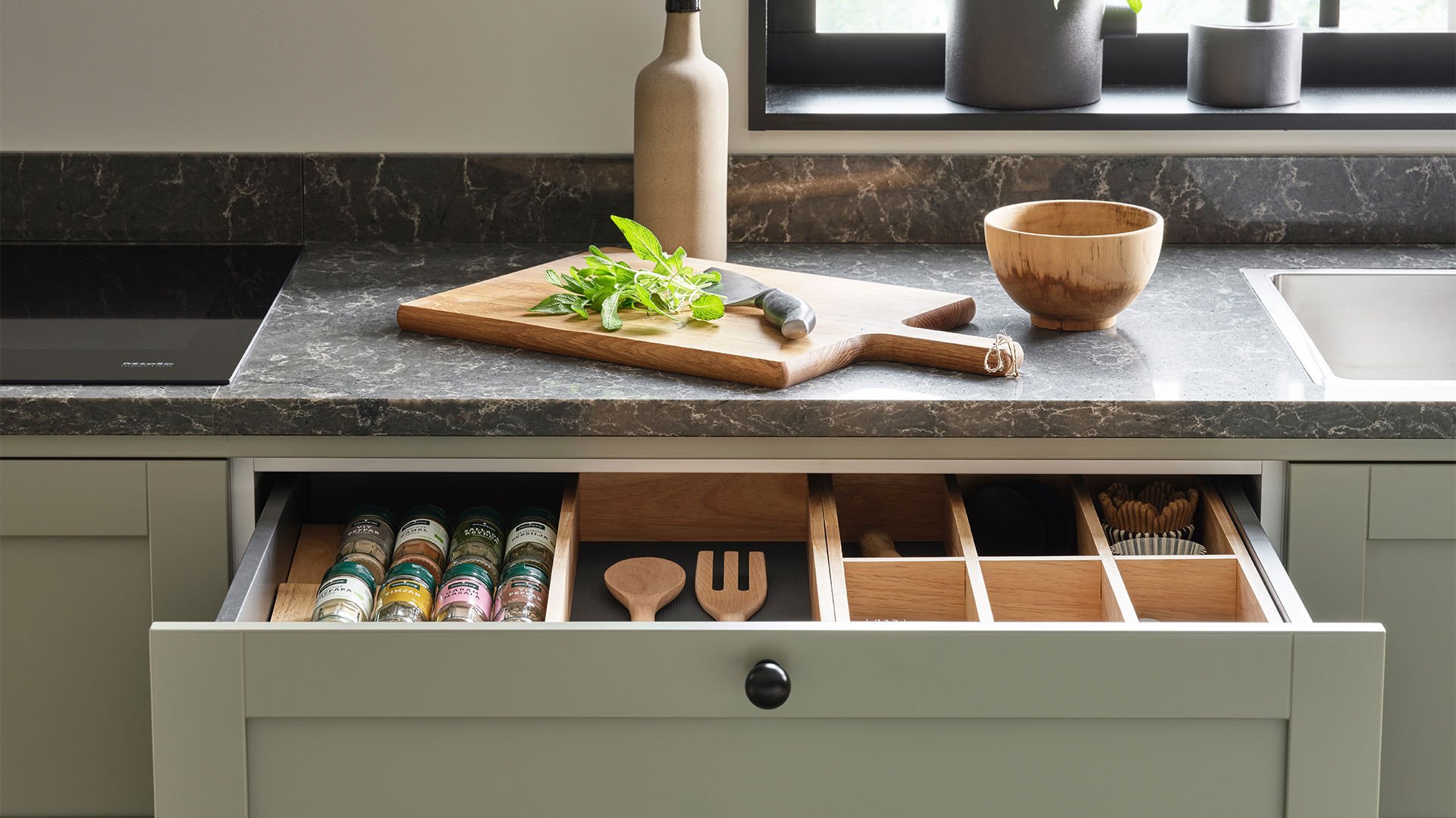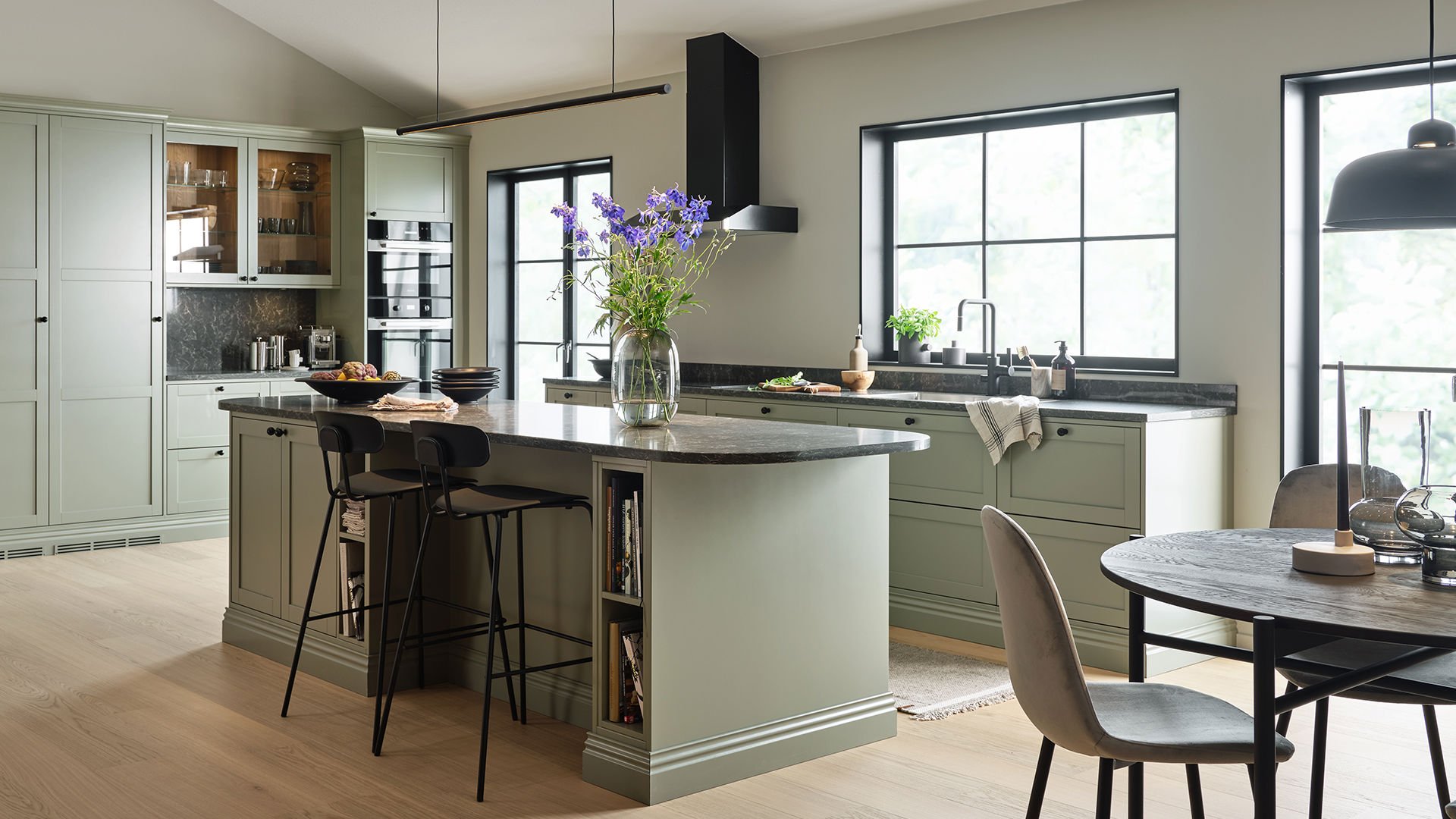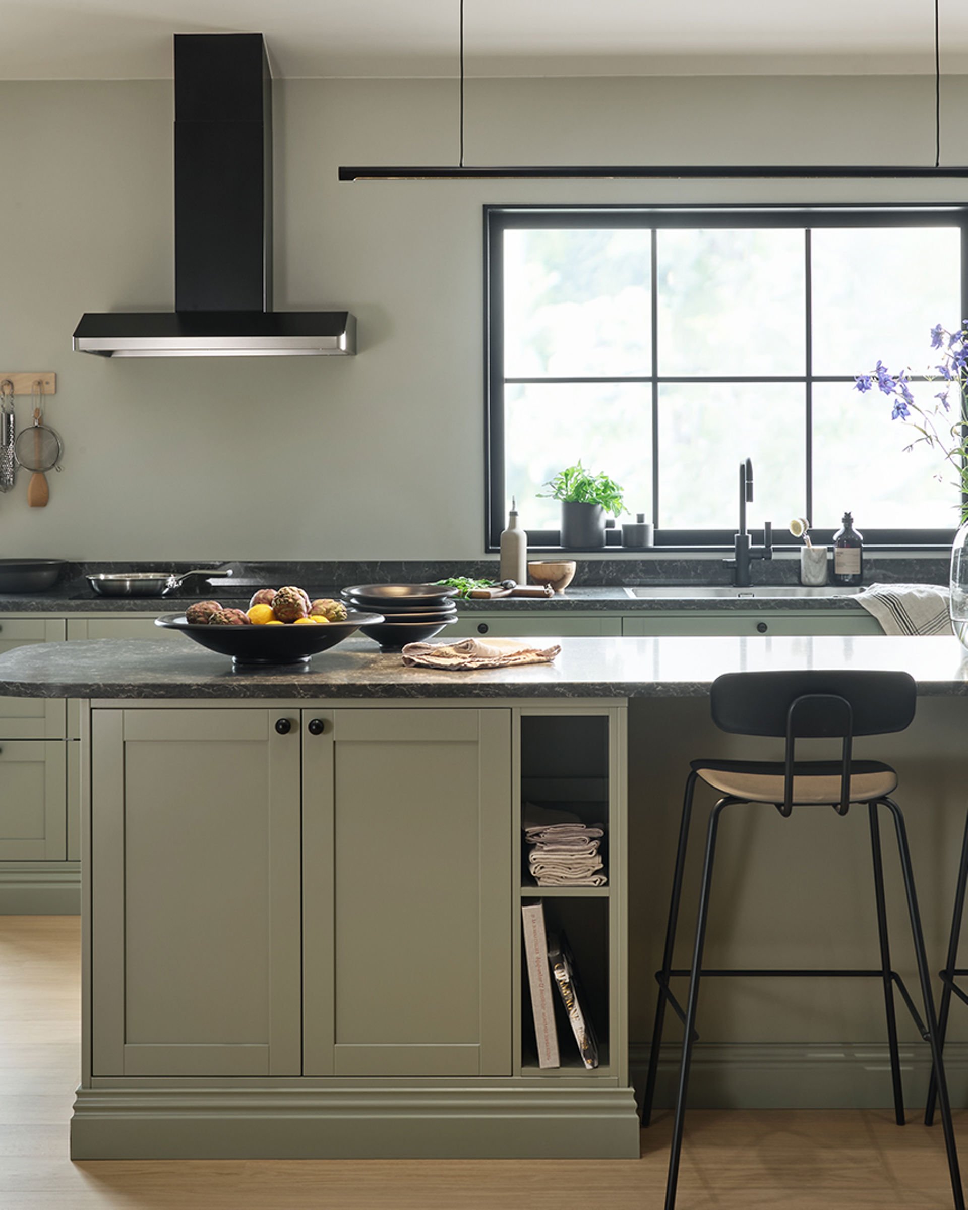 Högt i tak med generösa ytor och ramluckan Edit i kulören dimgrön. Köket har ett klassiskt uttryck med moderna inslag – ramluckans lite smalare ram, distinkta detaljer i svart, öppen förvaring i vitpigmenterad ek och lätt rundad köksö. Den framdragna sockeln med allmogeprofil skapar en platsbyggd känsla och vitrinskåpen blir ett fint blickfång.