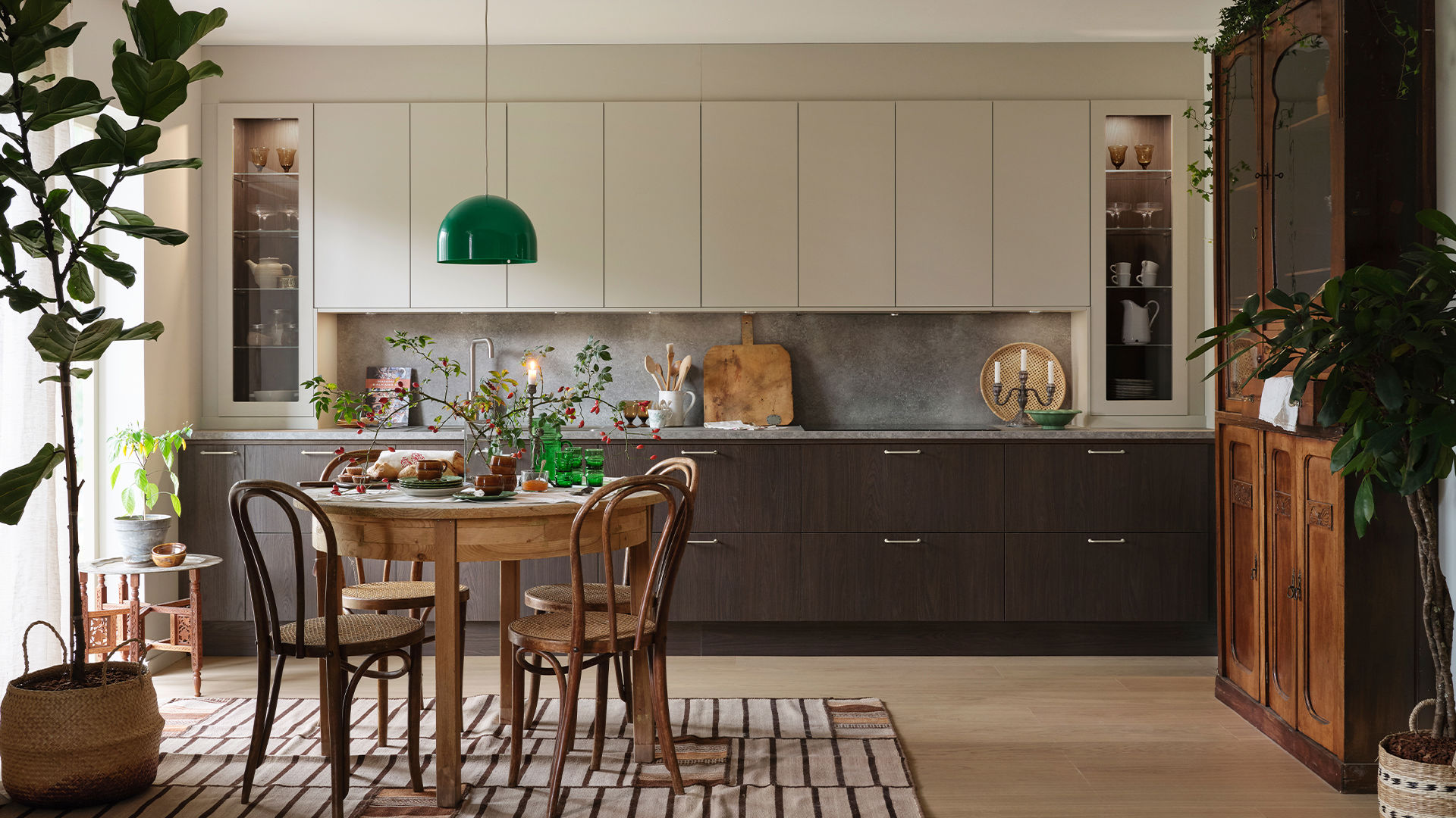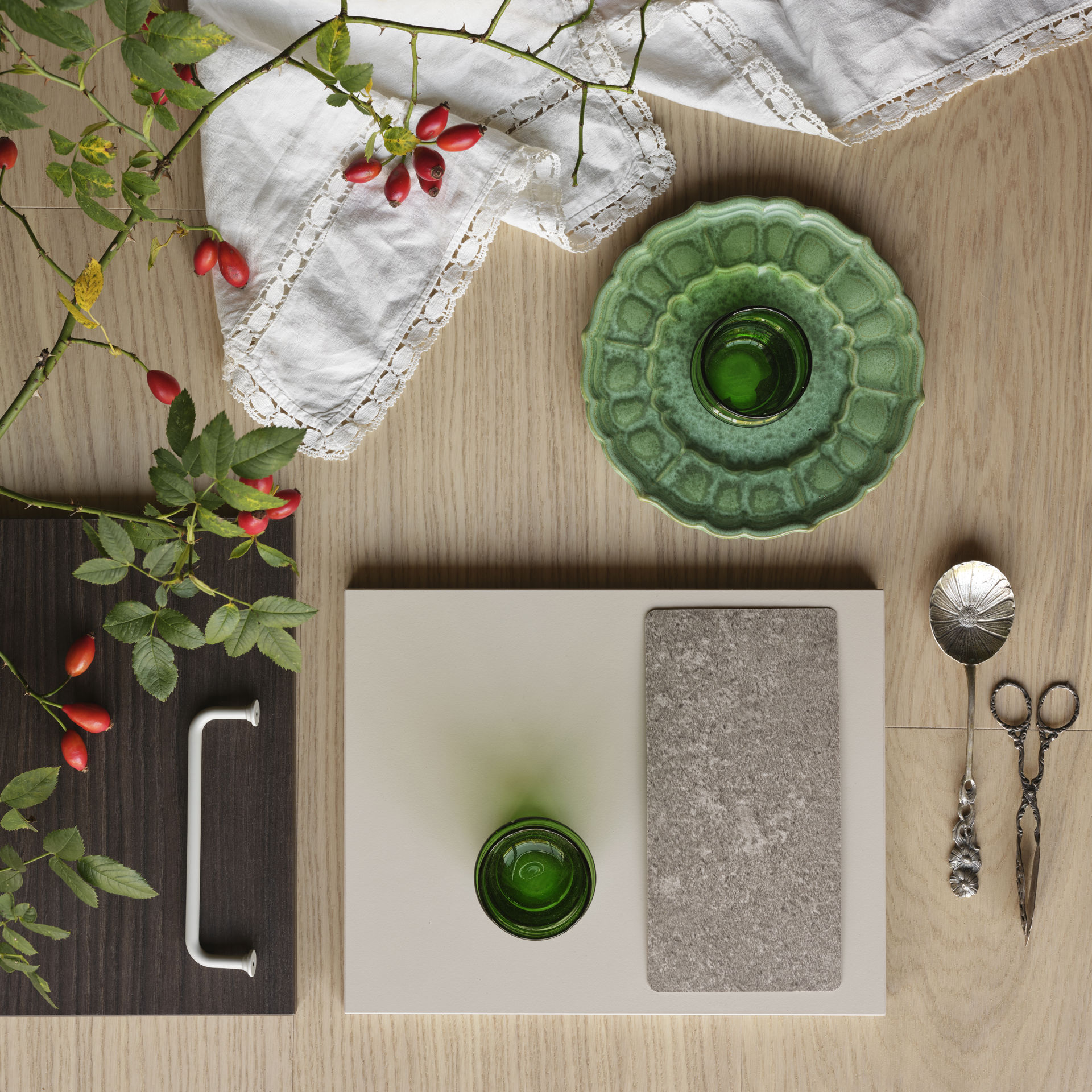 I det här moderna köket har vi skapat en varm och trivsam miljö med älskade, vackra gamla ting, växter och matchande gröna detaljer. Den nya Svanenmärkta melaminluckan Ilse beige och Ilse brun ek förstärker den mjuka och naturliga känslan. Två bänkvitrinvitrinskåp ramar in helheten och ger plats att visa upp det du tycker om. Ett praktiskt och enkelt kök som är både tidlöst och hållbart.