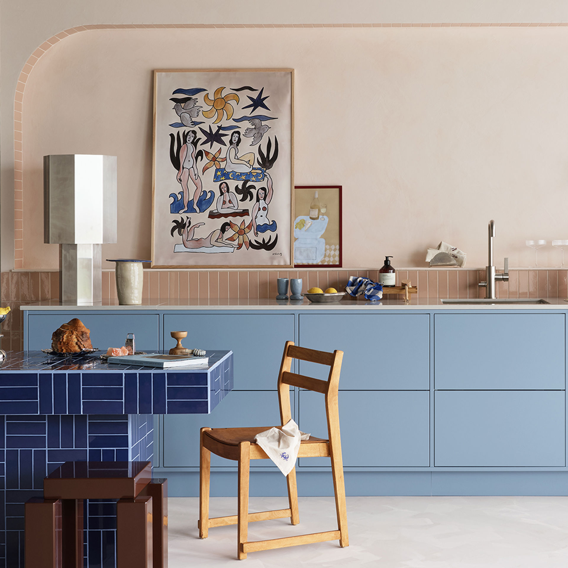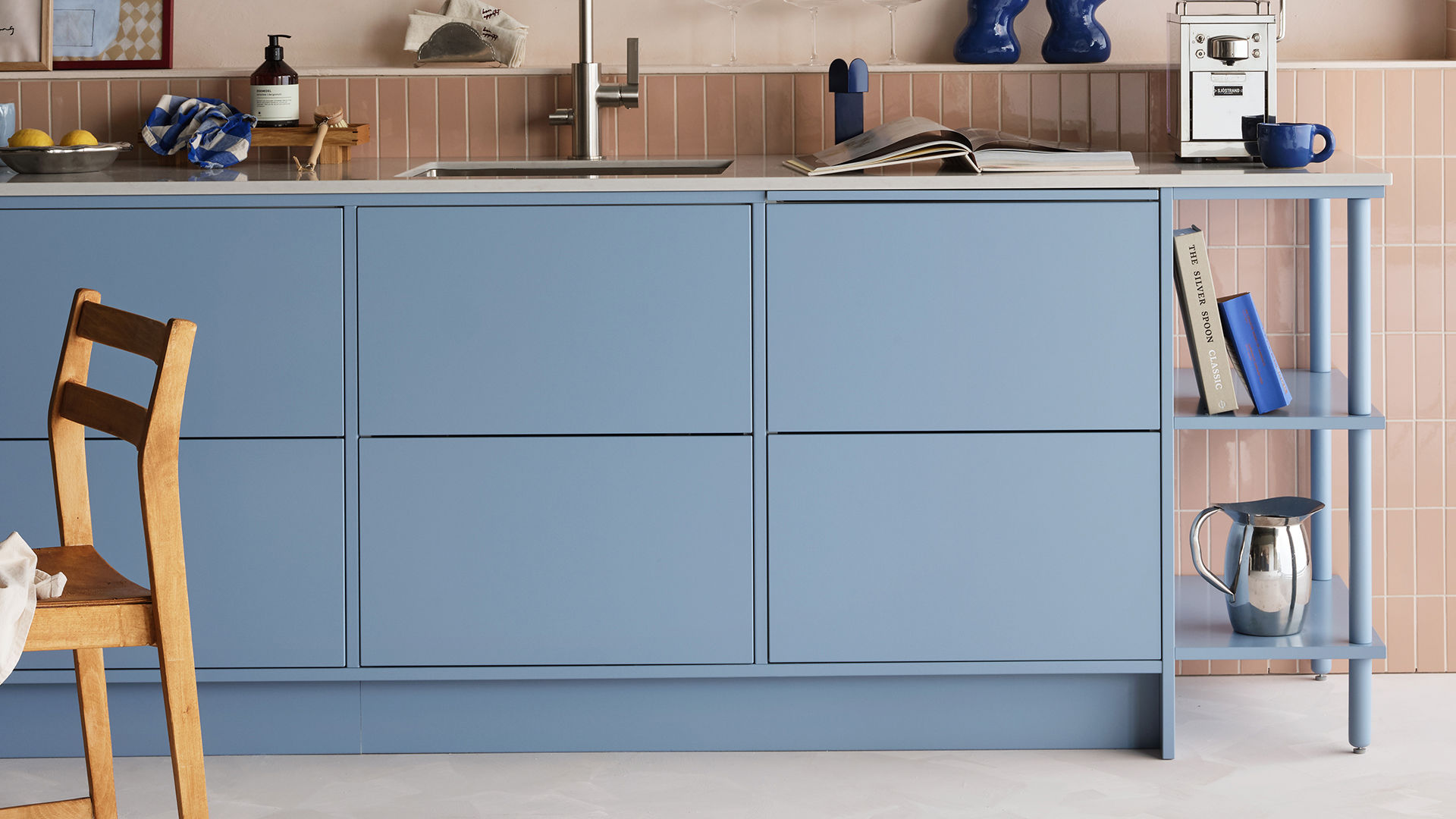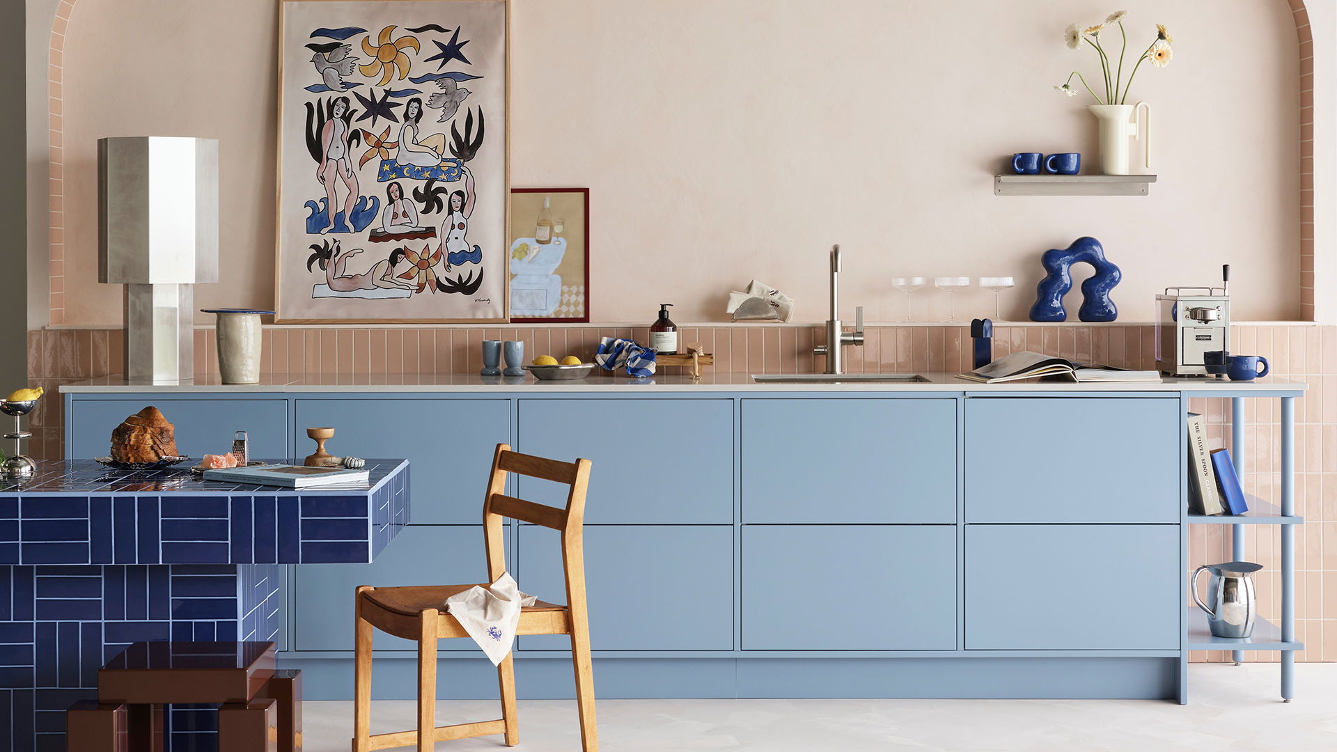 Det här är ett kök där vår kulör himmelsblå och det mättade persikofärgade kaklet är det omedelbara blickfånget. Den moderna stilen har här fått en lite mjuk och lättsam ton som förstärks av den rundade formen i valvet som ramar in miljön och bildar en vacker displayyta för personliga föremål. Vi har också adderat ett fint avslut på köket, hyllsystemet Vilda har blivit en riktig storfavorit.
