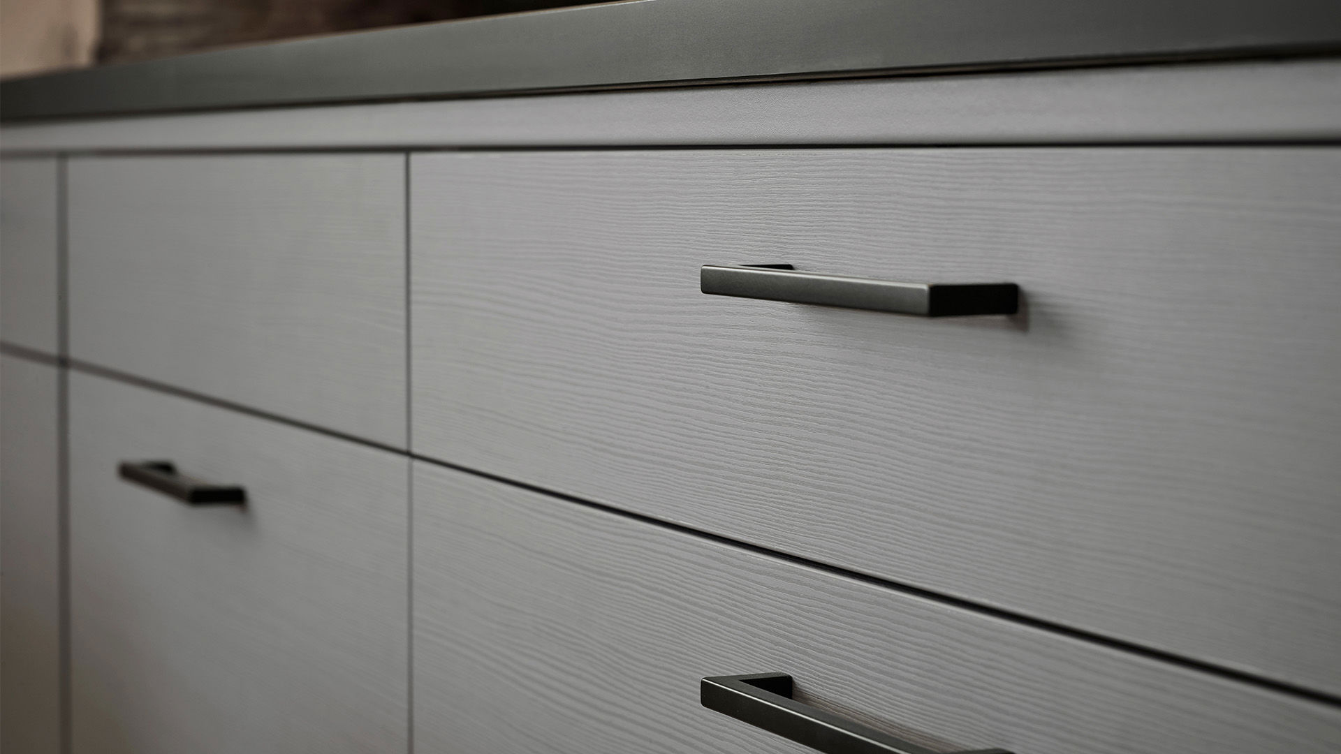 I det här moderna köket använder vi vår Svanenmärkta lucka Nora. Den är utvecklad för att minimera miljöpåverkan och har en tydlig livfull textur. I köket finns även en svart laminatbänkskiva, smart förvaring i form av bänkskåpsutdrag och ett städskåp. Svarta detaljer som handtag och hyllplan skapar ett distinkt uttryck.