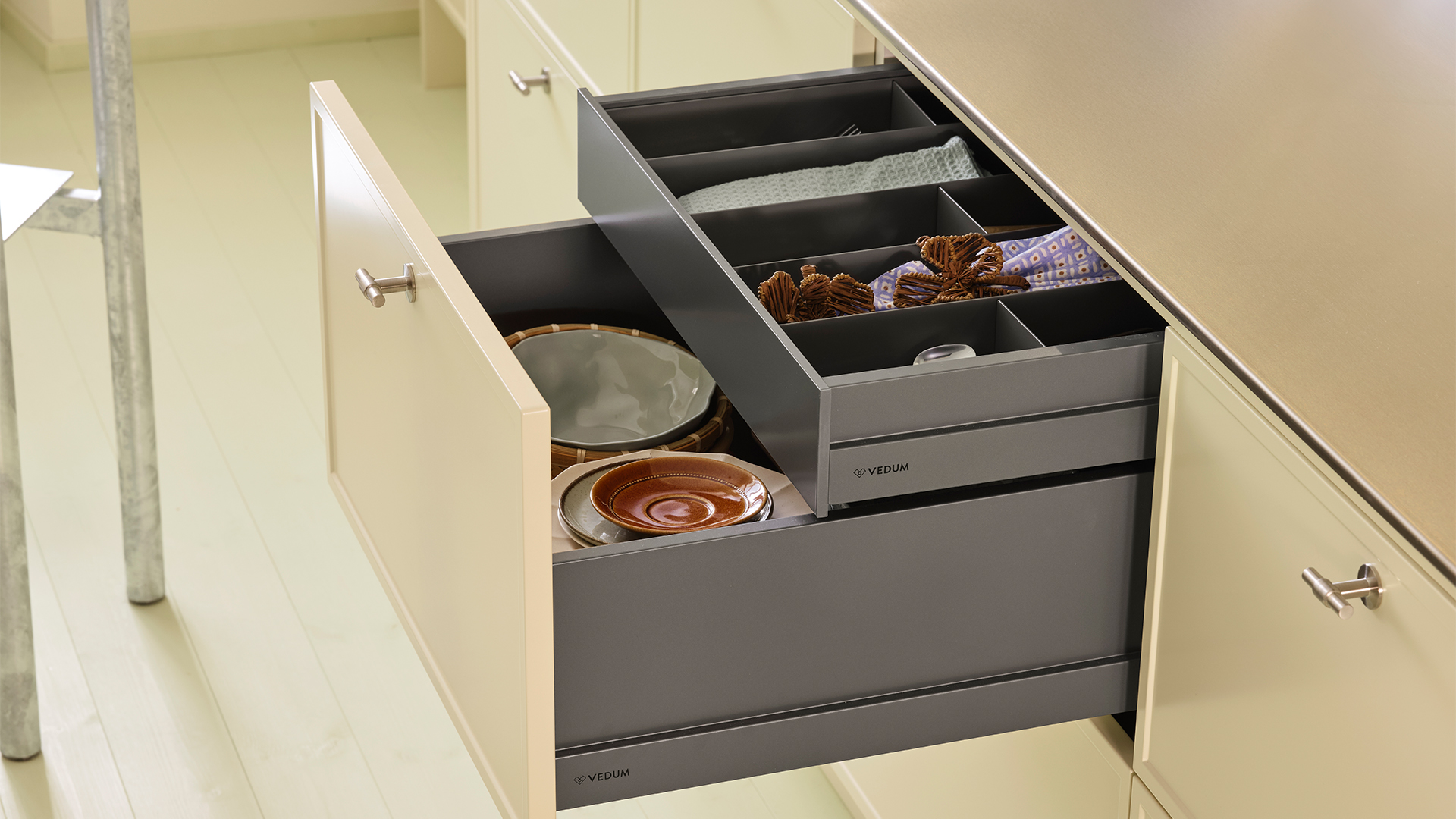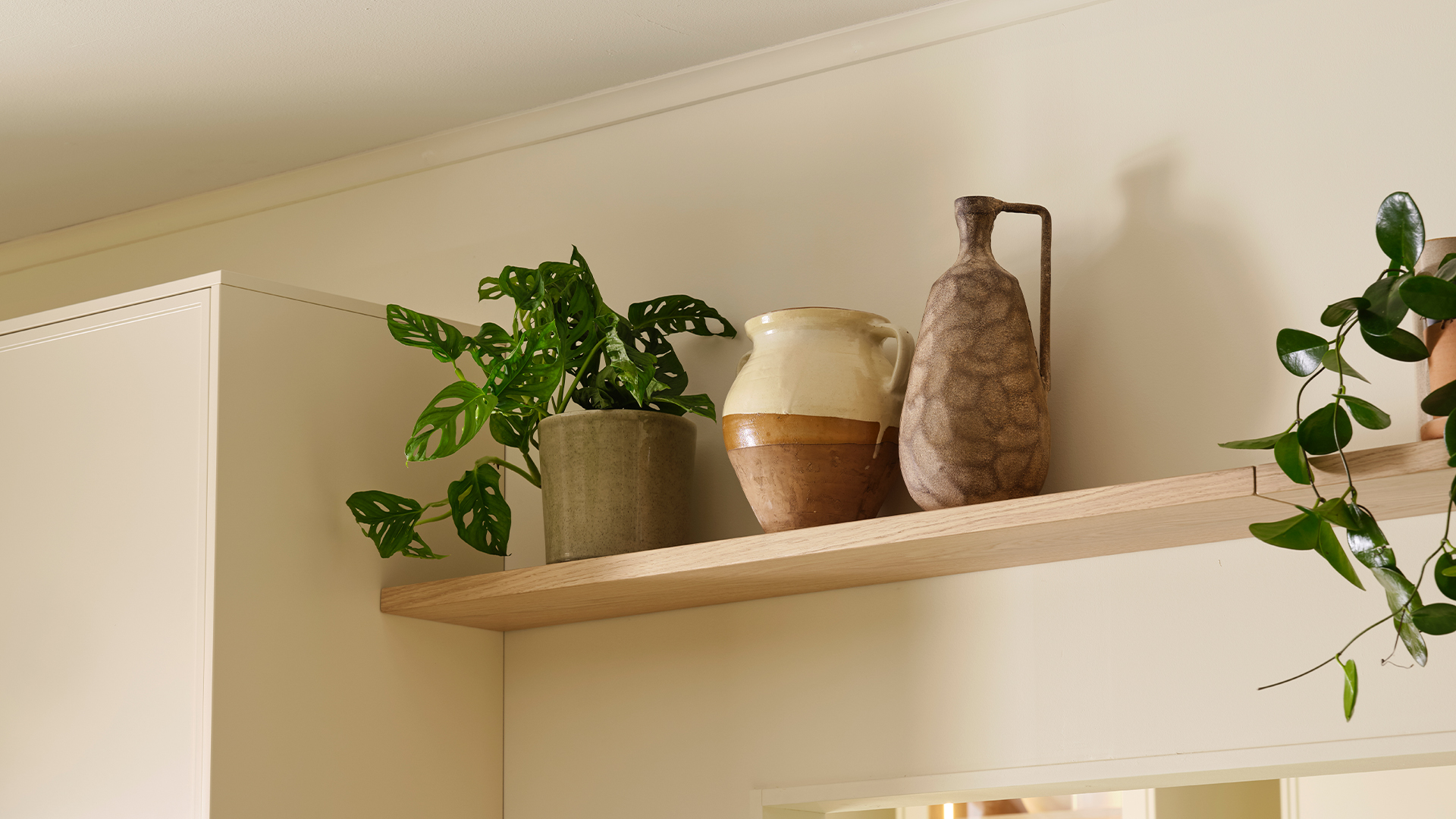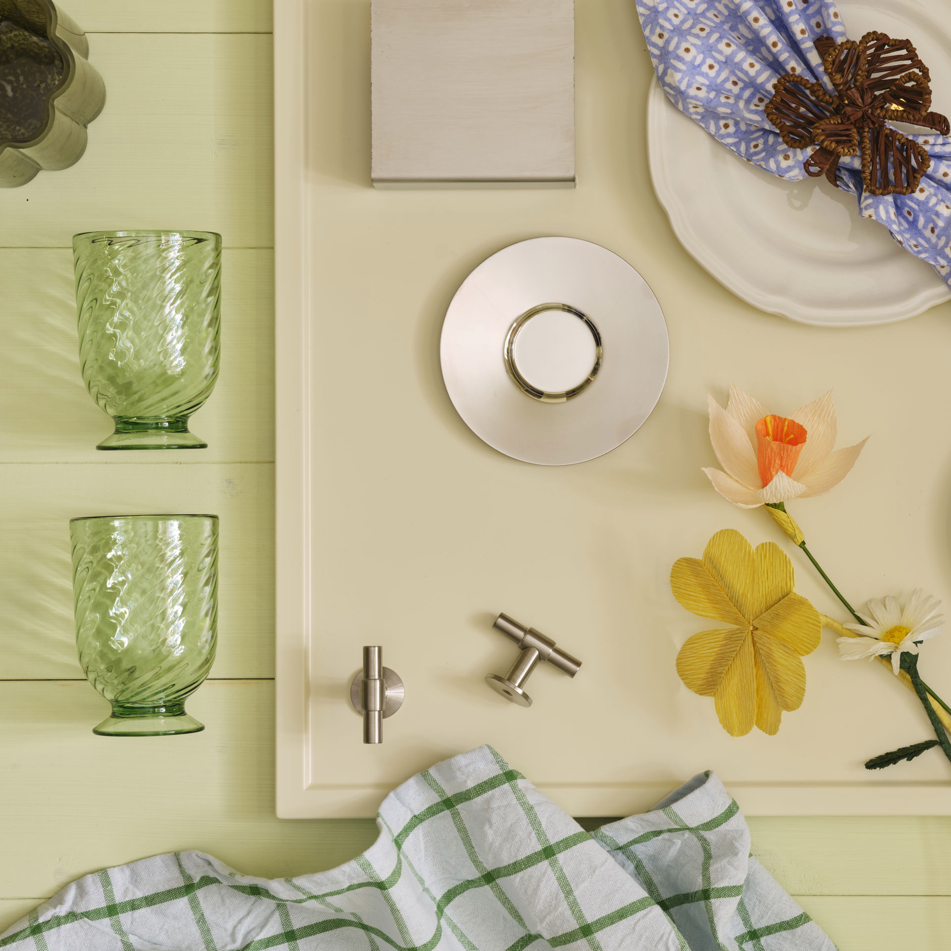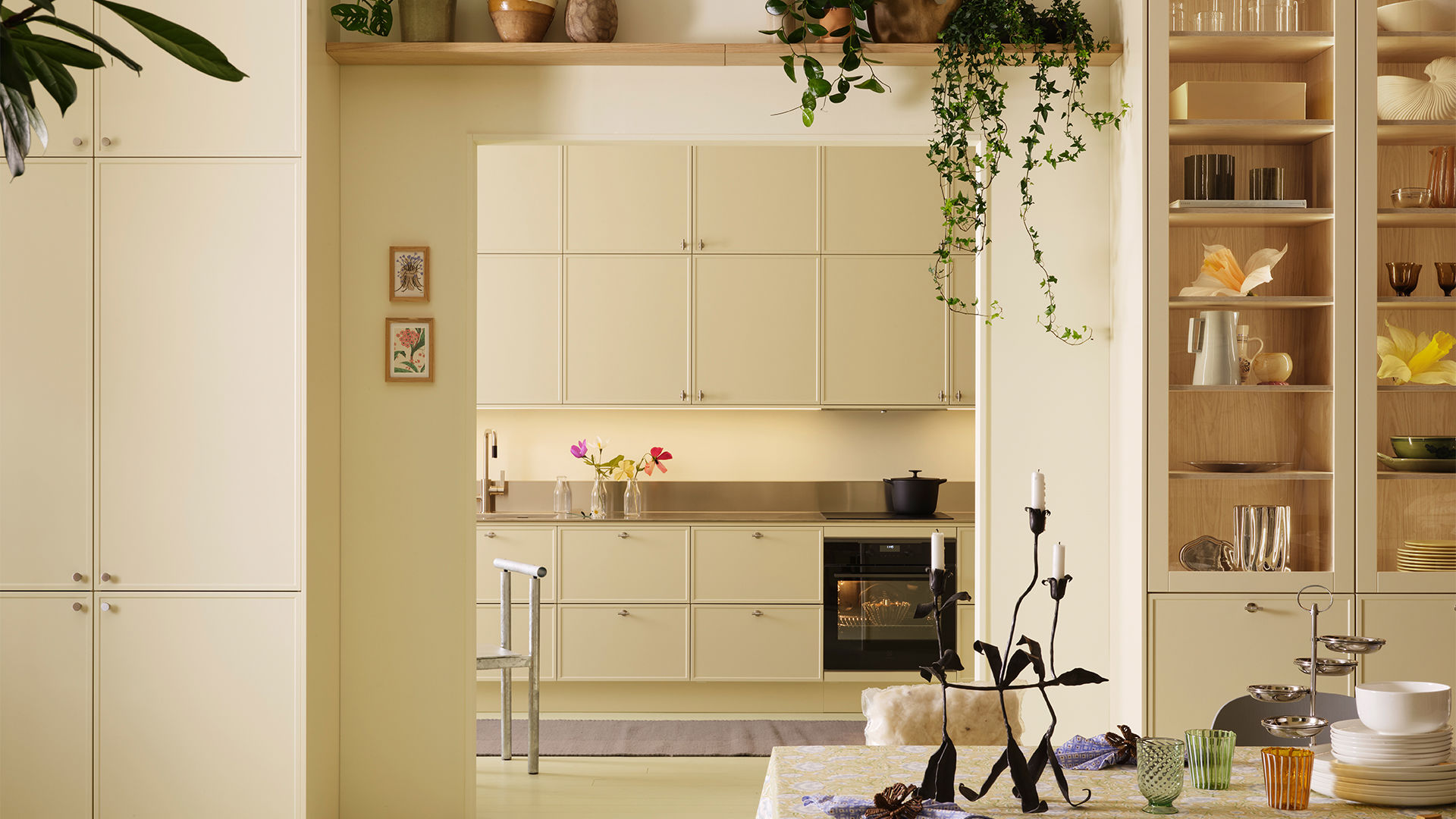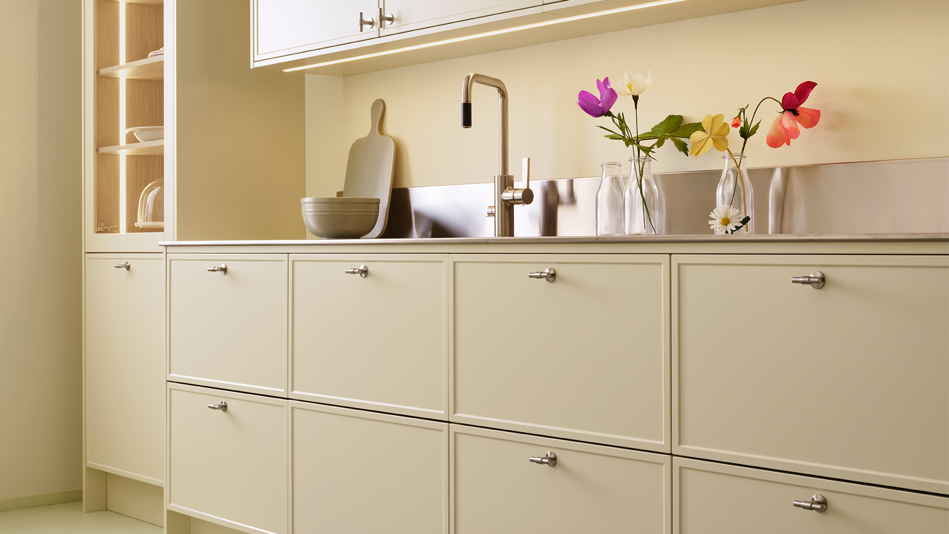 Vår nya kulör cremegul får det här solkyssta köket att stråla som i ett varmt morgonljus. Den nya luckan Thea med en smal, elegant ram skapar ett stilrent, arkitektoniskt uttryck. Materialmötet mellan rostfri diskbänk och vitpigmenterad ek inuti vitrinskåpen ger liv åt miljön. Ett soligt, fjäderlätt kök som andas både retro och framtid.